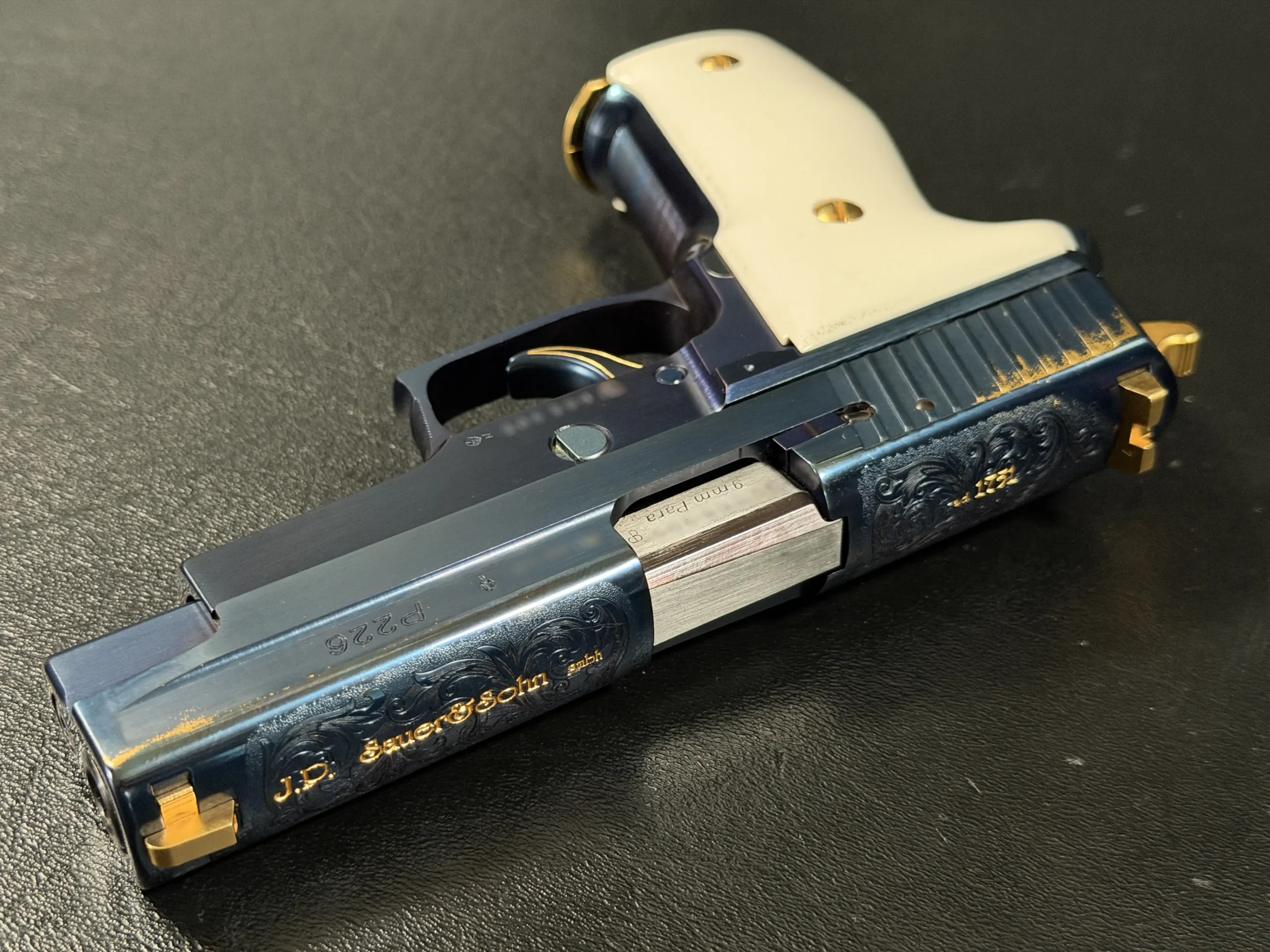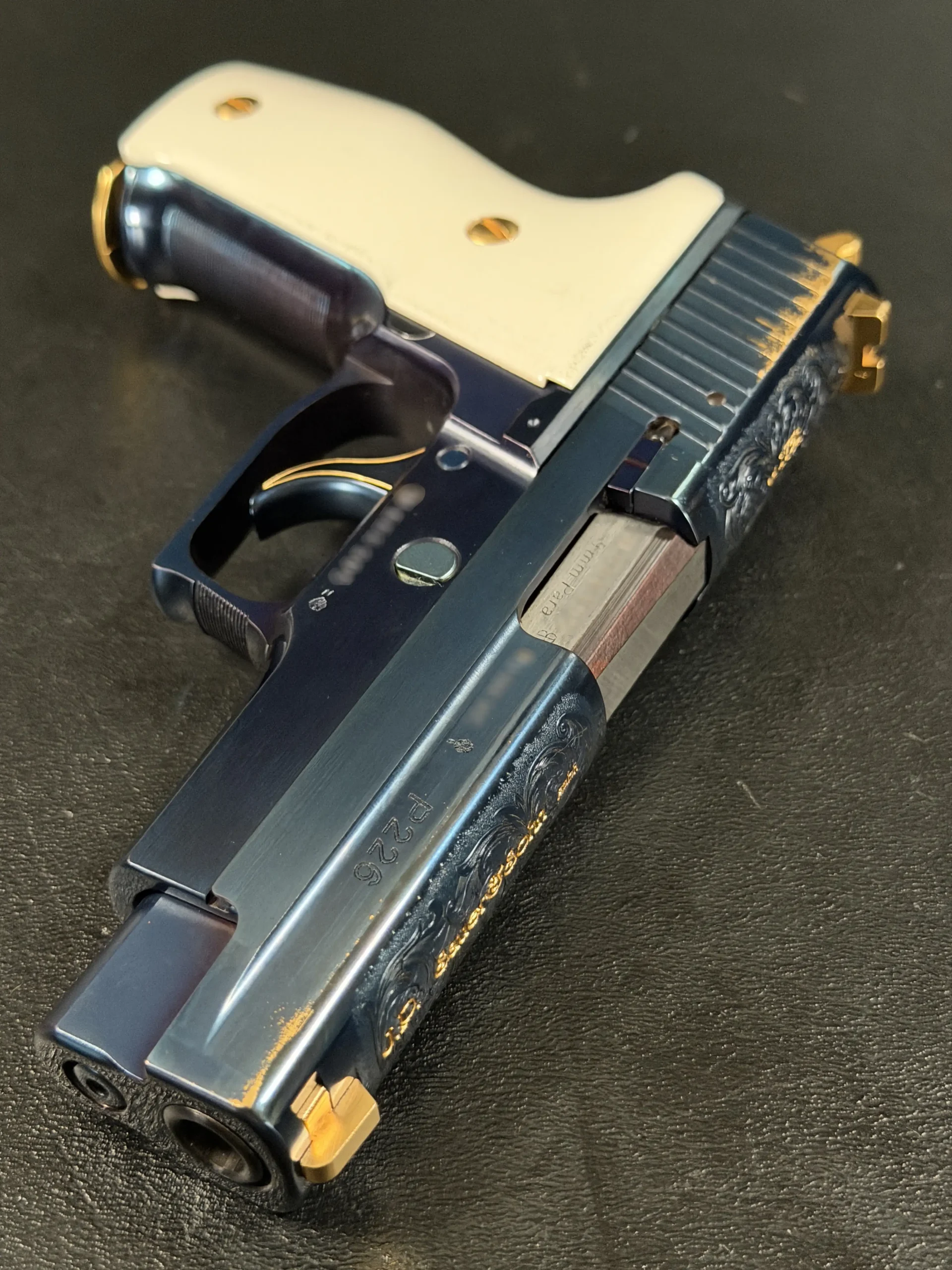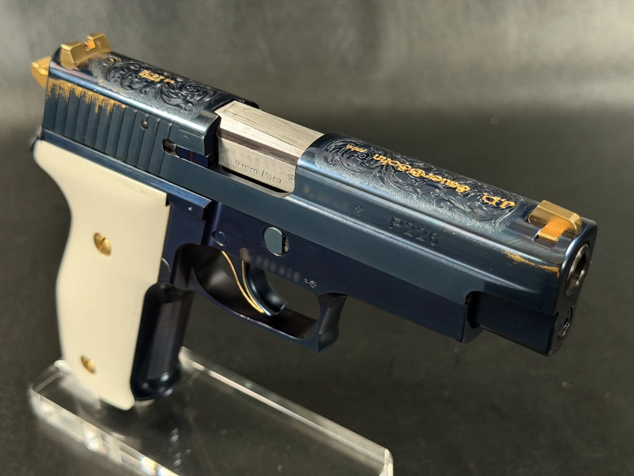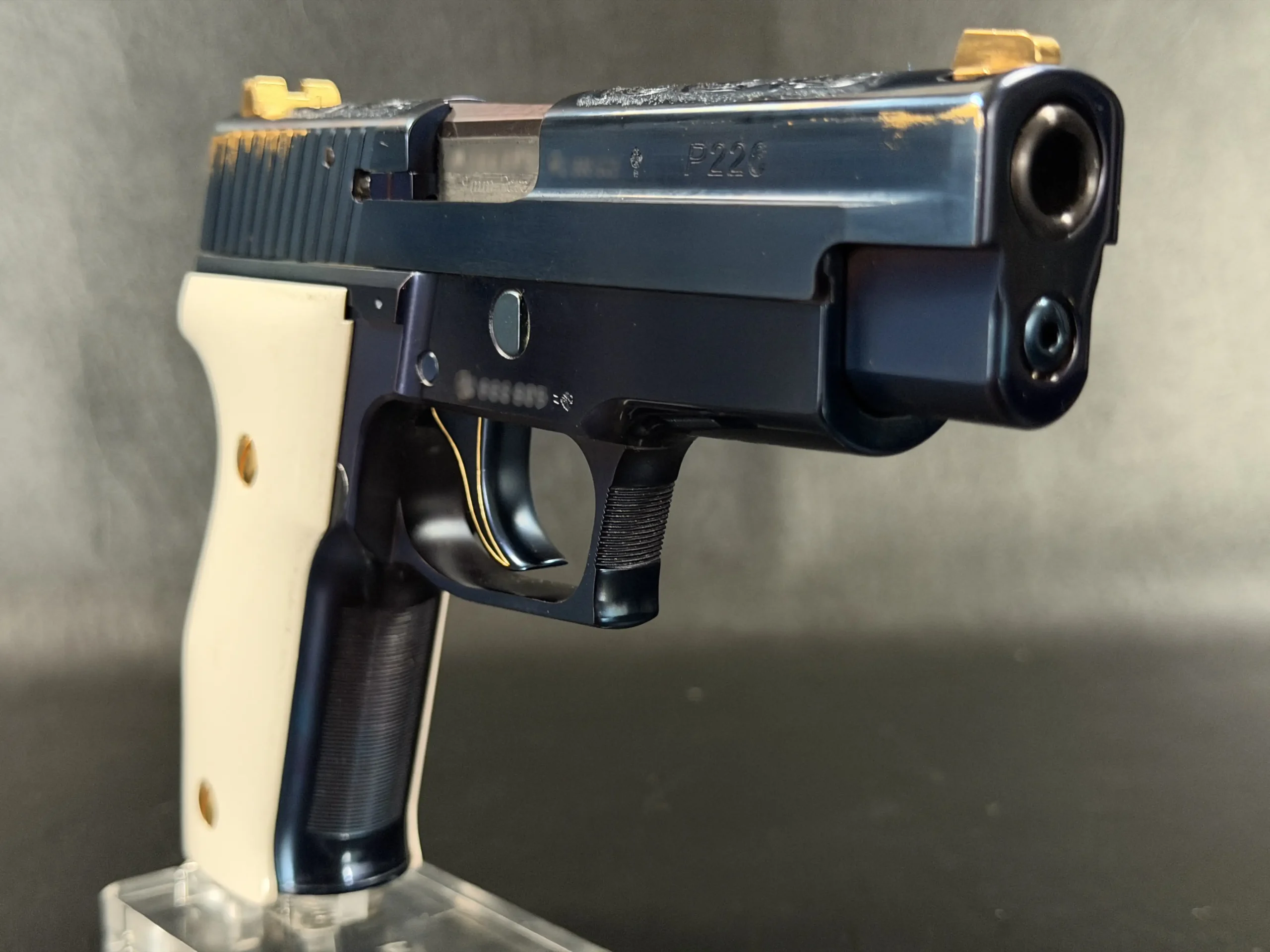 Built on the legendary P226 X-Five platform and chambered in 9mm, this example represents far more than performance; it is a deliberate expression of artistry. Finished in a deep, lustrous PVD blue, the pistol immediately commands attention. The surface treatment gives the steel a rich, almost liquid appearance, shifting subtly in tone depending on the light, an effect that photographs never fully capture.