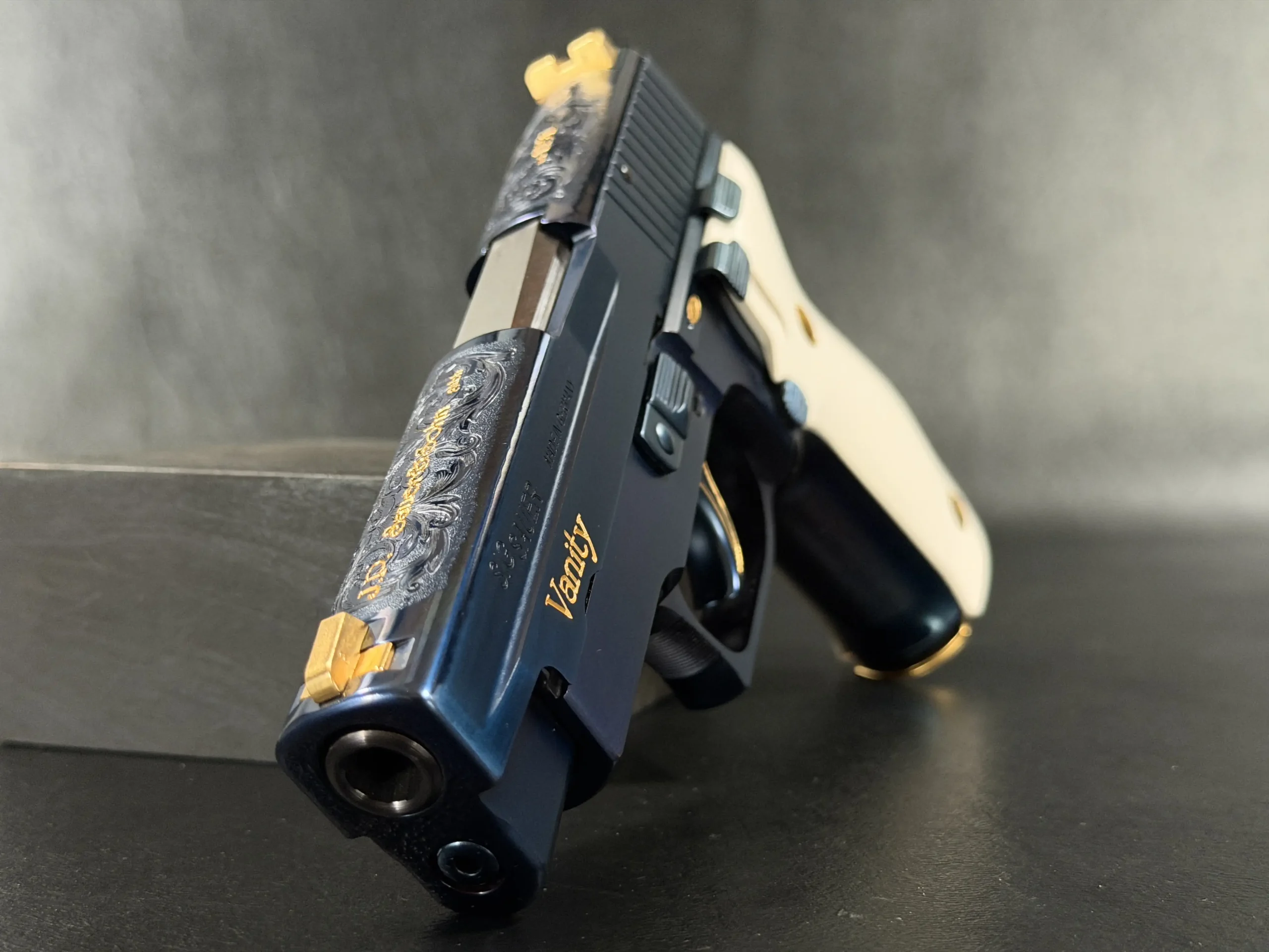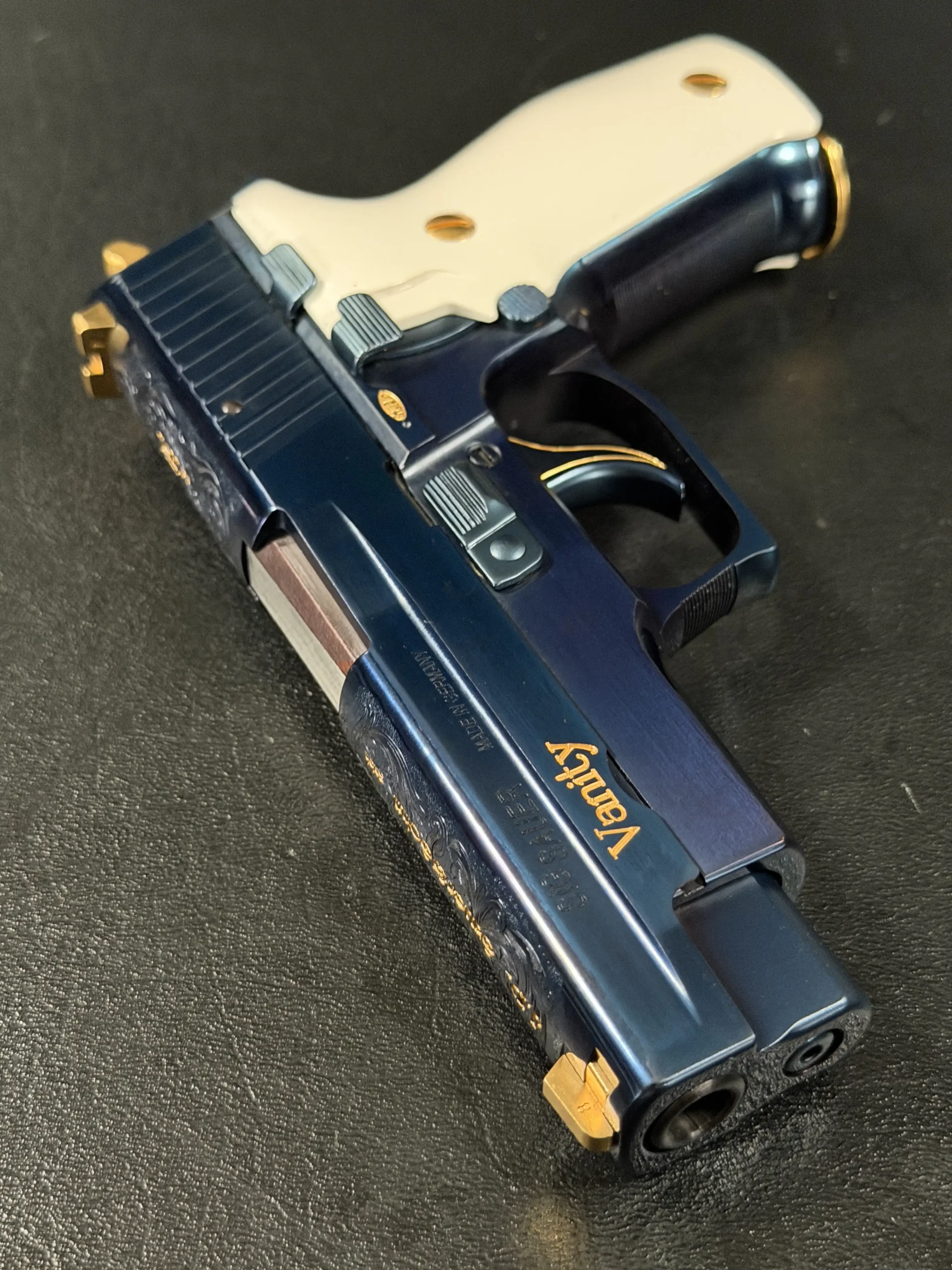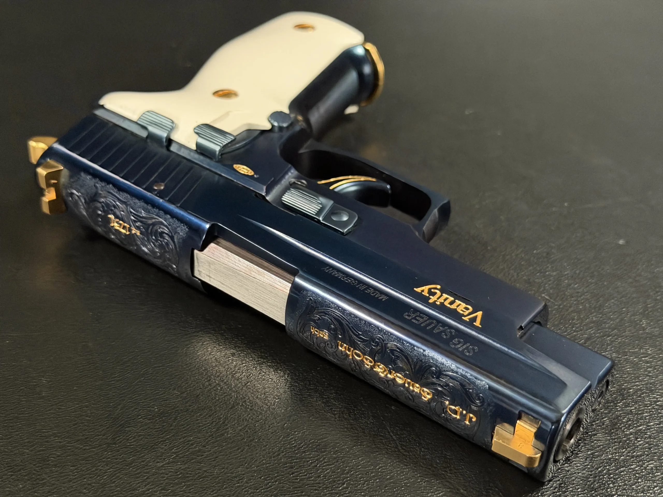 What truly defines the “Vanity” is its level of detail. The slide features intricate hand-engraved scrollwork, executed with a level of refinement rarely seen outside of bespoke European firearms. Gold inlays accentuate the design, including the bold “Vanity” script along the slide and the classic “J.P. Sauer & Sohn GmbH” marking, both rendered in warm contrast against the deep blue finish. Additional gold accents carry through the controls, screws, sights, and even the trigger outline, creating a cohesive and unmistakably luxurious aesthetic.