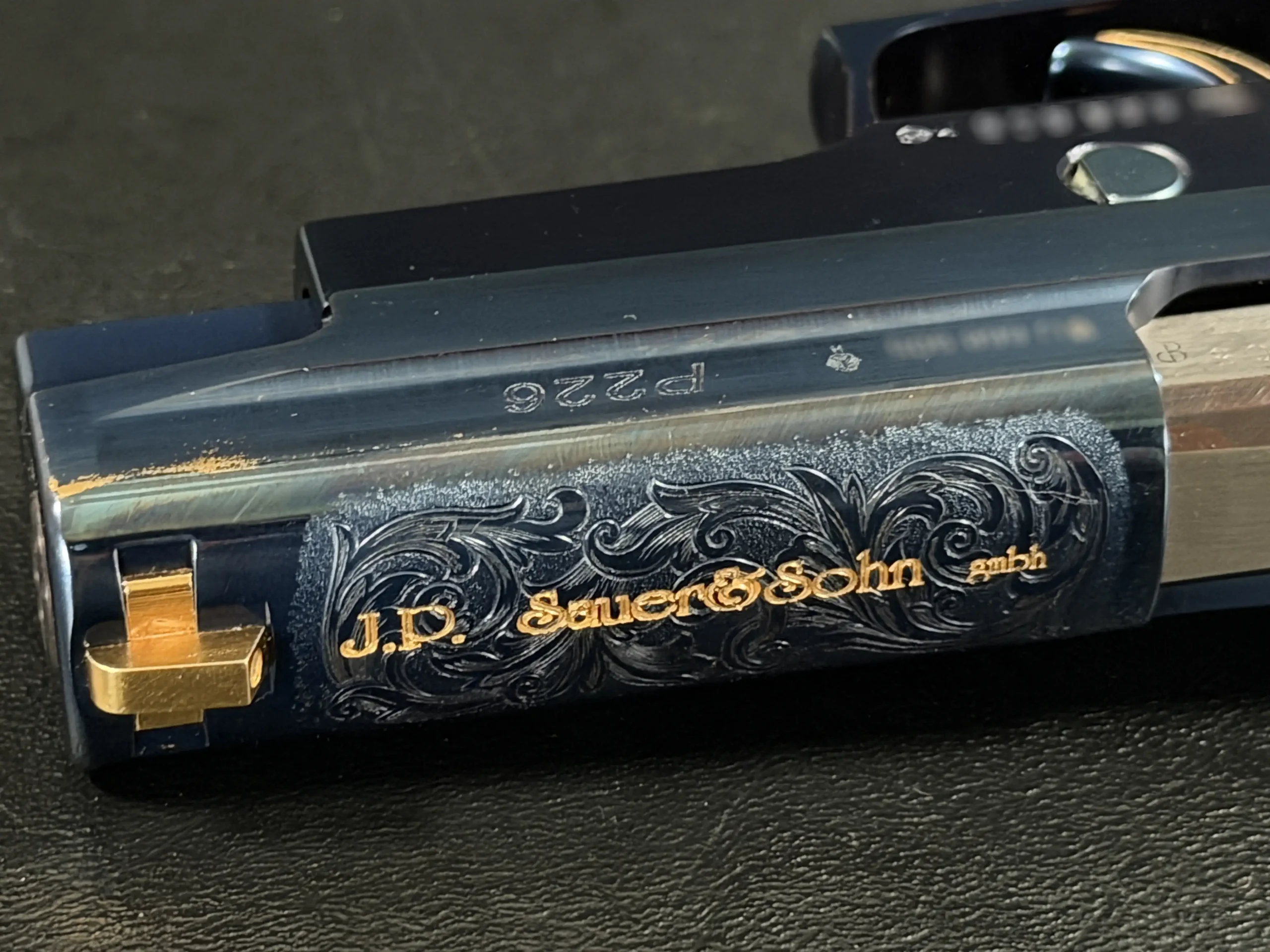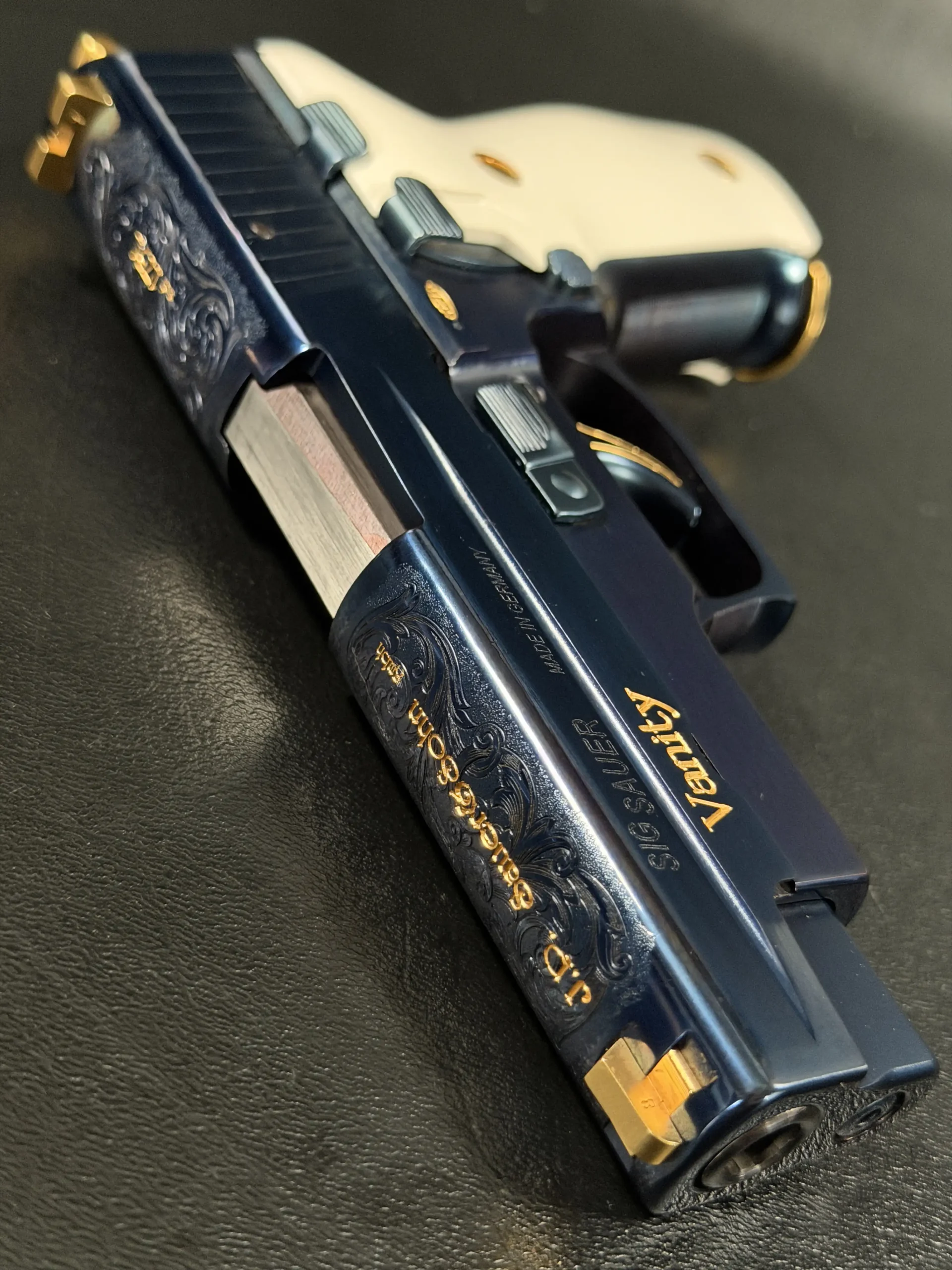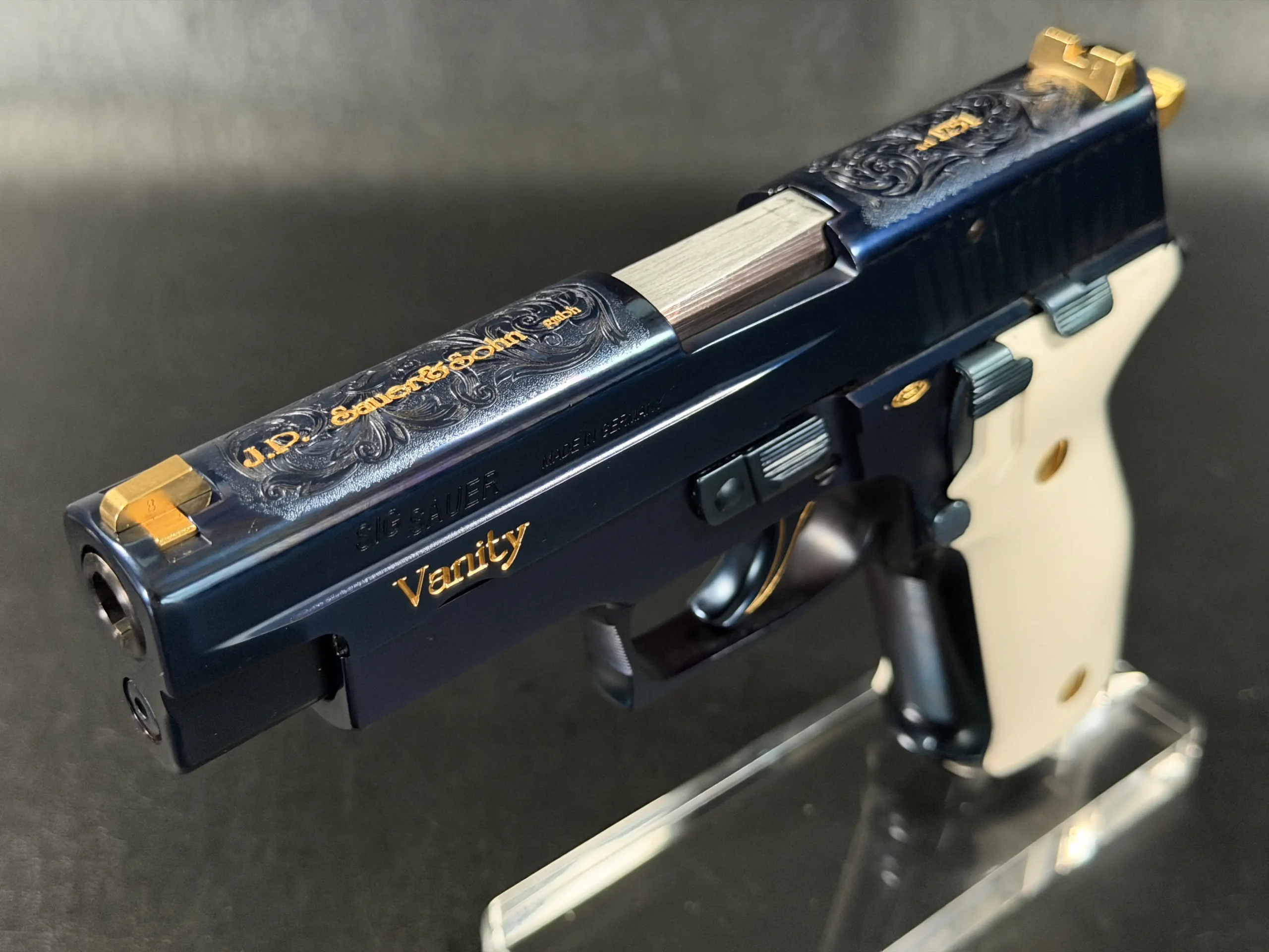 What truly defines the “Vanity” is its level of detail. The slide features intricate hand-engraved scrollwork, executed with a level of refinement rarely seen outside of bespoke European firearms. Gold inlays accentuate the design, including the bold “Vanity” script along the slide and the classic “J.P. Sauer & Sohn GmbH” marking, both rendered in warm contrast against the deep blue finish. Additional gold accents carry through the controls, screws, sights, and even the trigger outline, creating a cohesive and unmistakably luxurious aesthetic.