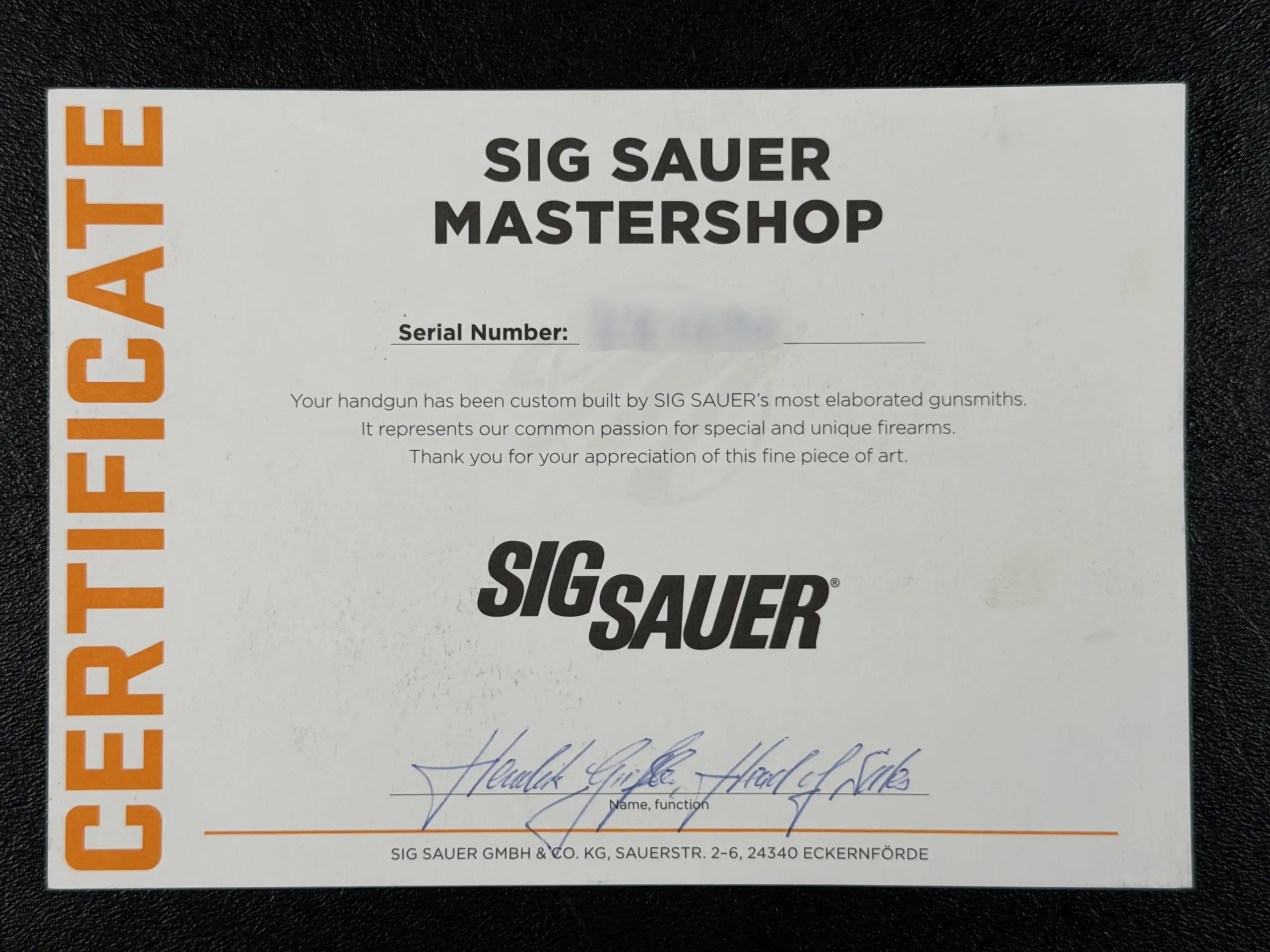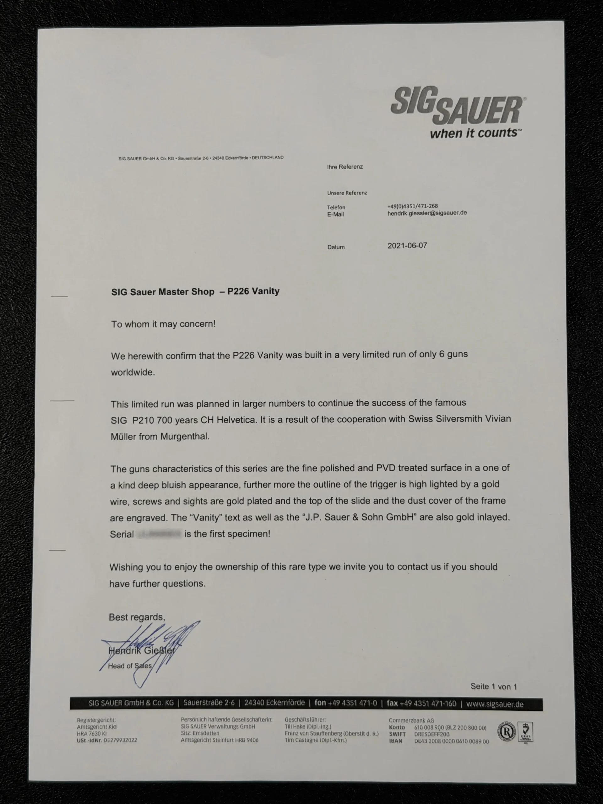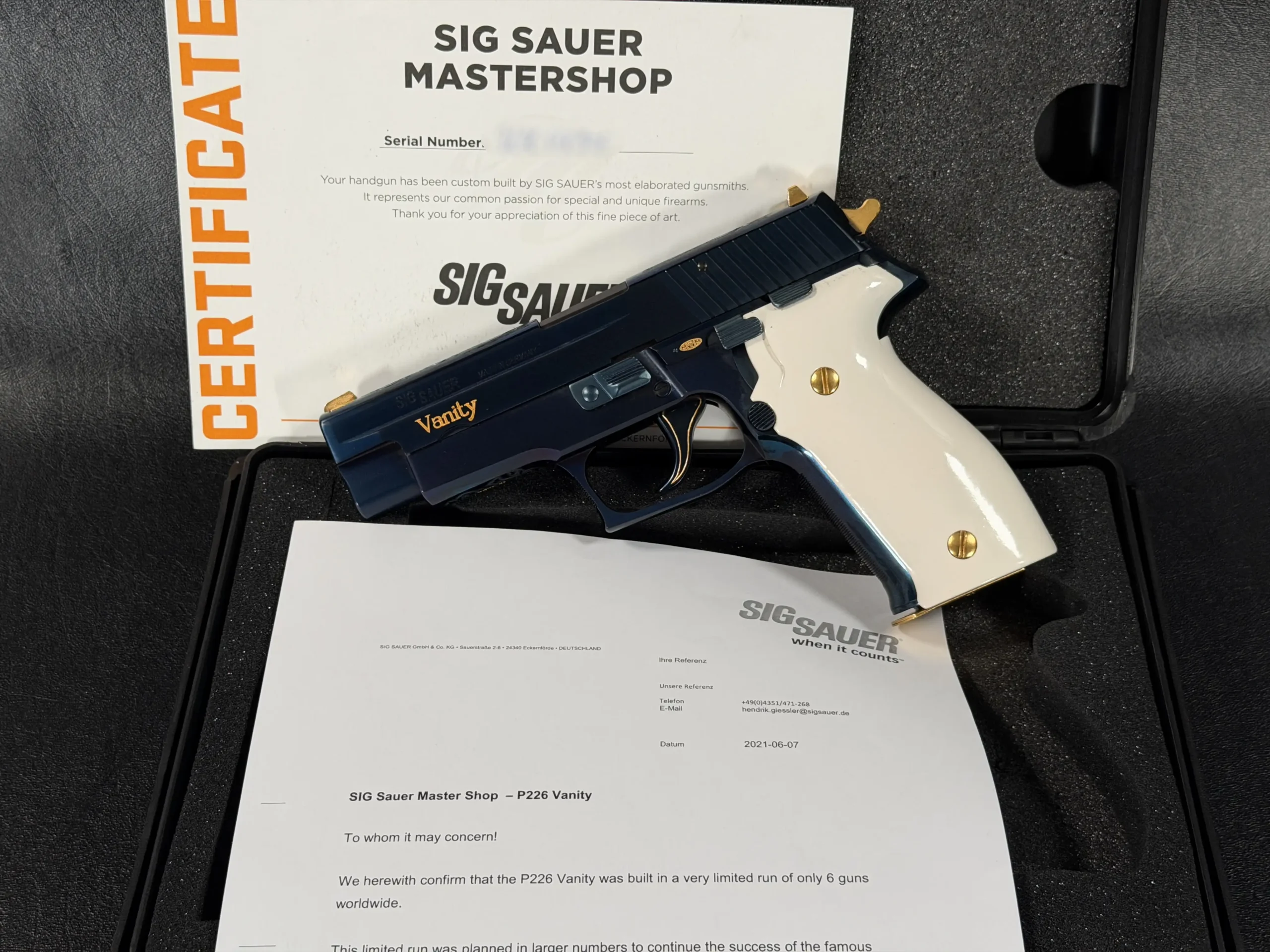 According to accompanying factory documentation, the P226 “Vanity” was produced in an extremely limited run of just six pistols worldwide. Originally envisioned as part of a broader continuation of commemorative Mastershop work inspired by earlier Swiss collaborations, production remained exceptionally constrained, making surviving examples highly sought after by collectors.