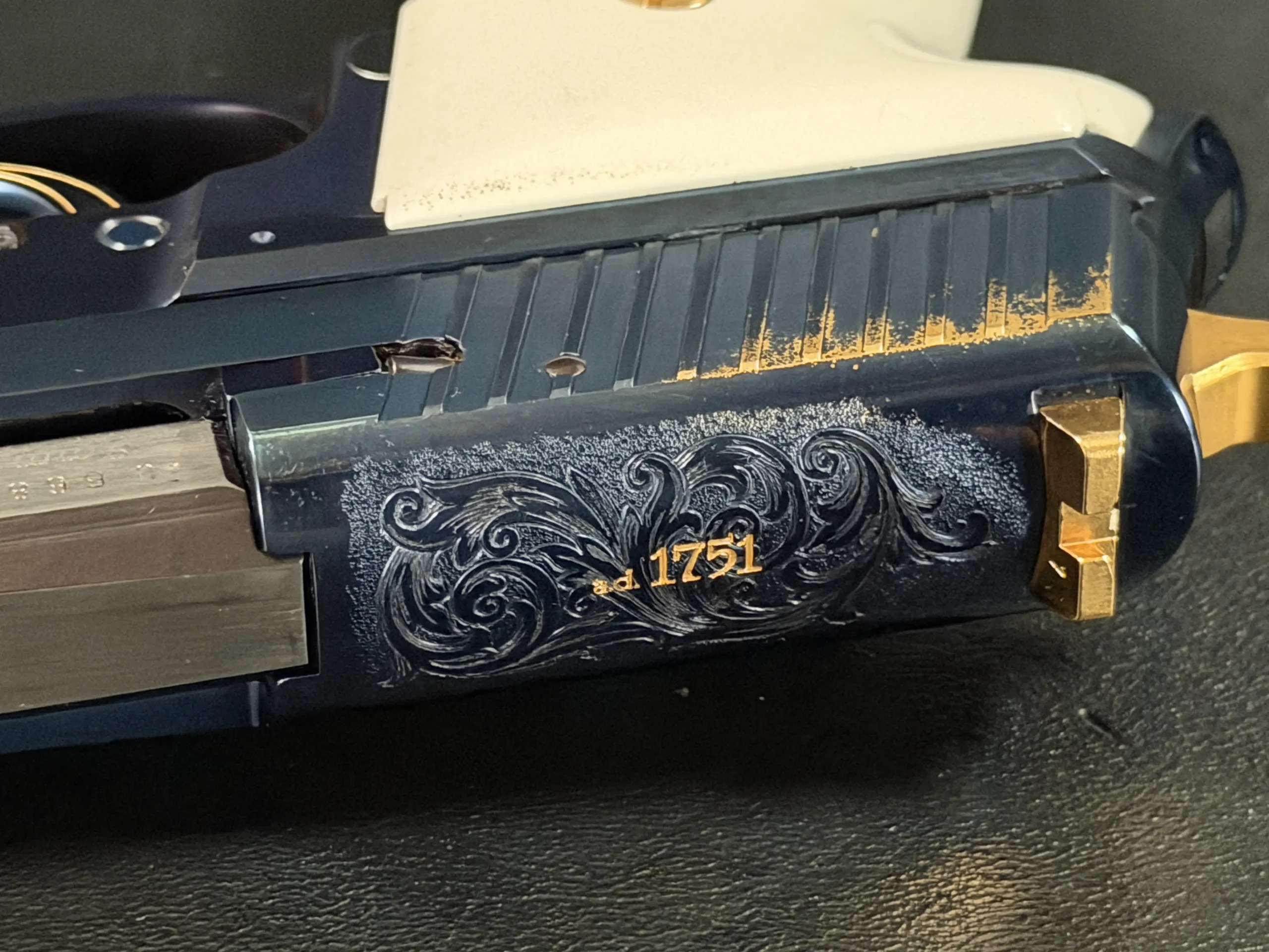 The grips further elevate the presentation. Finished in a striking ivory tone, they provide a dramatic visual contrast to the darkened steel while maintaining the clean, purposeful lines of the X-Five frame. The result is a pistol that feels equally at home in a display case or in the hands of a discerning shooter.