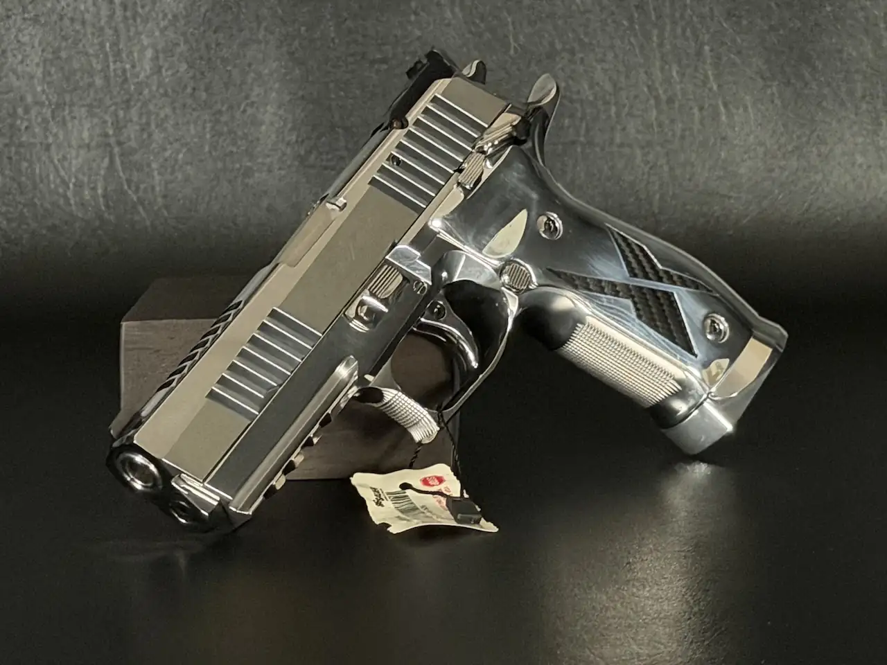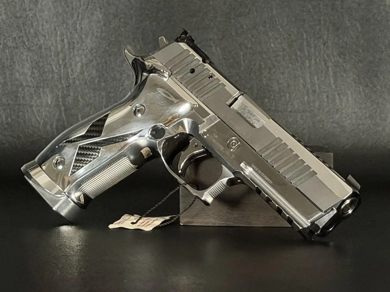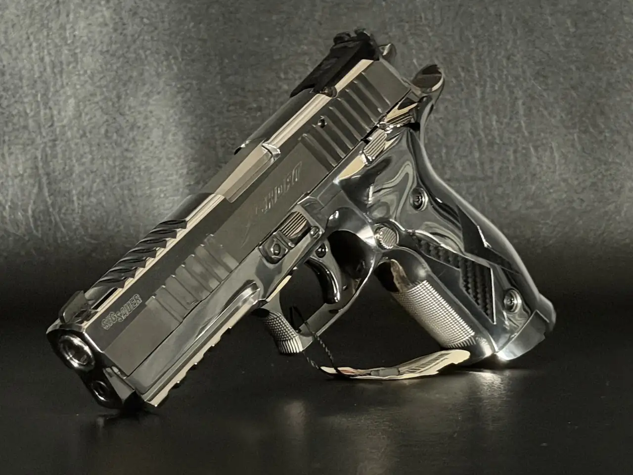 Chambered in 9mm, the X-Short features the shorter slide and barrel configuration that gives the pistol a more balanced, agile feel while retaining the rock-solid accuracy the P226 platform is known for. The high-polish chrome finish across the frame and slide surfaces creates a mirror-like depth, contrasted beautifully by carbon fiber grip panels that add both texture and modern flair. The result is a pistol that looks sculpted rather than assembled.