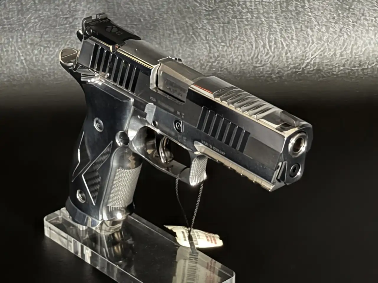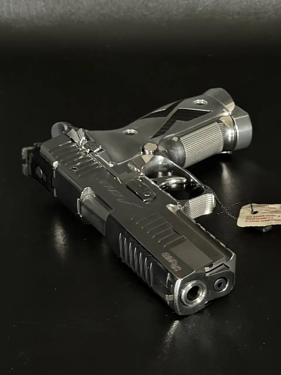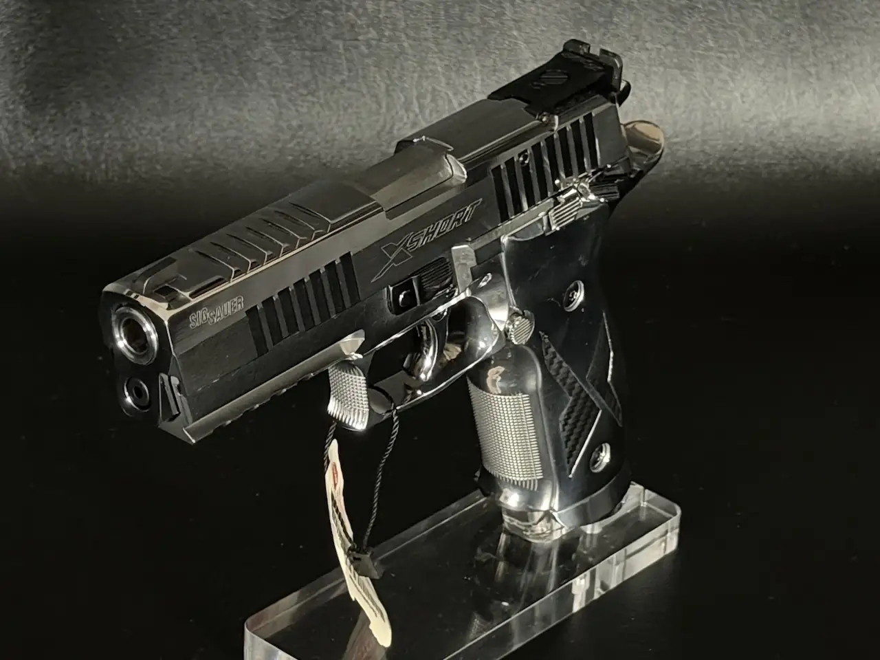 Chambered in 9mm, the X-Short features the shorter slide and barrel configuration that gives the pistol a more balanced, agile feel while retaining the rock-solid accuracy the P226 platform is known for. The high-polish chrome finish across the frame and slide surfaces creates a mirror-like depth, contrasted beautifully by carbon fiber grip panels that add both texture and modern flair. The result is a pistol that looks sculpted rather than assembled.
