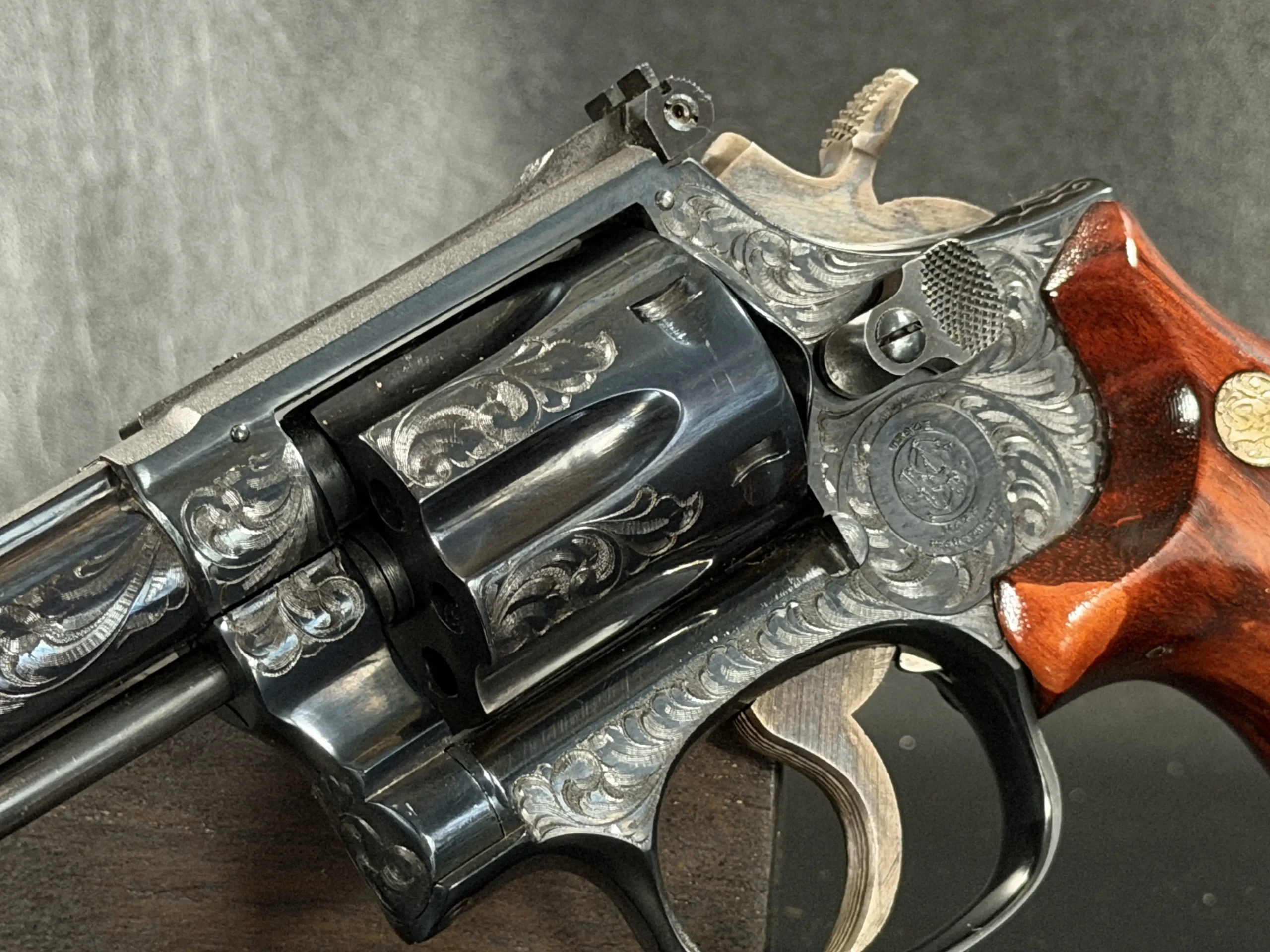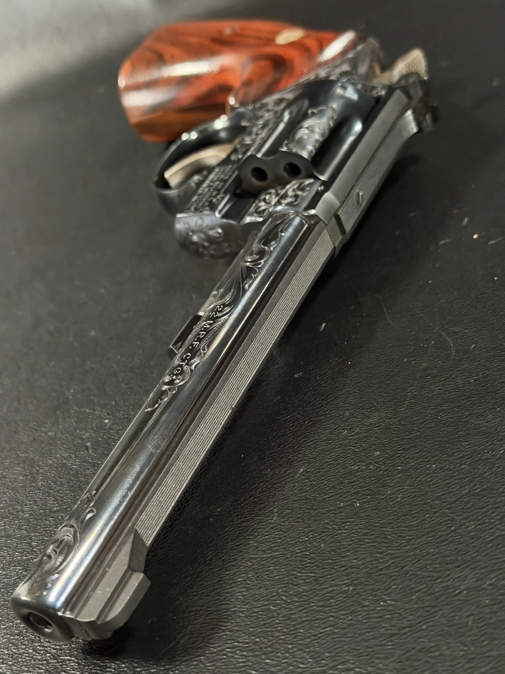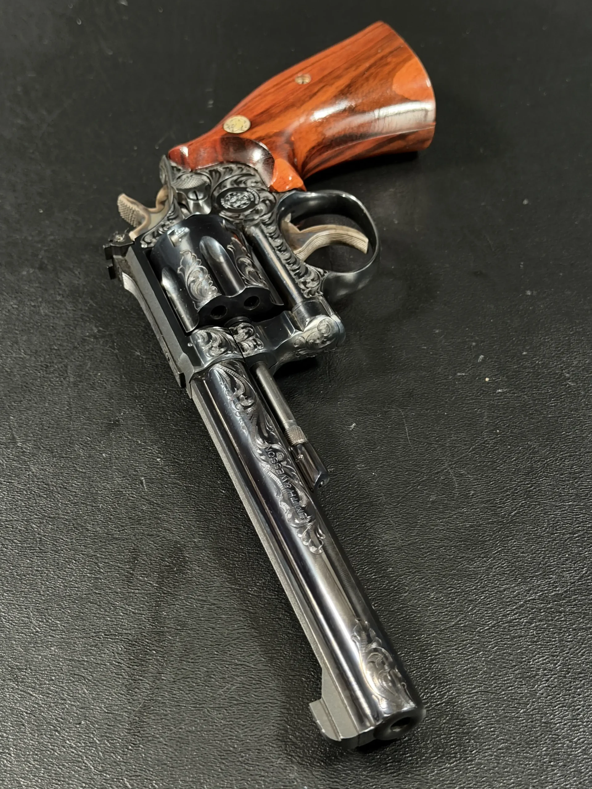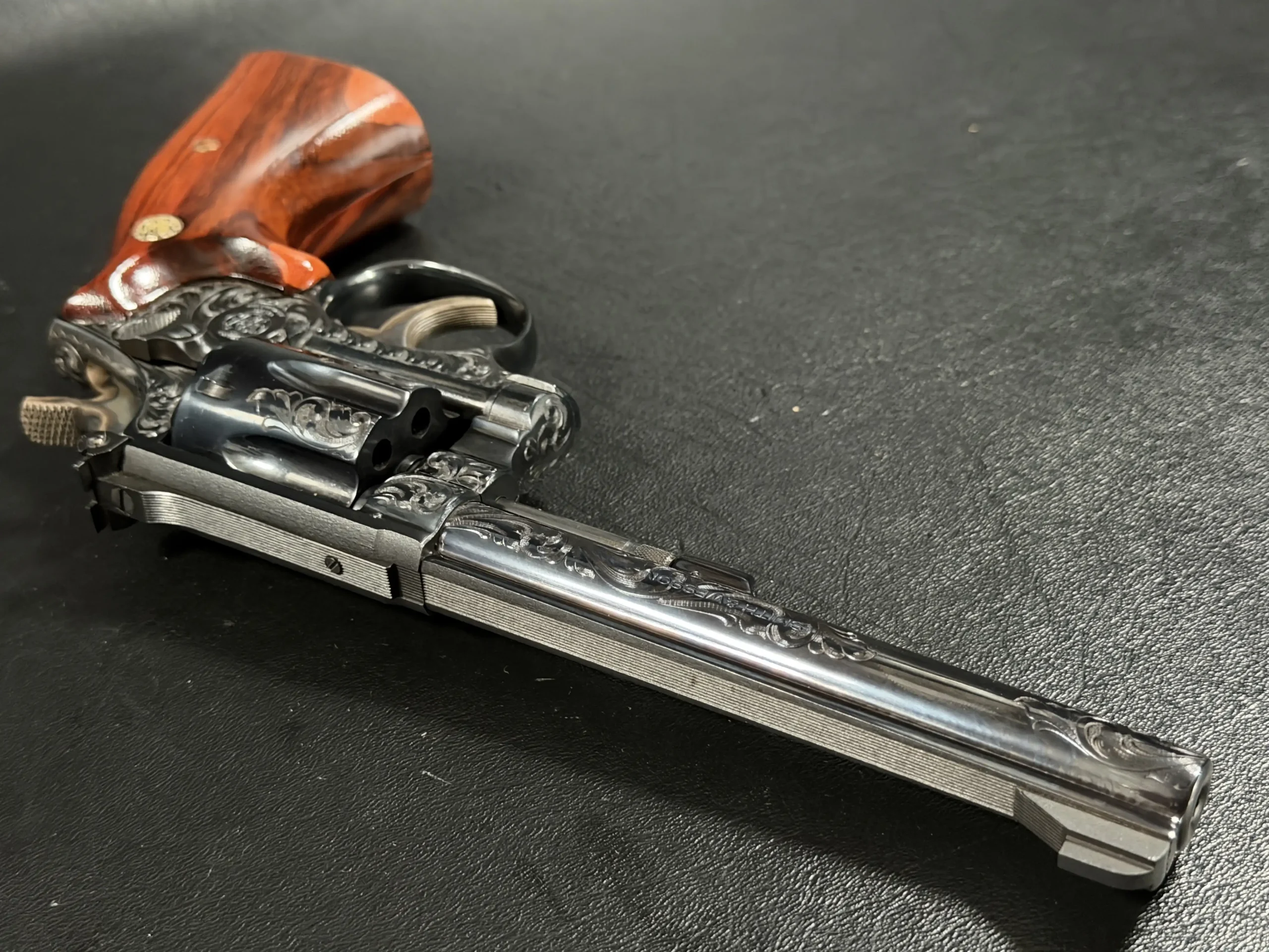 What immediately draws the eye is the factory engraving, executed with a confident hand and a restrained elegance. Flowing scrollwork moves seamlessly across the frame, cylinder, and barrel, catching light against the deep blued finish. It’s not overly ornate; it’s deliberate. The engraving complements the revolver’s lines rather than overpowering them, giving the piece a sense of cohesion that only factory work tends to achieve.