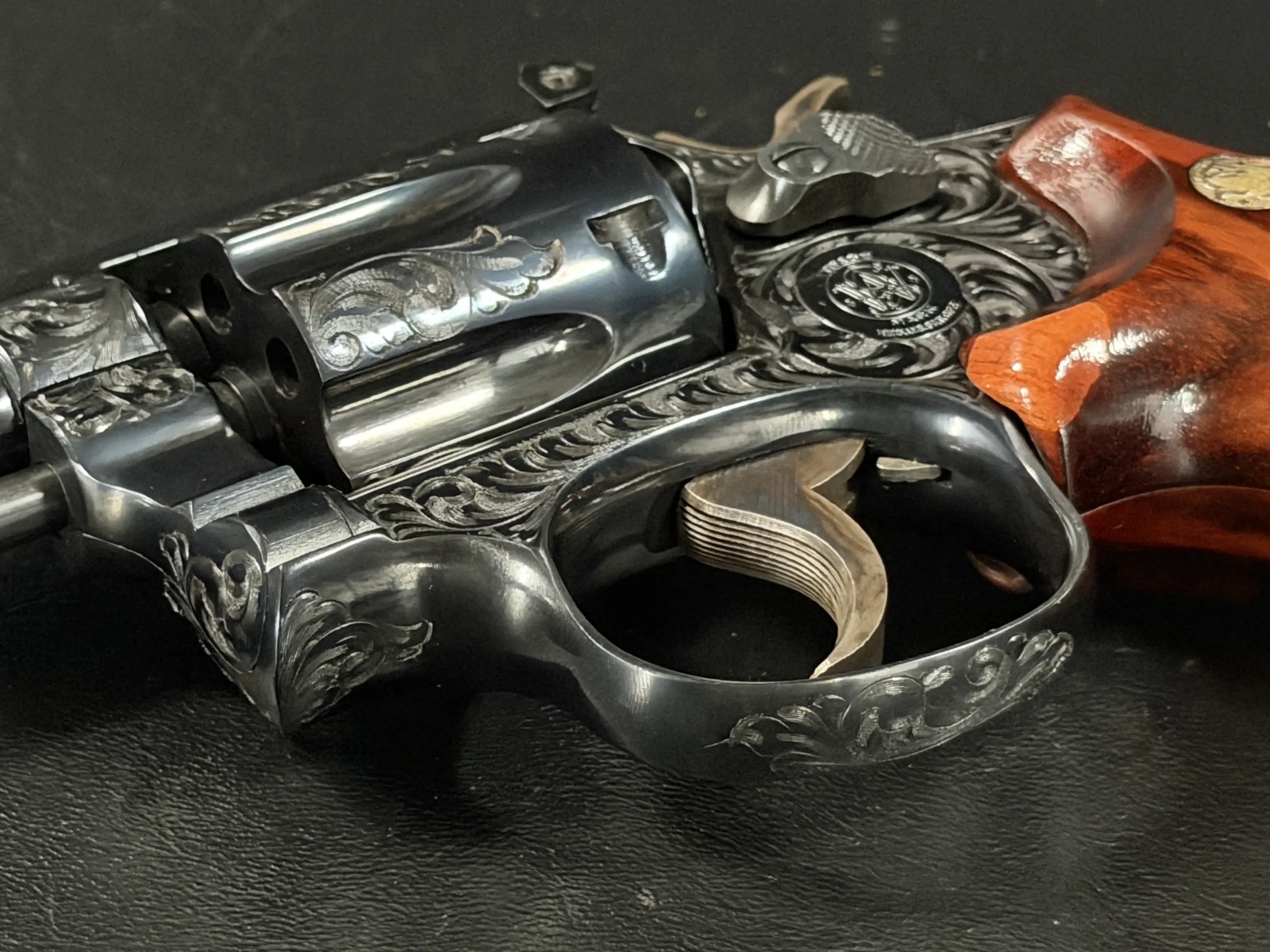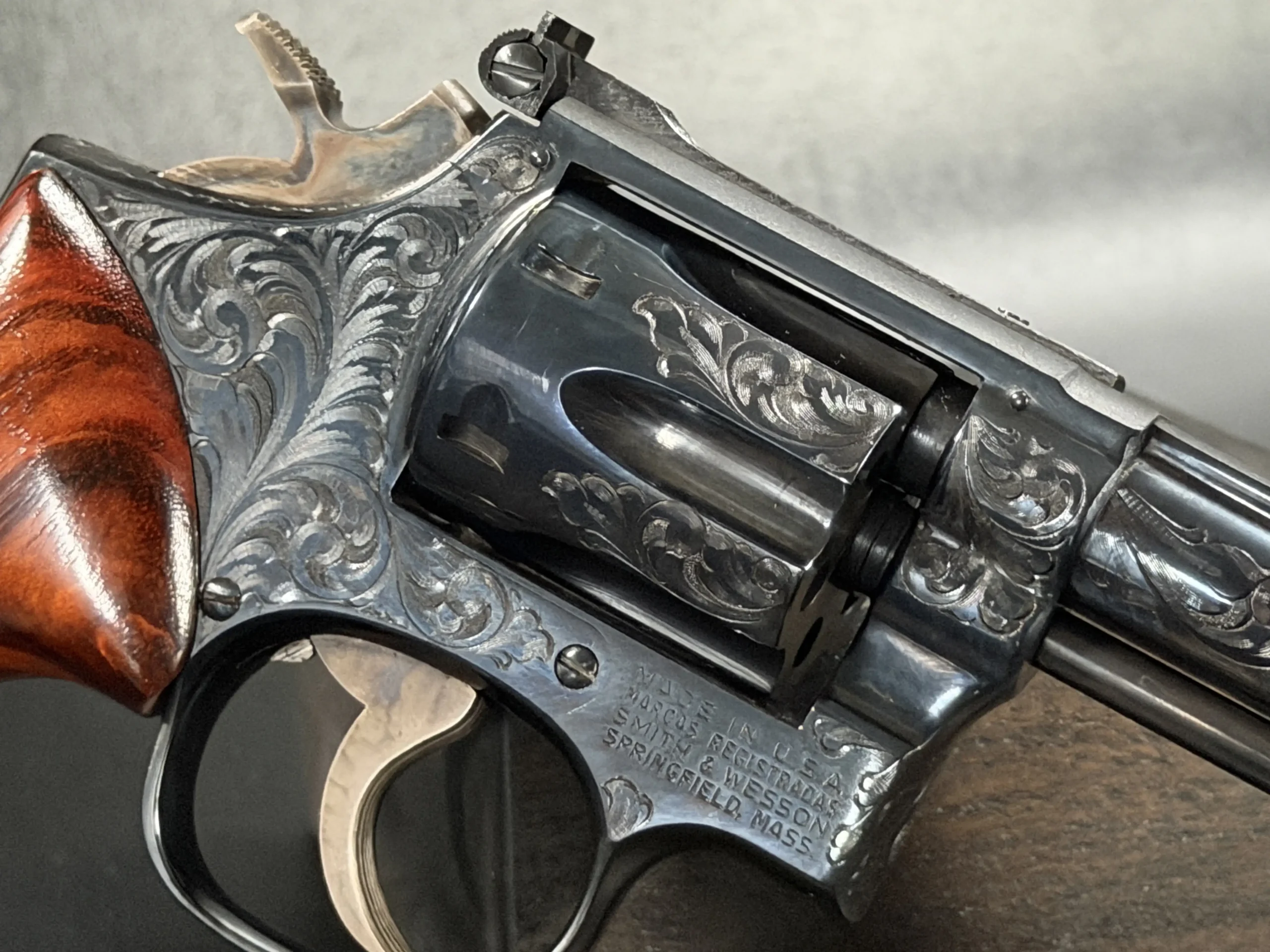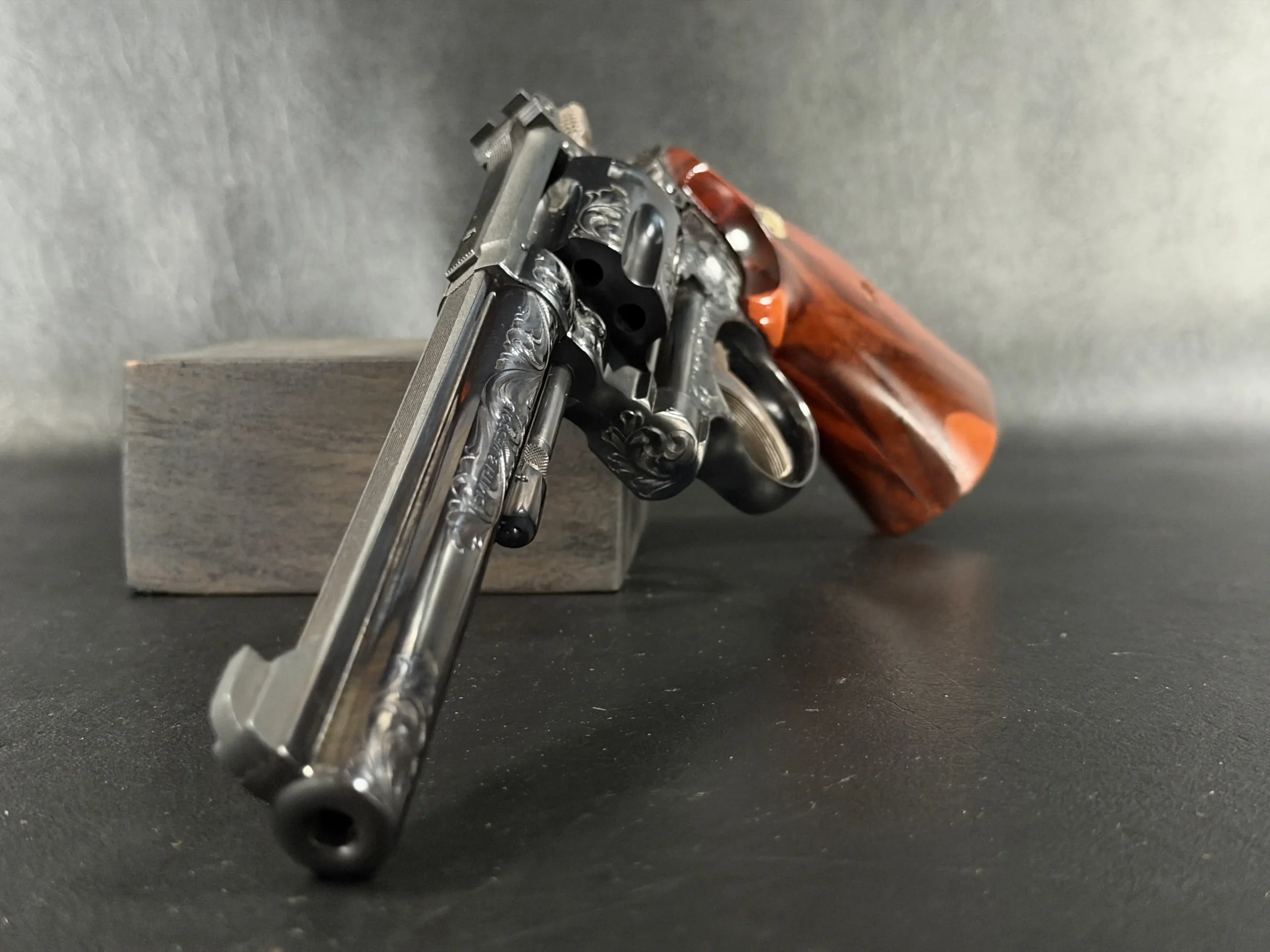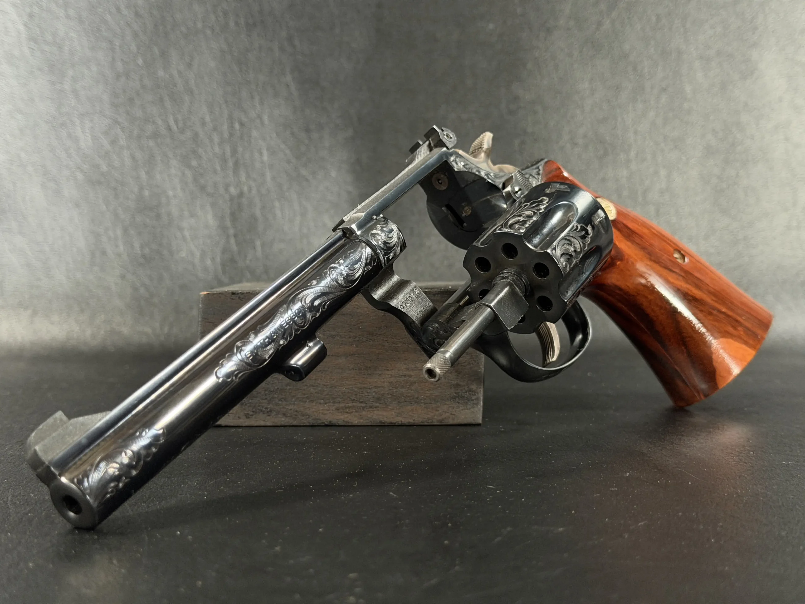 What immediately draws the eye is the factory engraving, executed with a confident hand and a restrained elegance. Flowing scrollwork moves seamlessly across the frame, cylinder, and barrel, catching light against the deep blued finish. It’s not overly ornate; it’s deliberate. The engraving complements the revolver’s lines rather than overpowering them, giving the piece a sense of cohesion that only factory work tends to achieve.