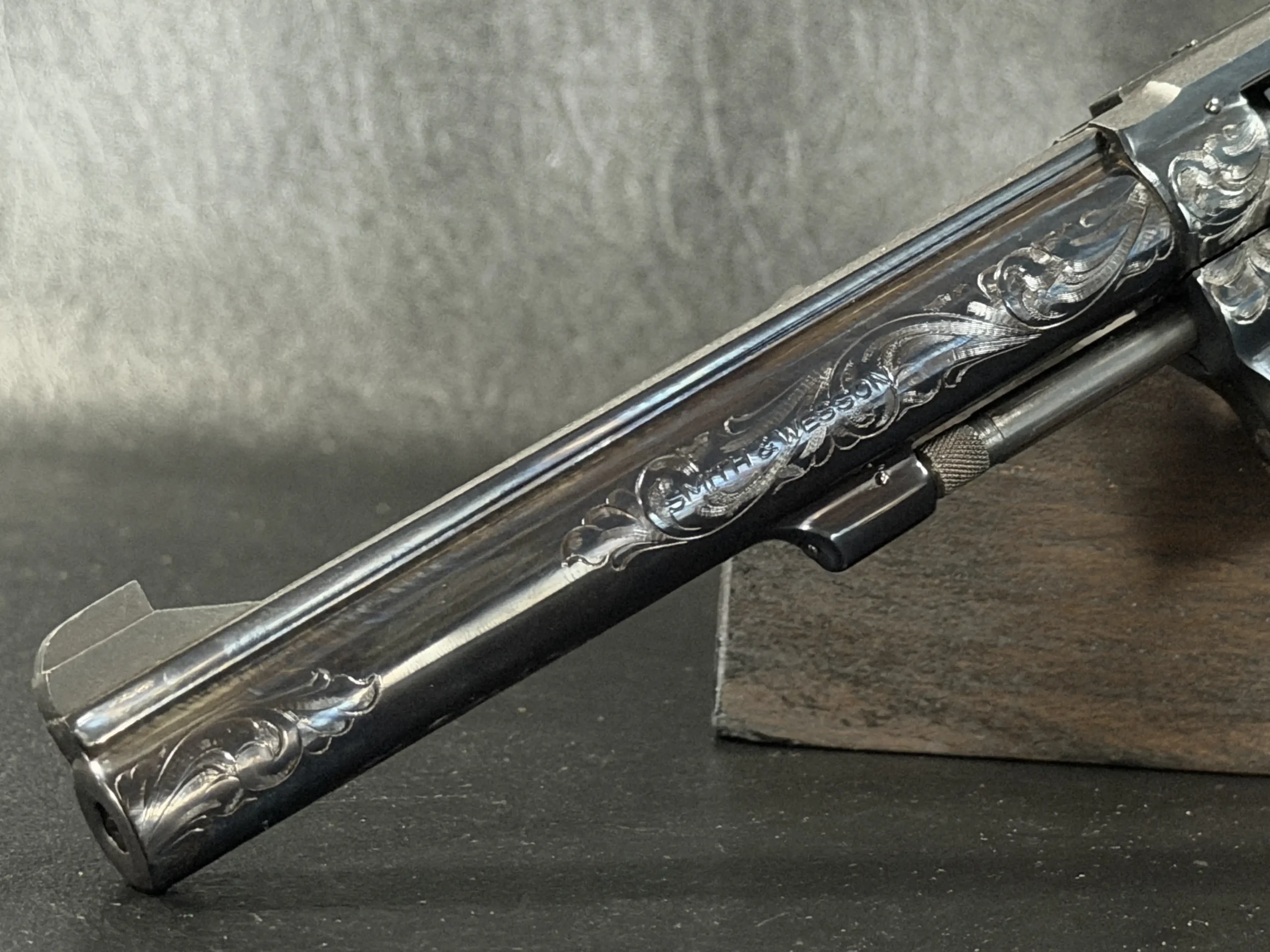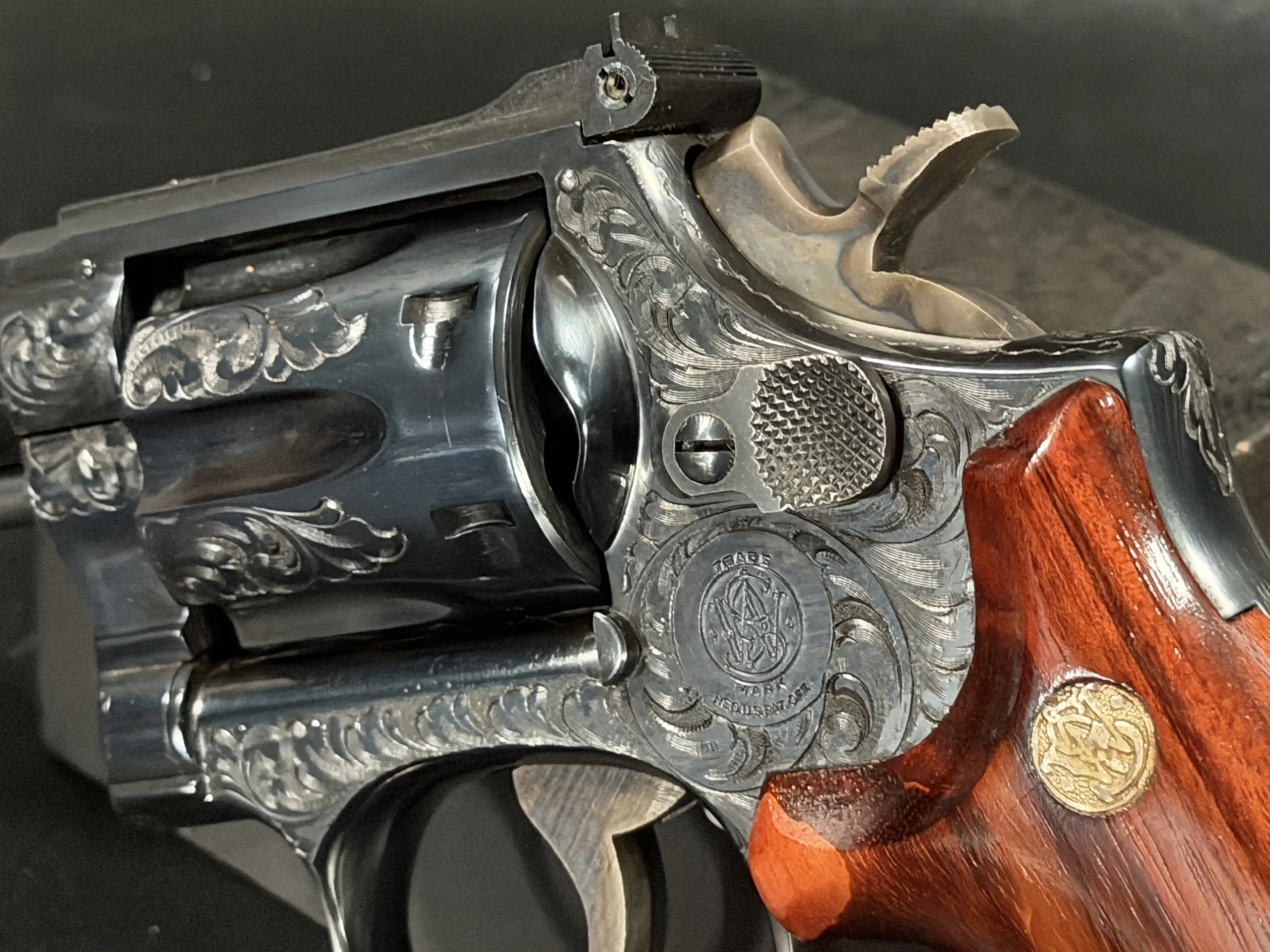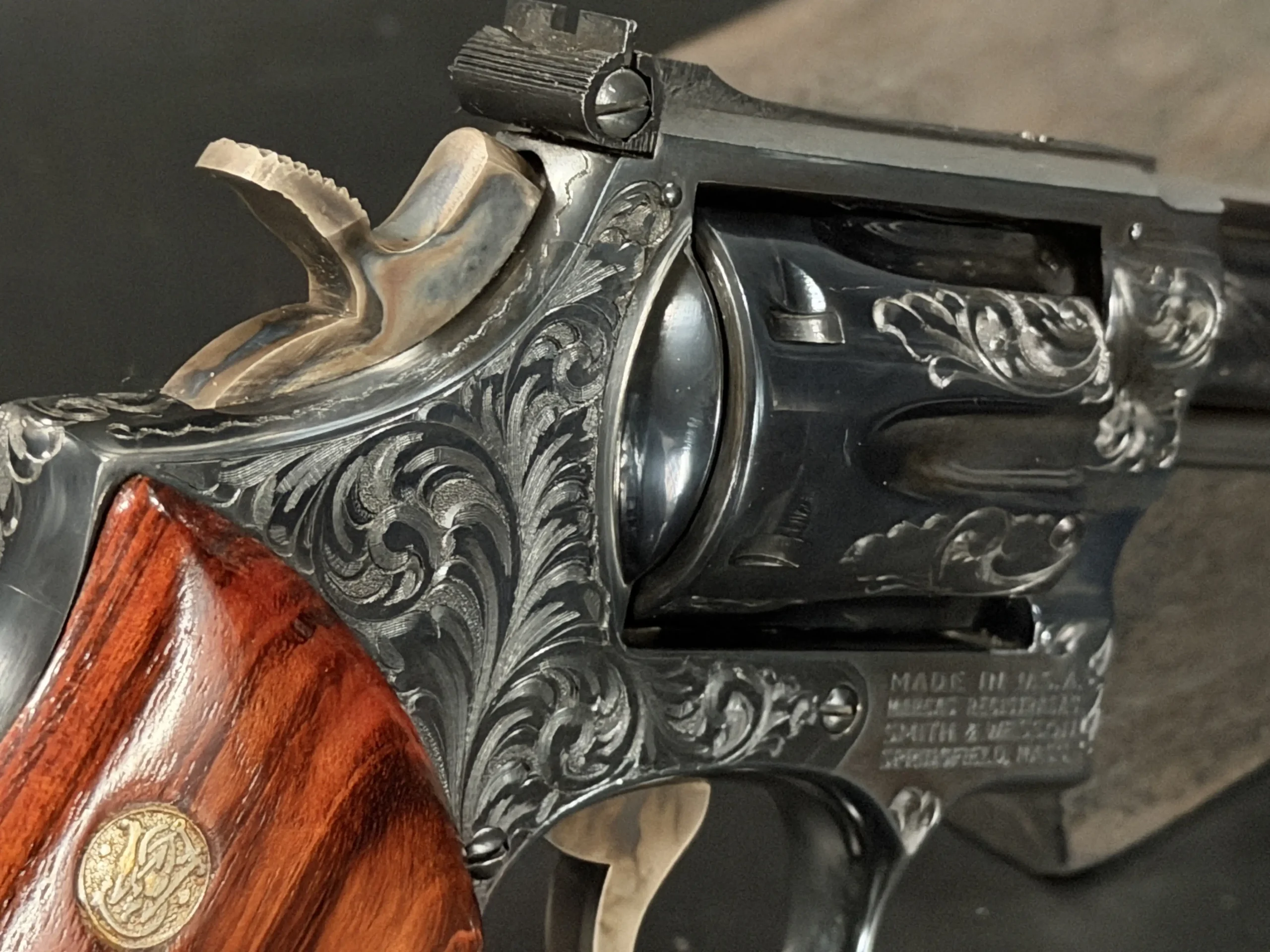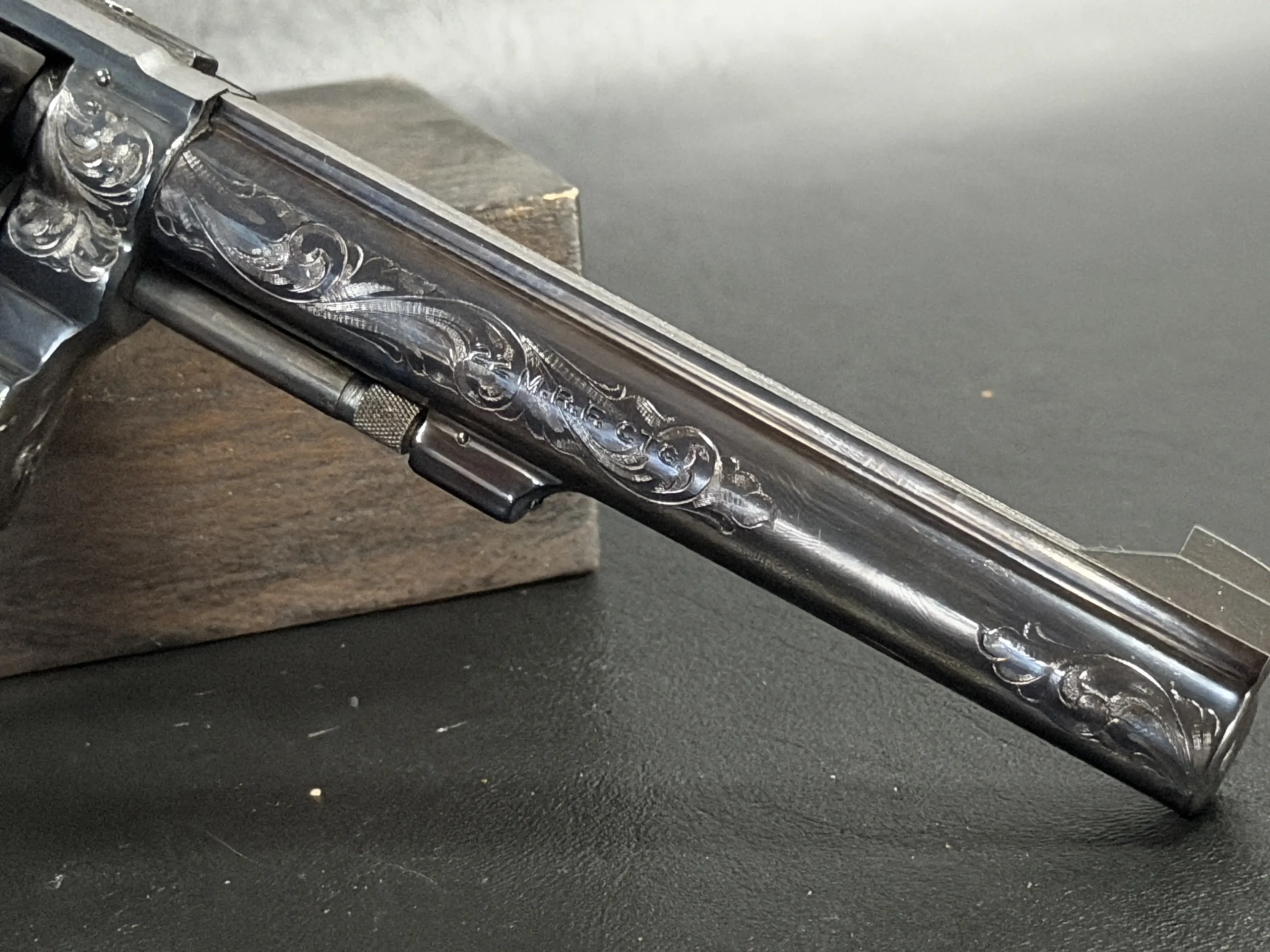 What immediately draws the eye is the factory engraving, executed with a confident hand and a restrained elegance. Flowing scrollwork moves seamlessly across the frame, cylinder, and barrel, catching light against the deep blued finish. It’s not overly ornate; it’s deliberate. The engraving complements the revolver’s lines rather than overpowering them, giving the piece a sense of cohesion that only factory work tends to achieve.