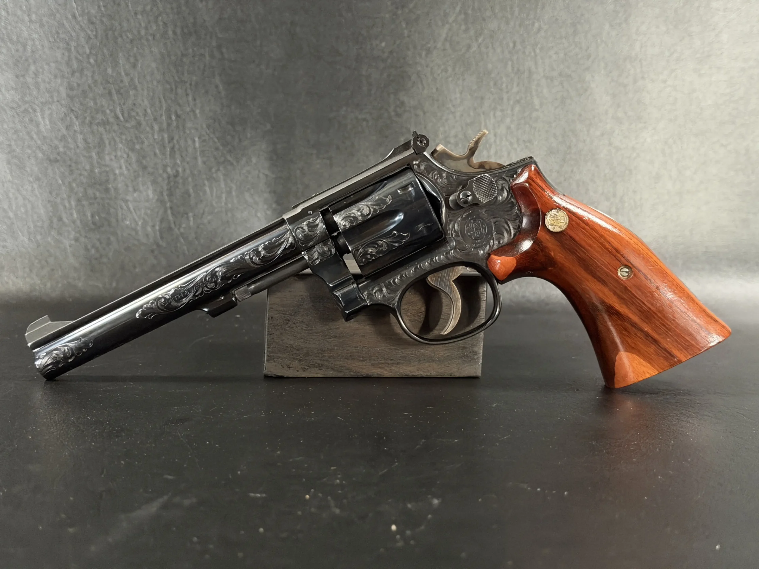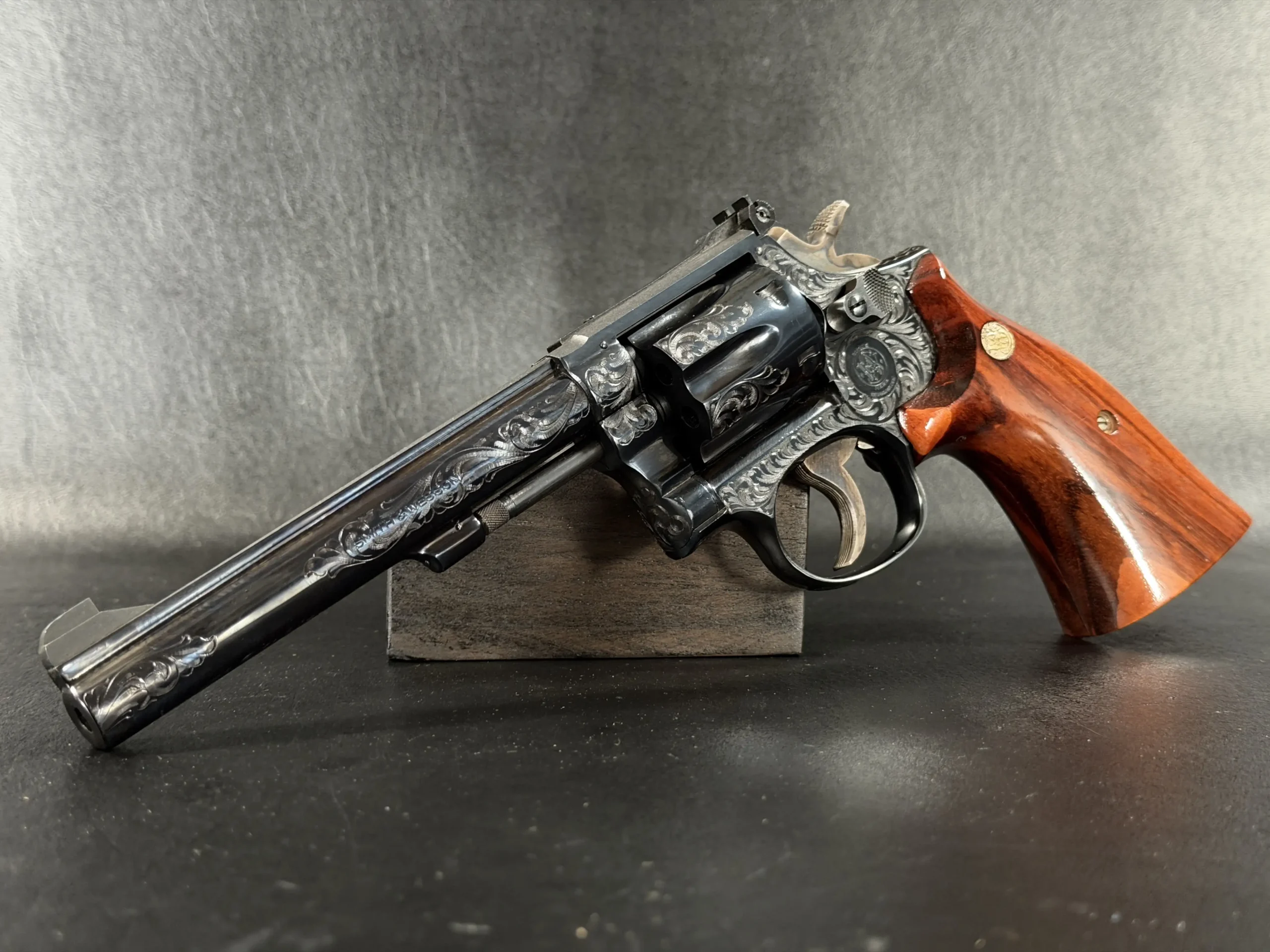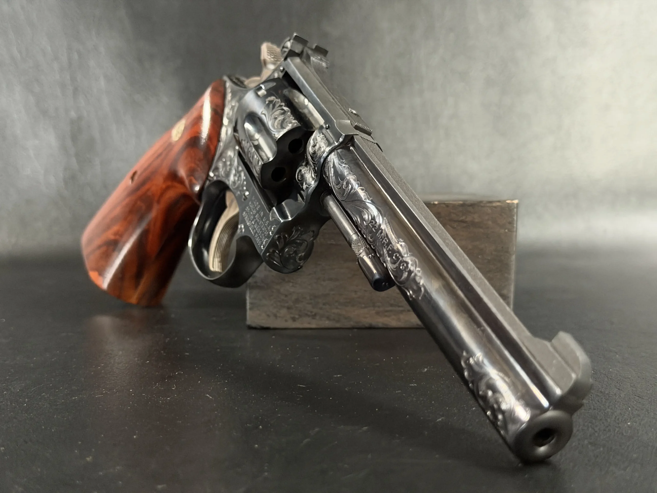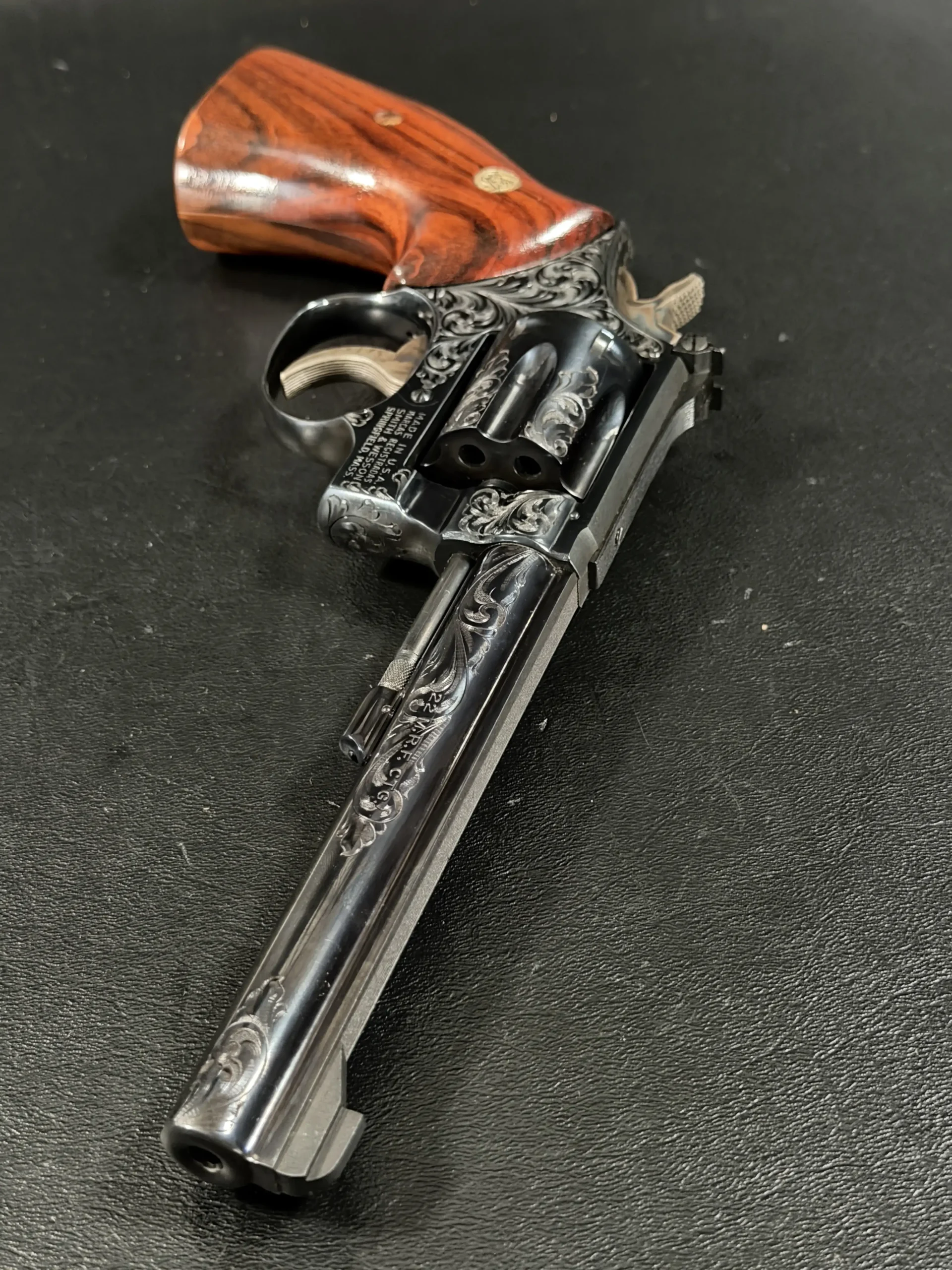 There’s something undeniably special about a rimfire revolver that was never meant to be ordinary. This Smith & Wesson Model 48-4 Factory Engraved is one of those rare pieces where craftsmanship quietly takes center stage, where function meets artistry in a way that feels intentional, not excessive.