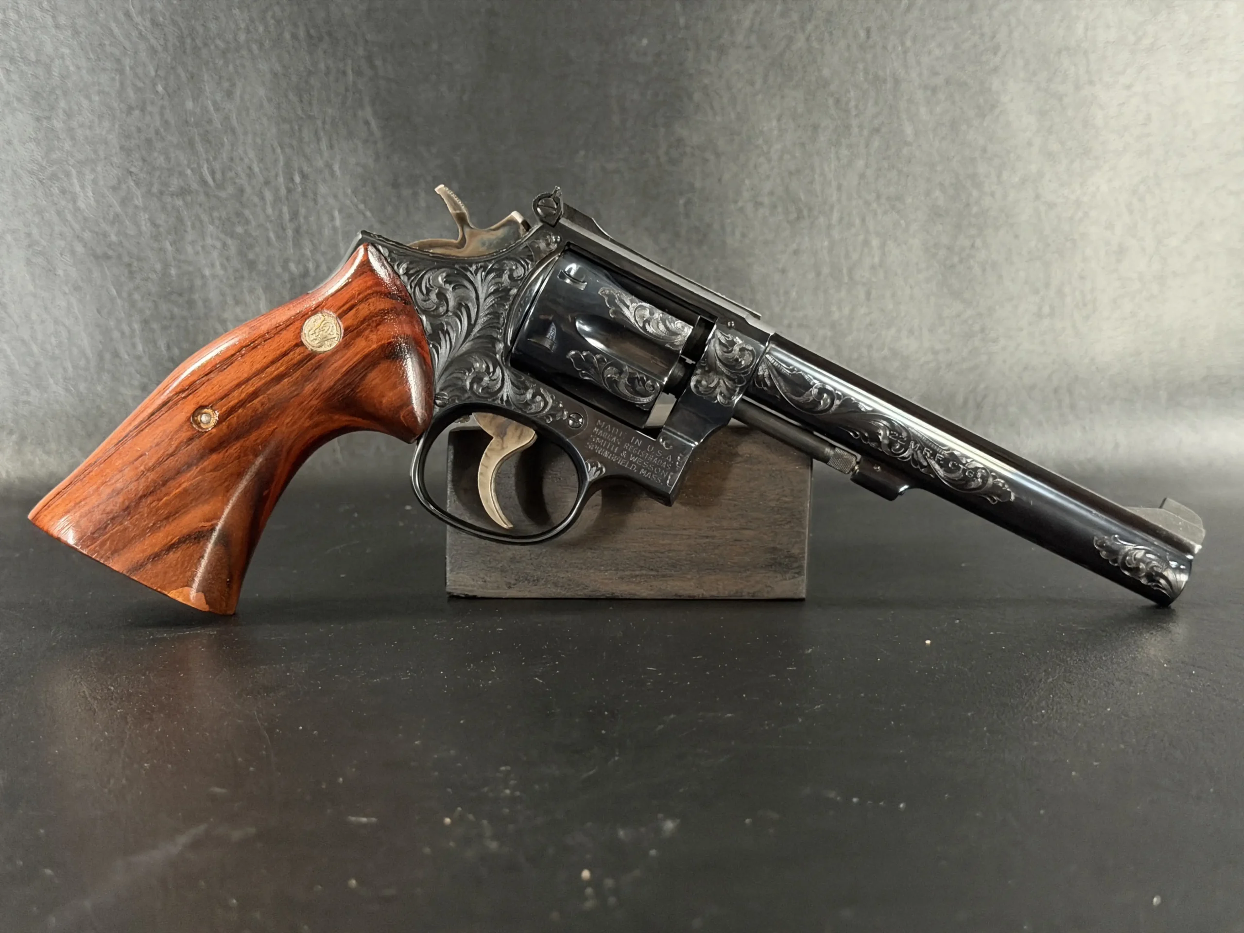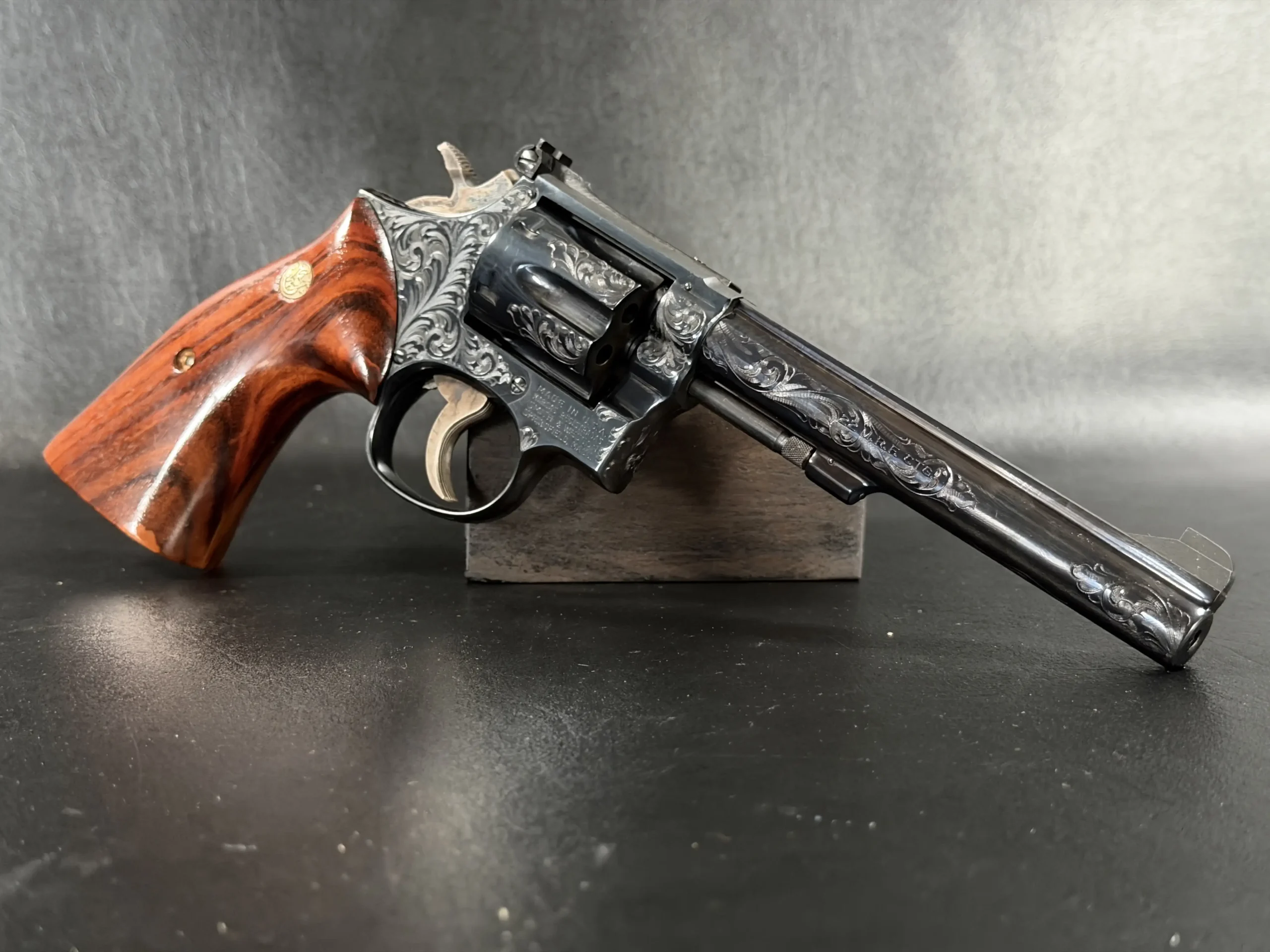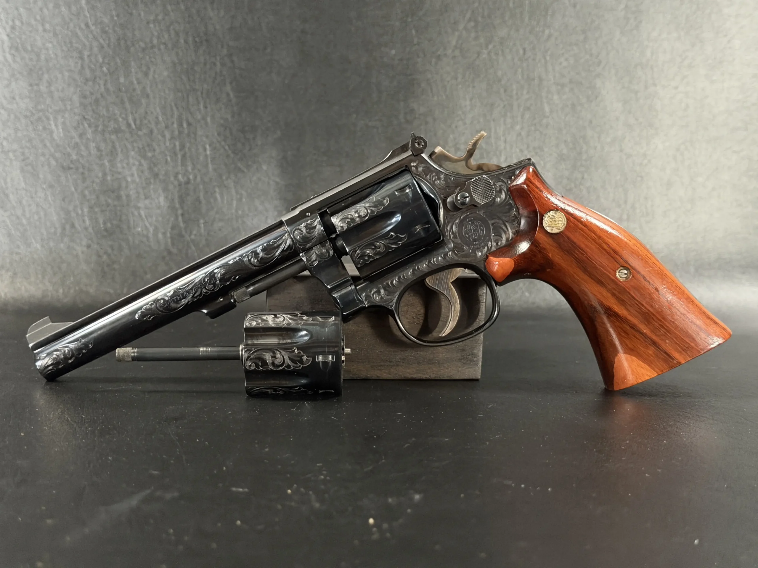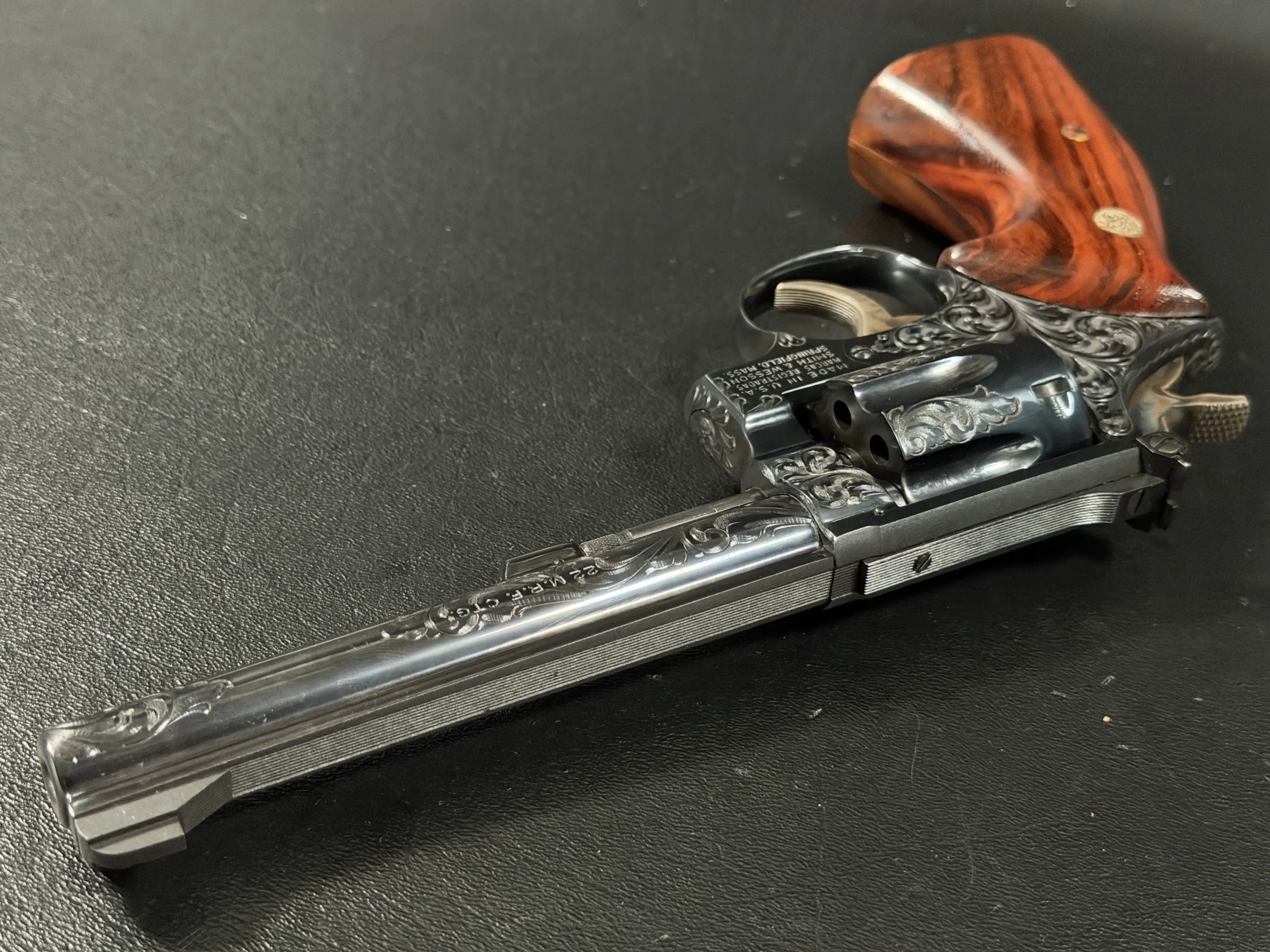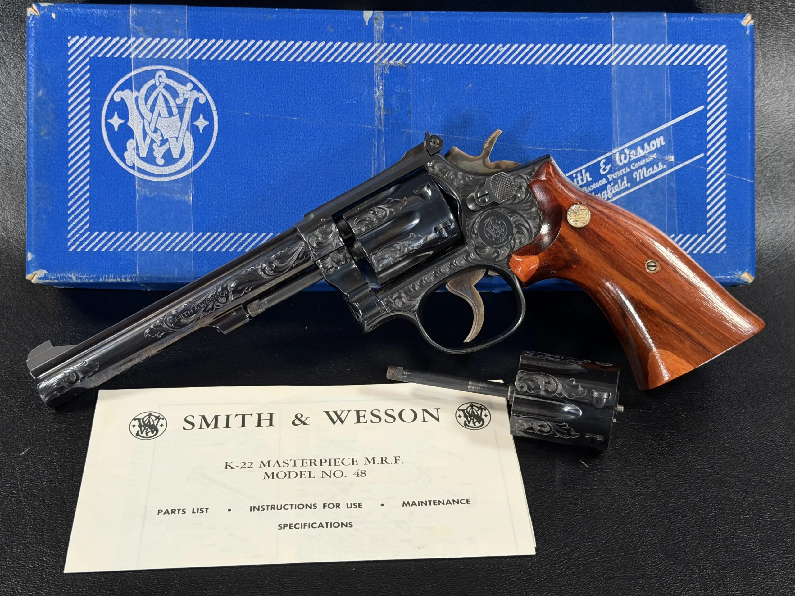 There’s something undeniably special about a rimfire revolver that was never meant to be ordinary. This Smith & Wesson Model 48-4 Factory Engraved is one of those rare pieces where craftsmanship quietly takes center stage, where function meets artistry in a way that feels intentional, not excessive.