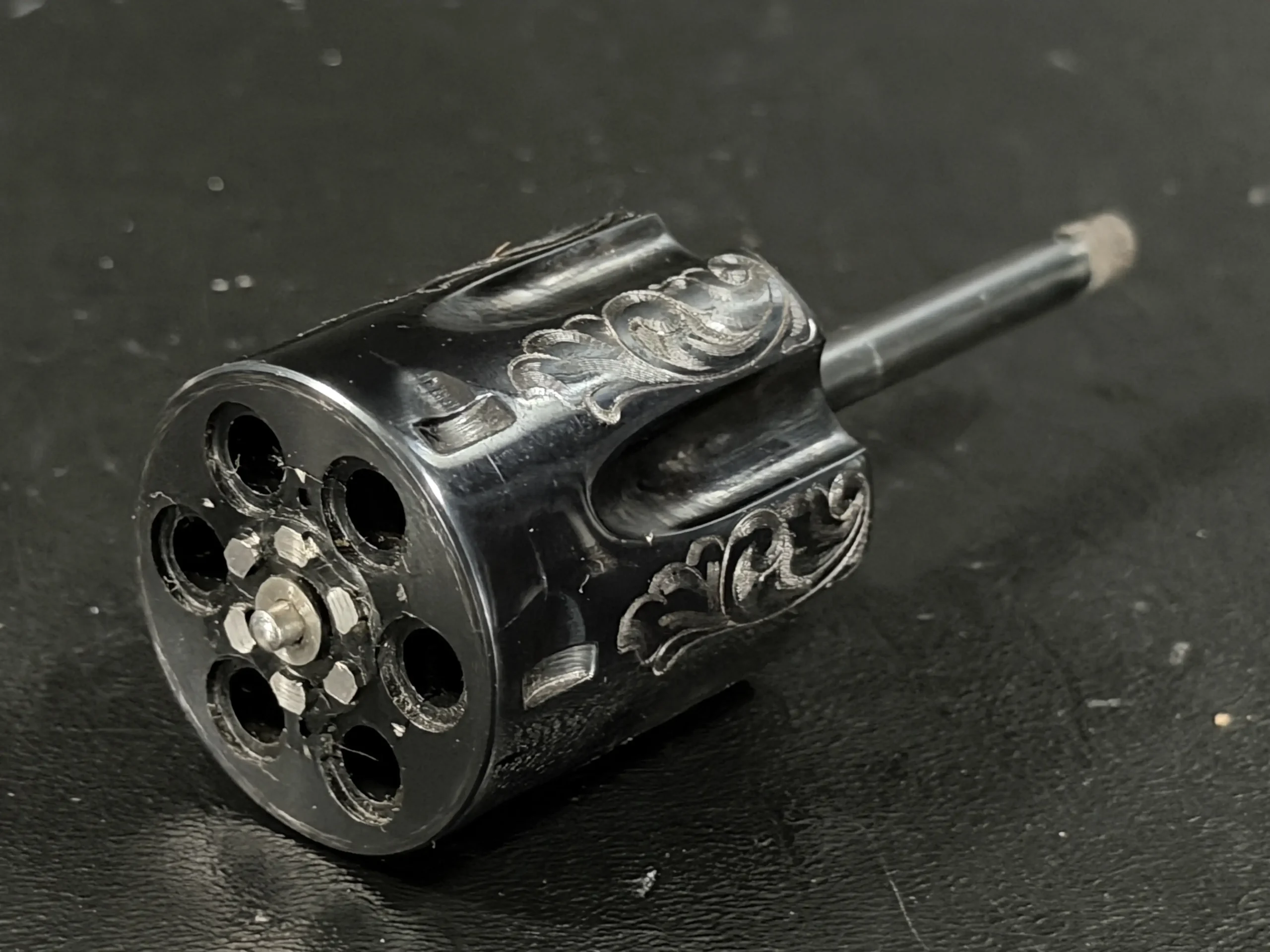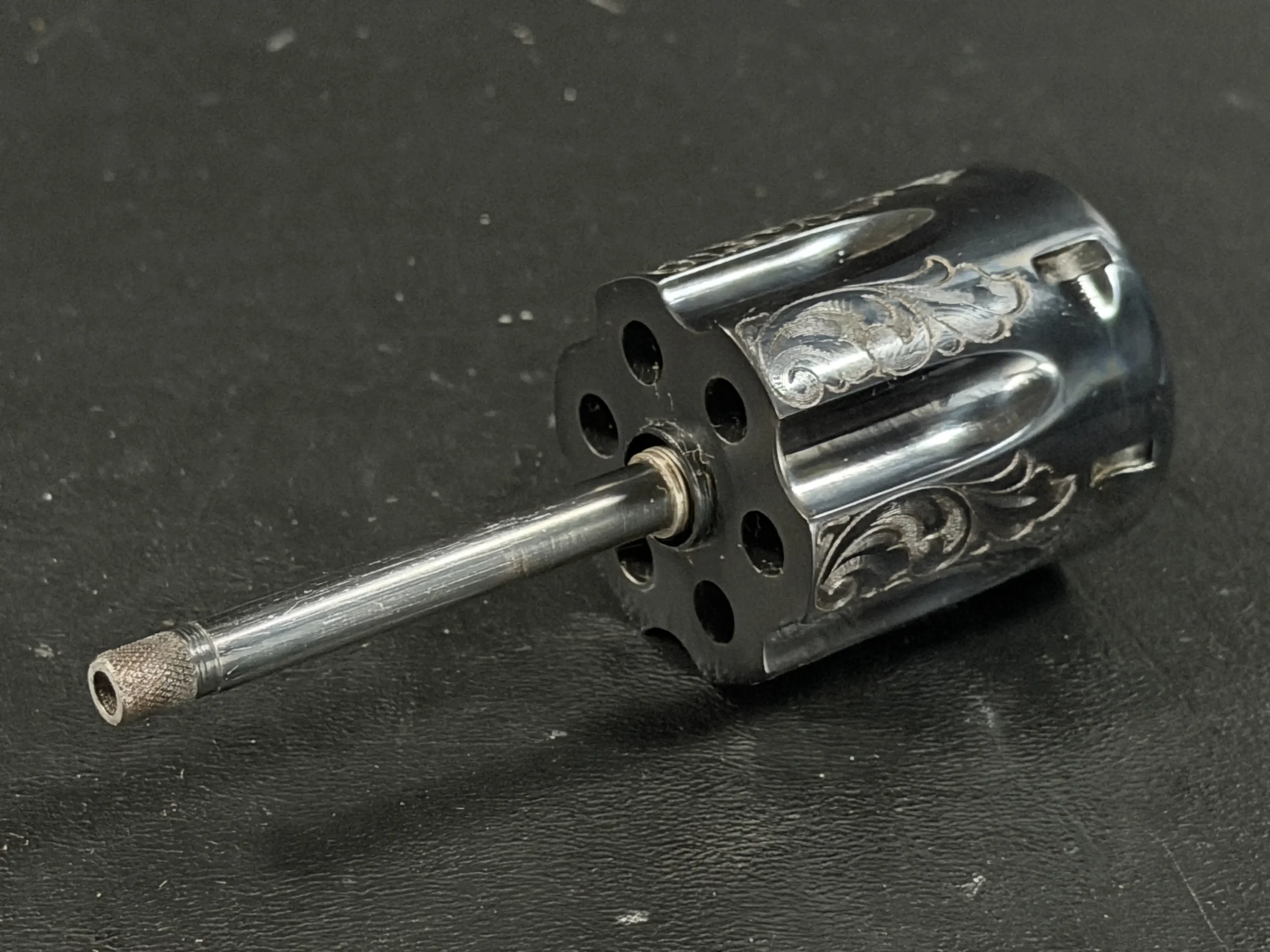 Adding another layer of intrigue, this revolver is accompanied by an auxiliary cylinder assembly, equally engraved to match the primary unit, an uncommon and highly desirable feature that speaks to the level of attention given to this particular example.