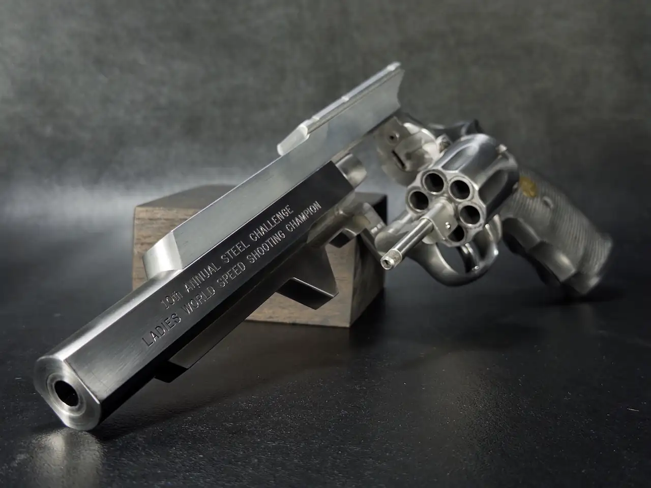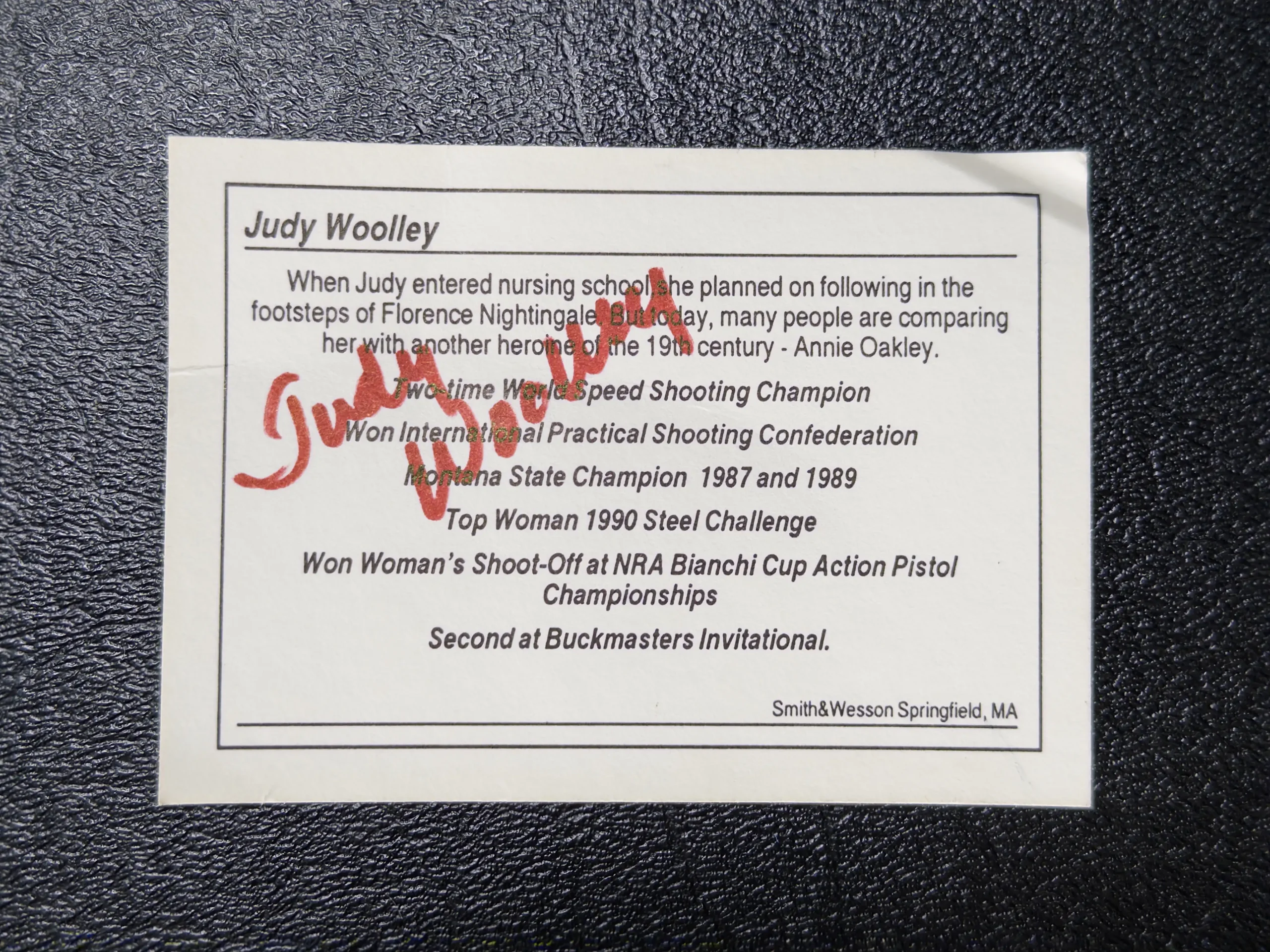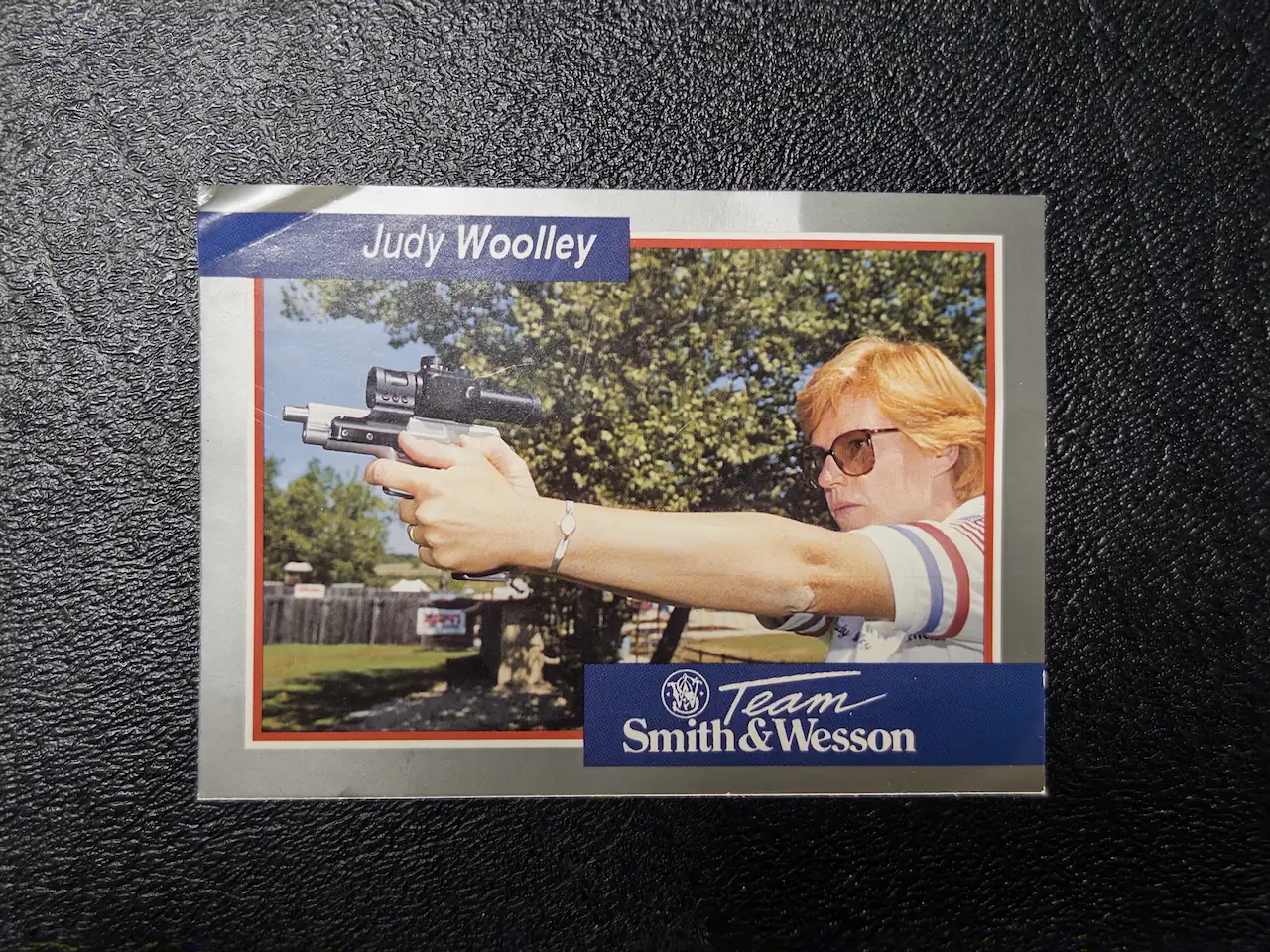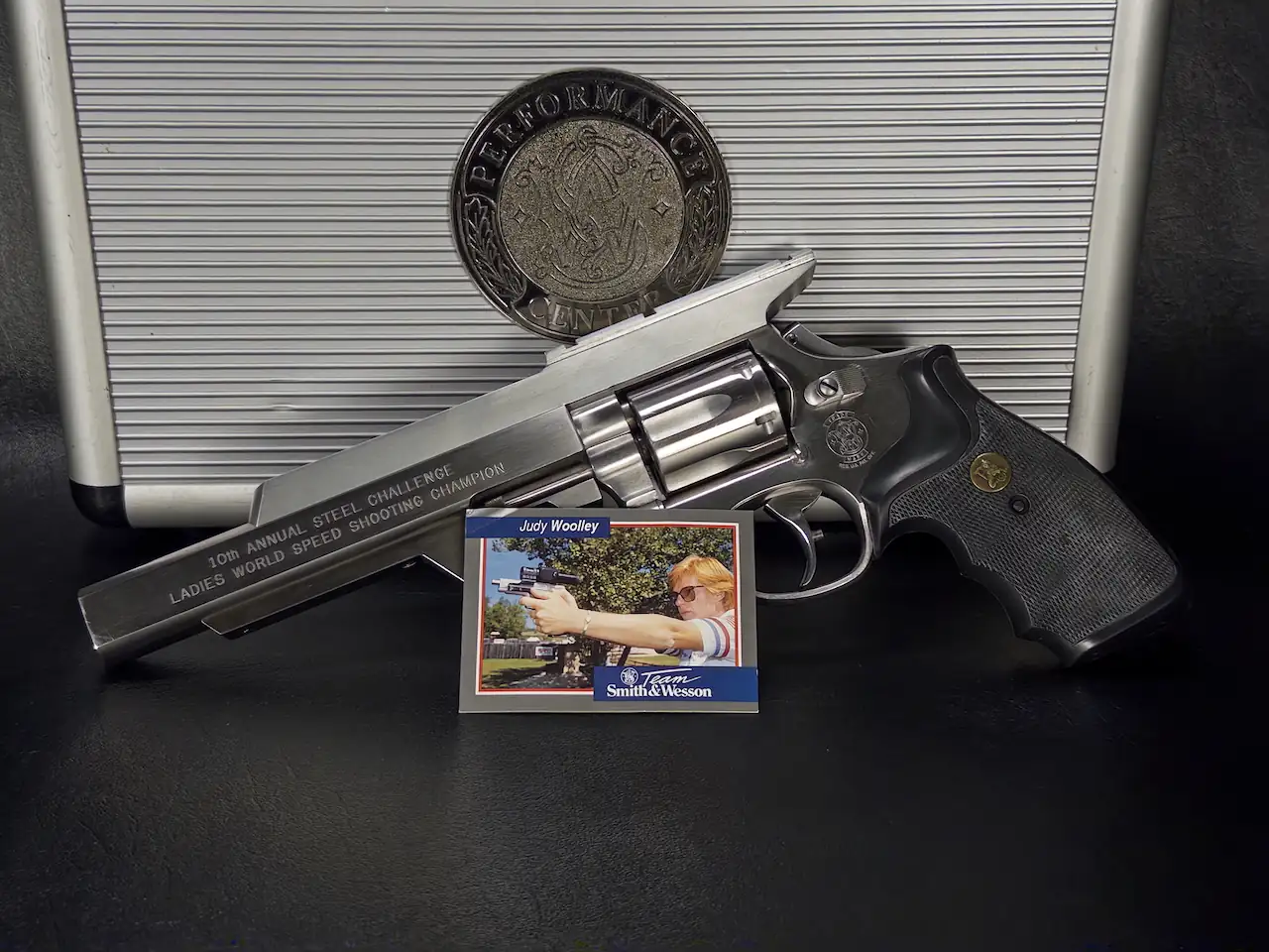 That connection is reinforced by the included Judy Woolley card, highlighting one of the era’s standout competitors. Woolley’s accomplishments, ranging from Steel Challenge victories to IPSC success, place her among the pioneering figures of women’s competitive shooting. Having this association alongside the revolver adds a layer of provenance that elevates the piece beyond its physical form.