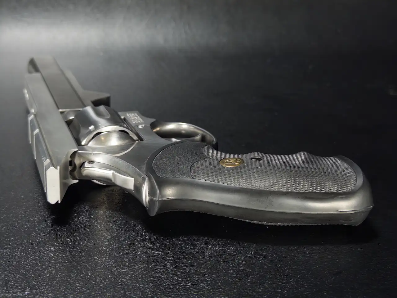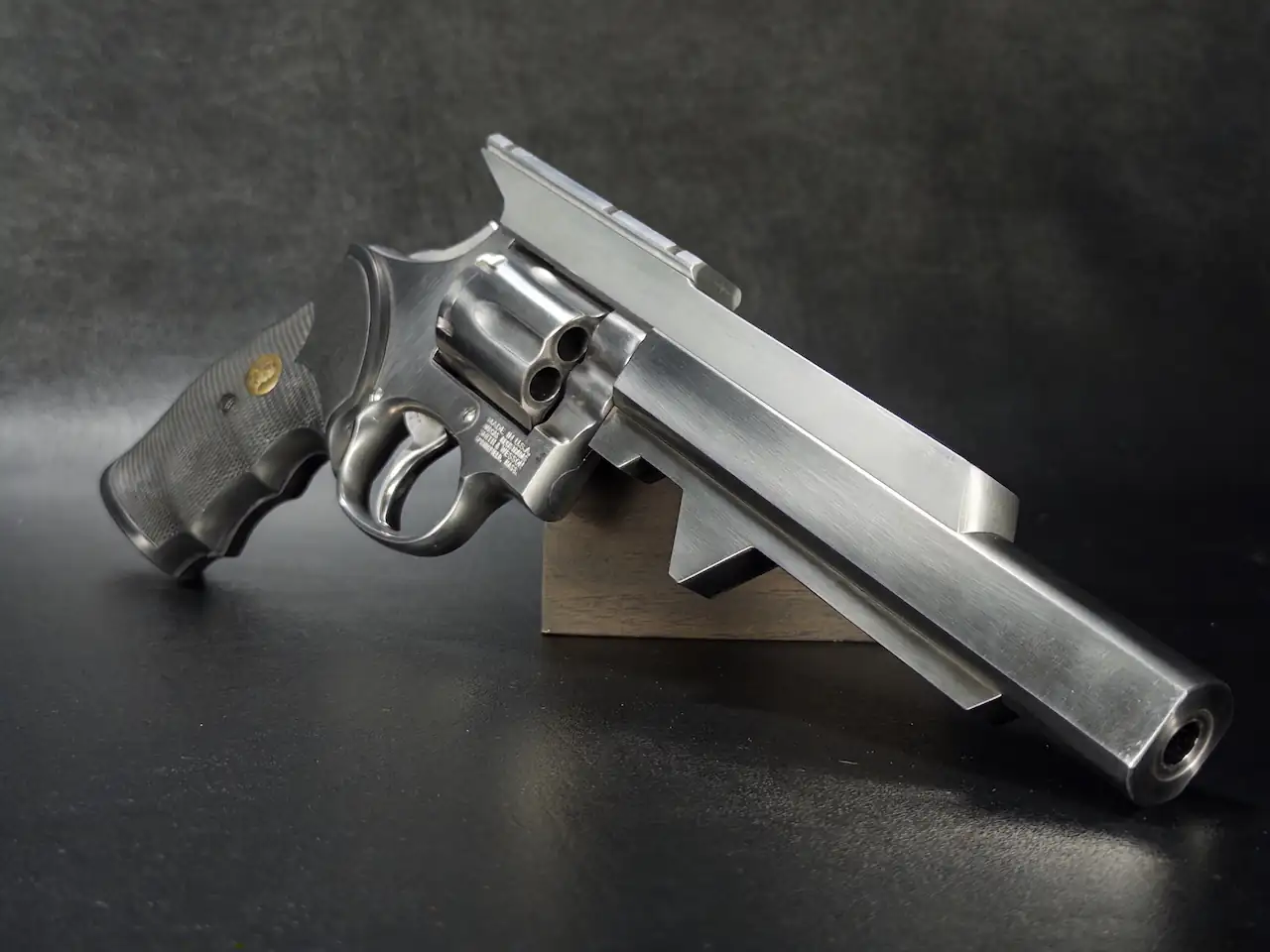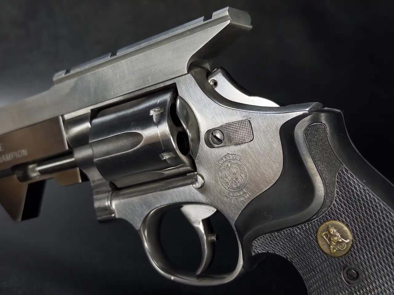 The revolver itself is in excellent condition, retaining its satin stainless finish with crisp edges and clean lines throughout. The cylinder shows minimal handling wear, and the action reflects the smooth, consistent trigger pull expected from Smith & Wesson’s craftsmanship of this period. Factory-fitted medallions complete the package, offering both comfort and period-correct aesthetics.