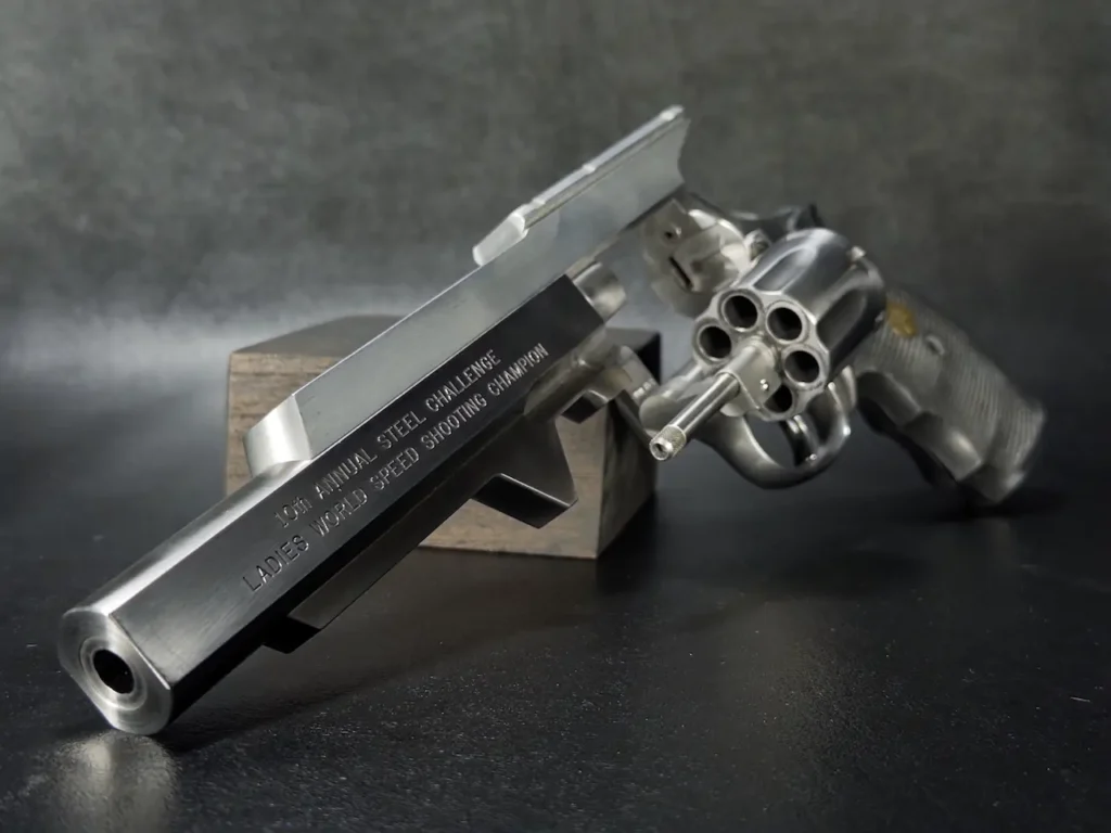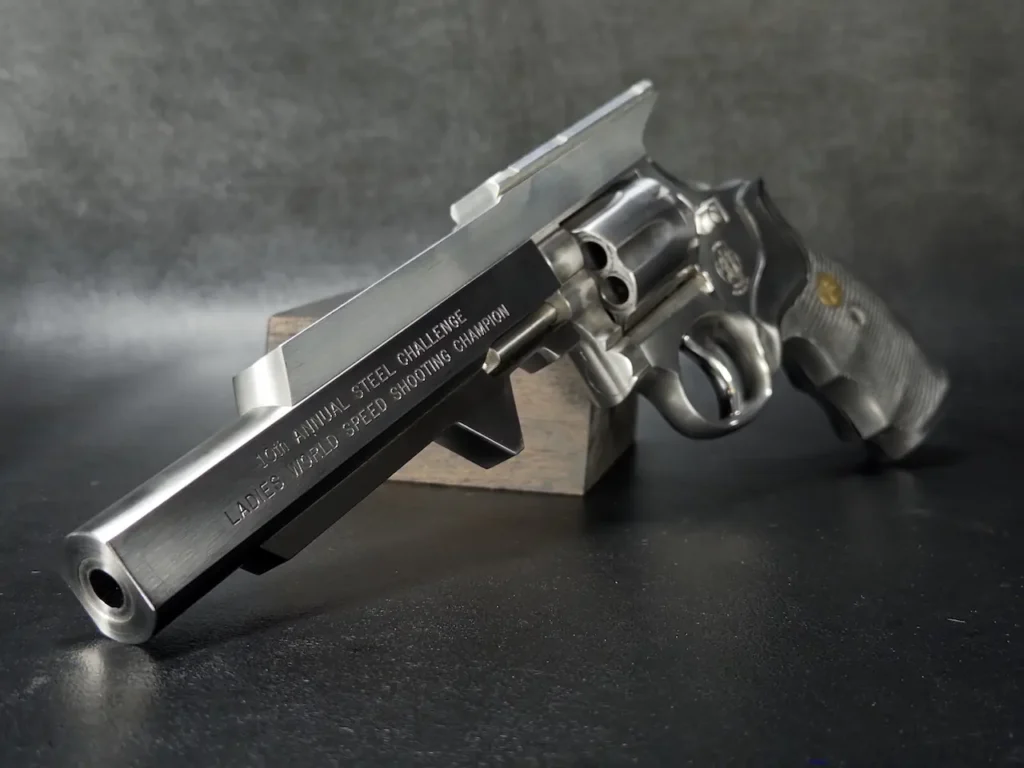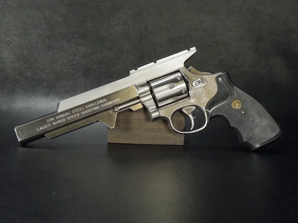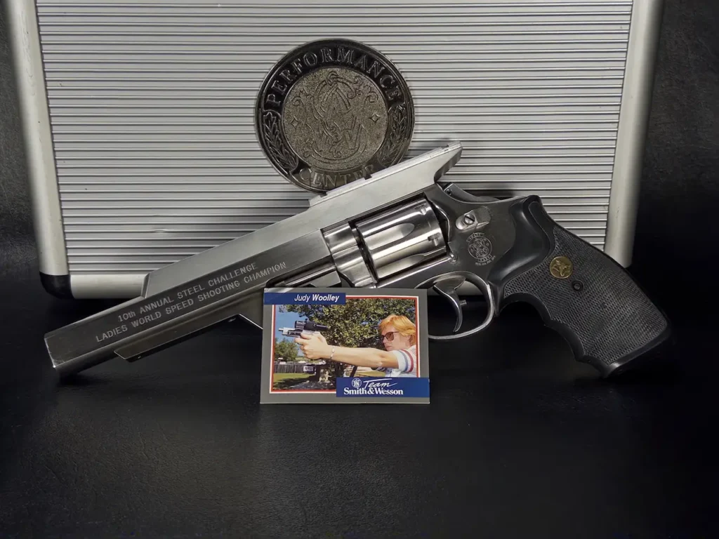 The Smith & Wesson 65-3, distinguished by its engraving “10th Annual Steel Challenge Ladies World Speed Shooting Champion,” is not merely a firearm but a piece of history. It was awarded to Judy Wooley in honor of her exceptional performance at the event, marking her as the undisputed champion. This revolver is a testament to Wooley’s skill and dedication in competitive shooting.