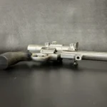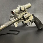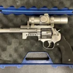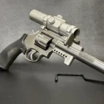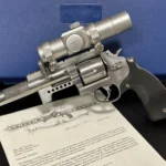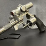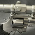 Let’s talk features. The revolver features a heavy 6-inch barrel topped with a compensator, which helps tame recoil and keep shots on target. Scope mounts are integrated with precision in mind, and it’s currently paired with a Sightron pistol scope—an ideal combo for serious accuracy. Whether you’re on the range or showing it off in your display case, it’s got presence.