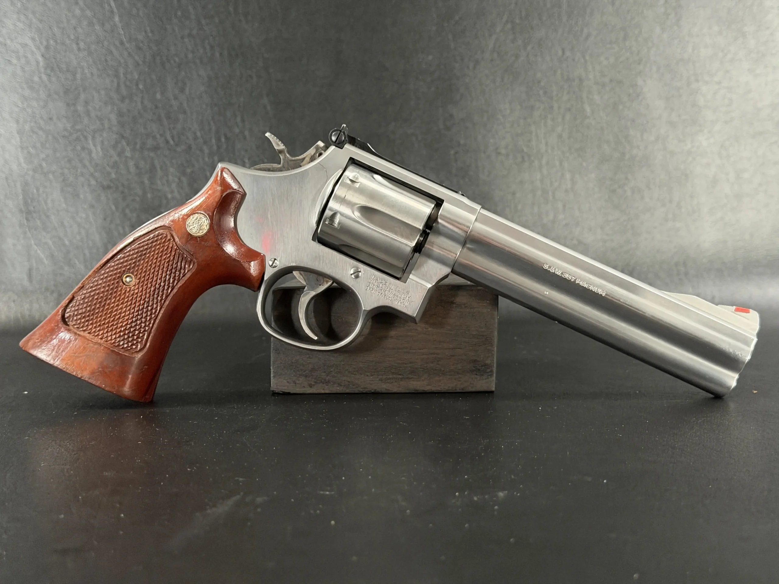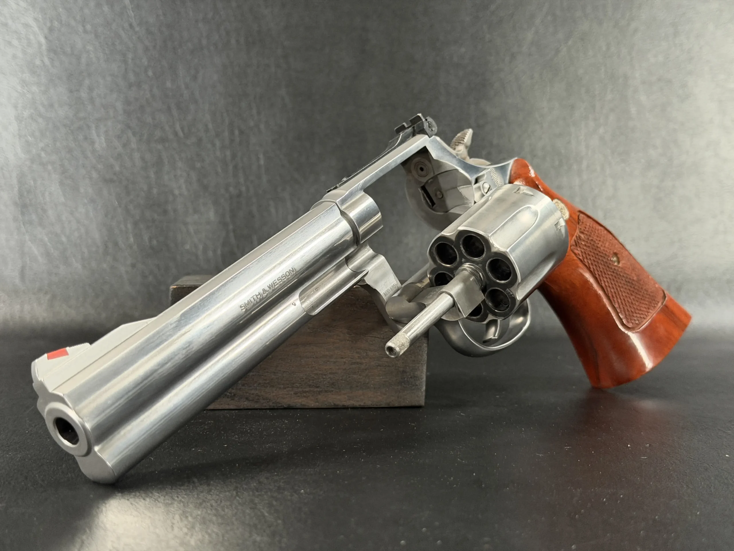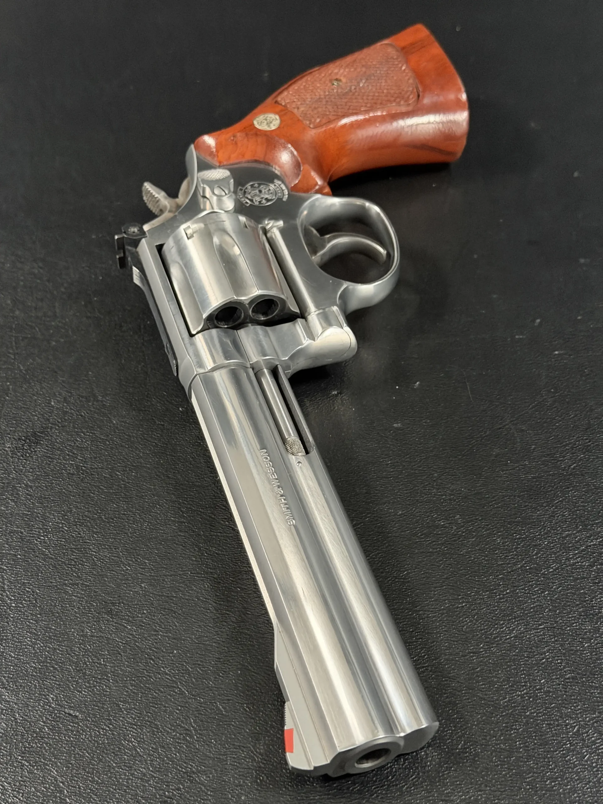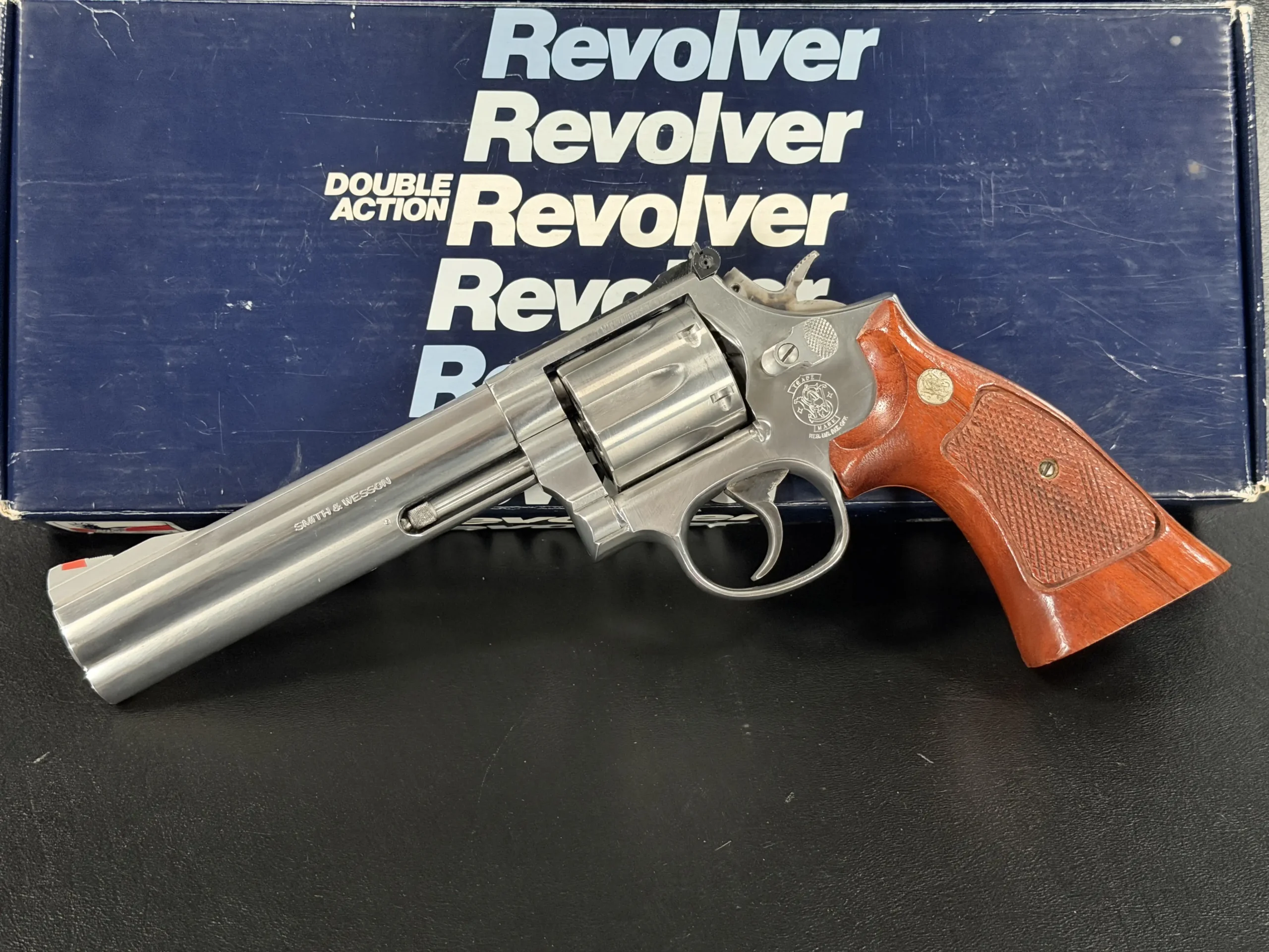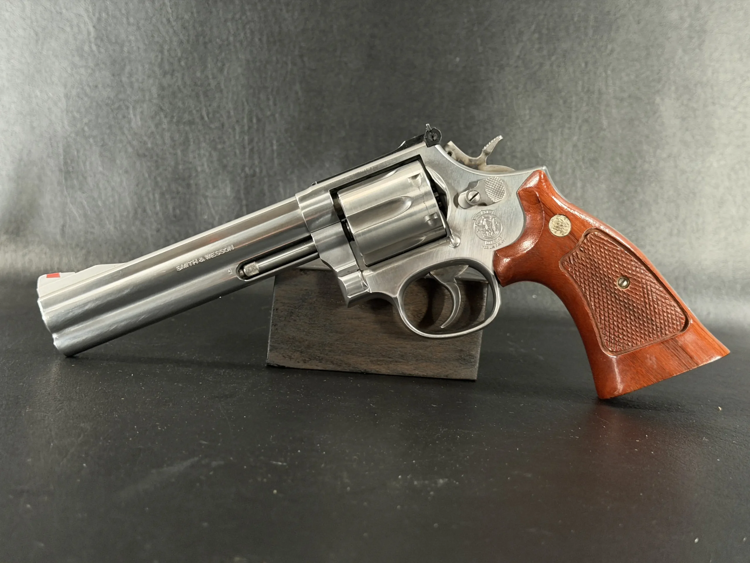 The revolver is fitted with checkered hardwood grips bearing the iconic Smith & Wesson medallions. Their warm tone contrasts beautifully against the cool stainless frame, creating a timeless aesthetic that feels both purposeful and refined. Subtle wear consistent with careful handling only adds to its authenticity, preserving the character expected of a piece with history.