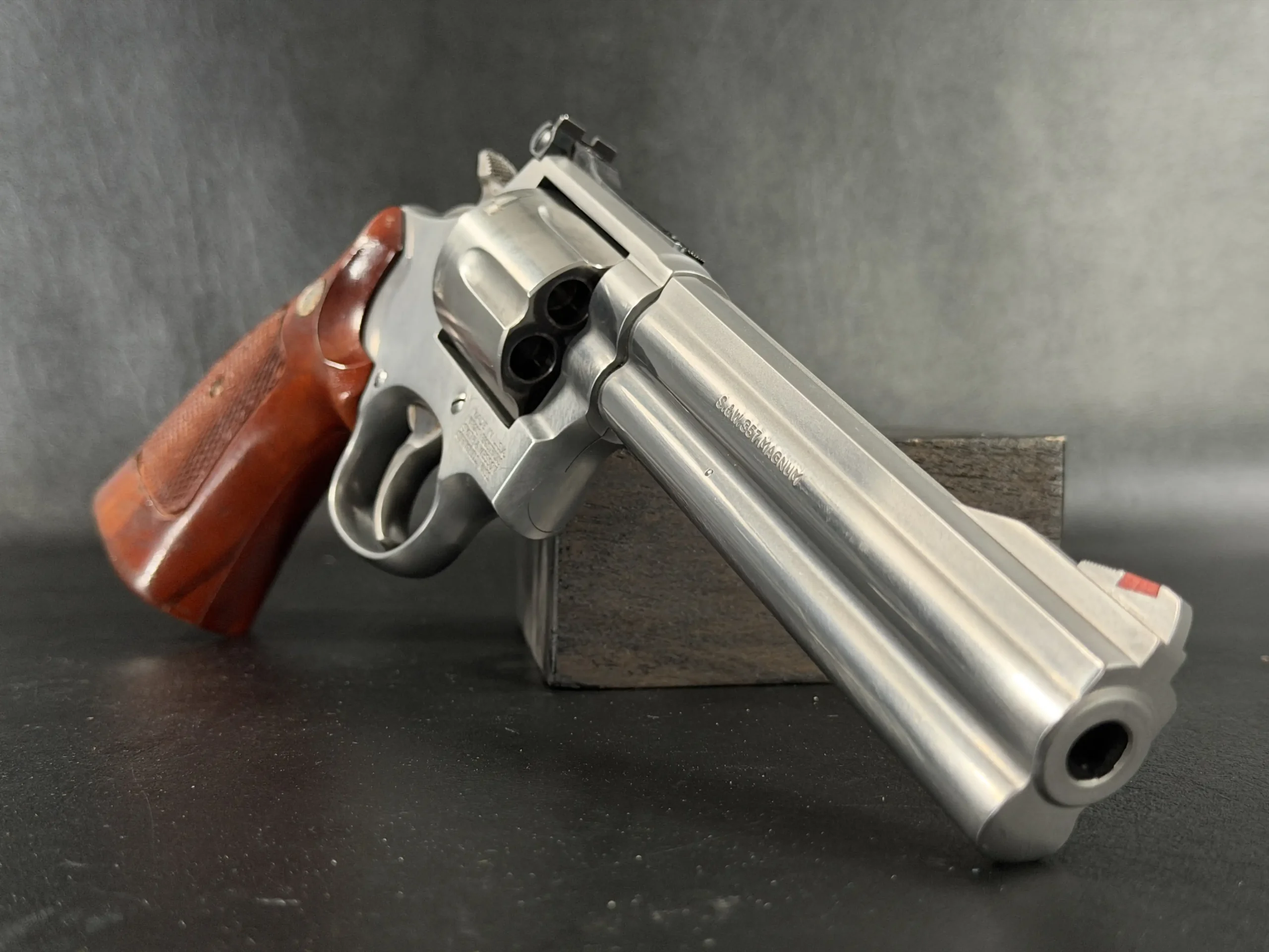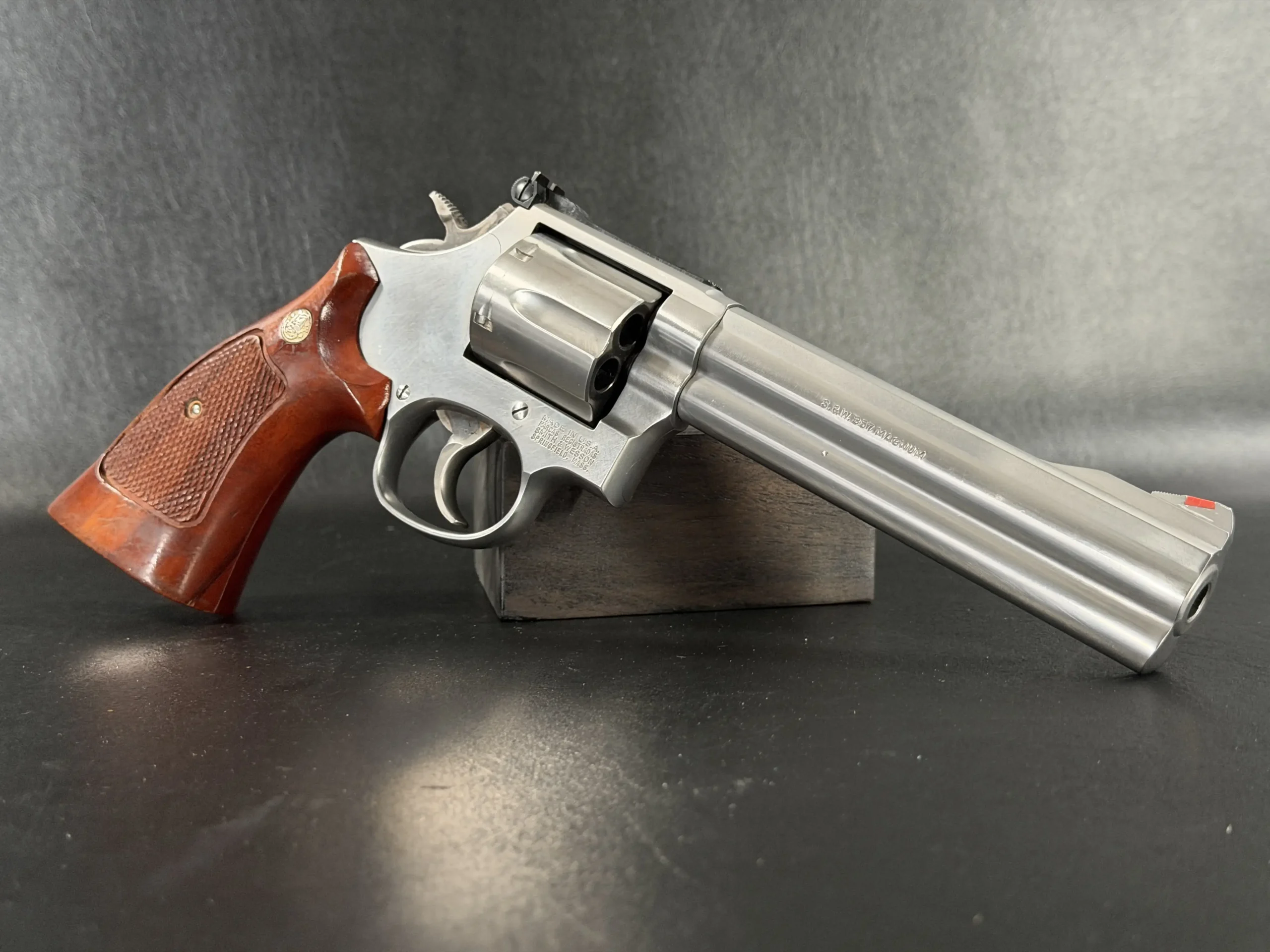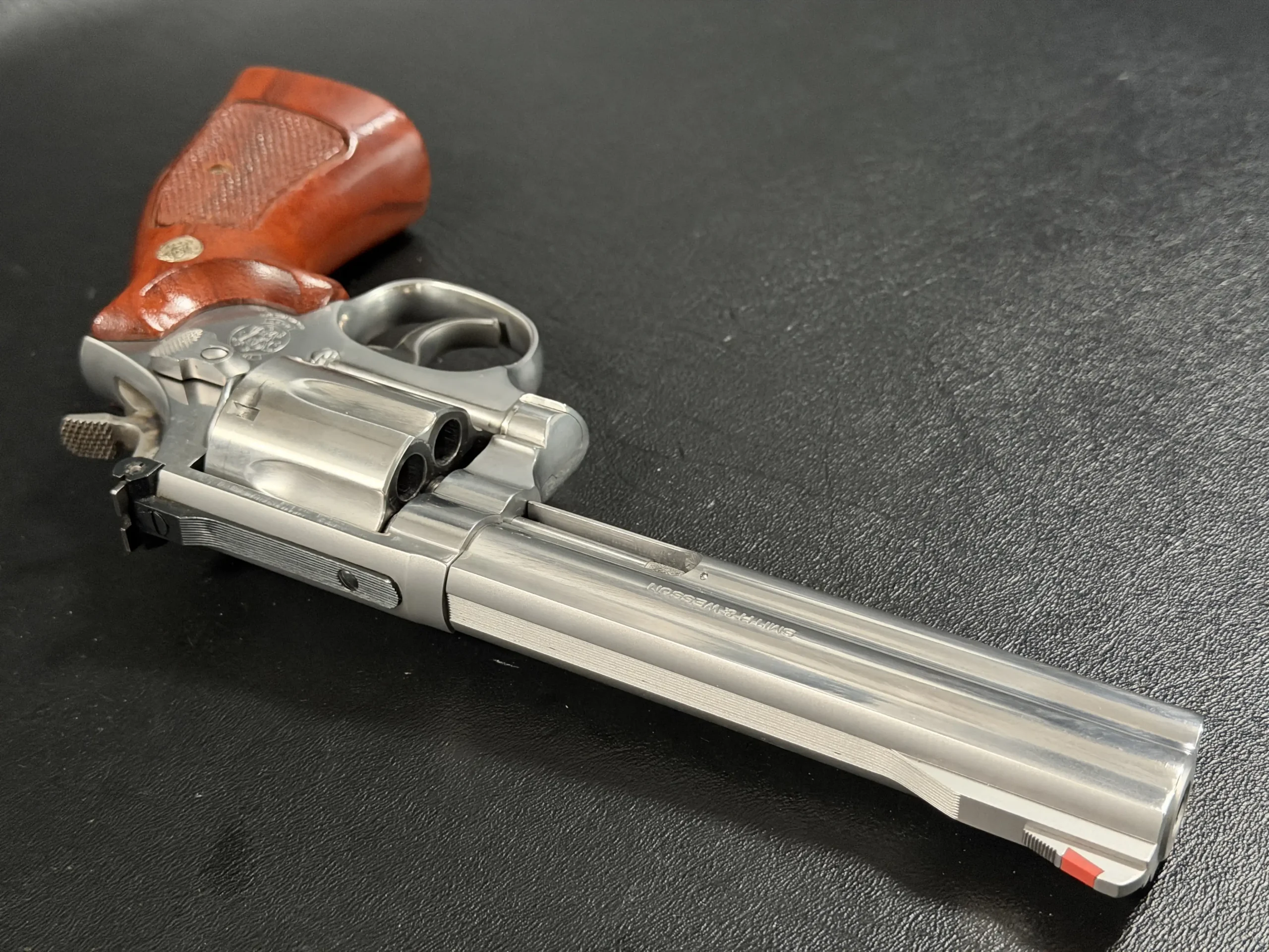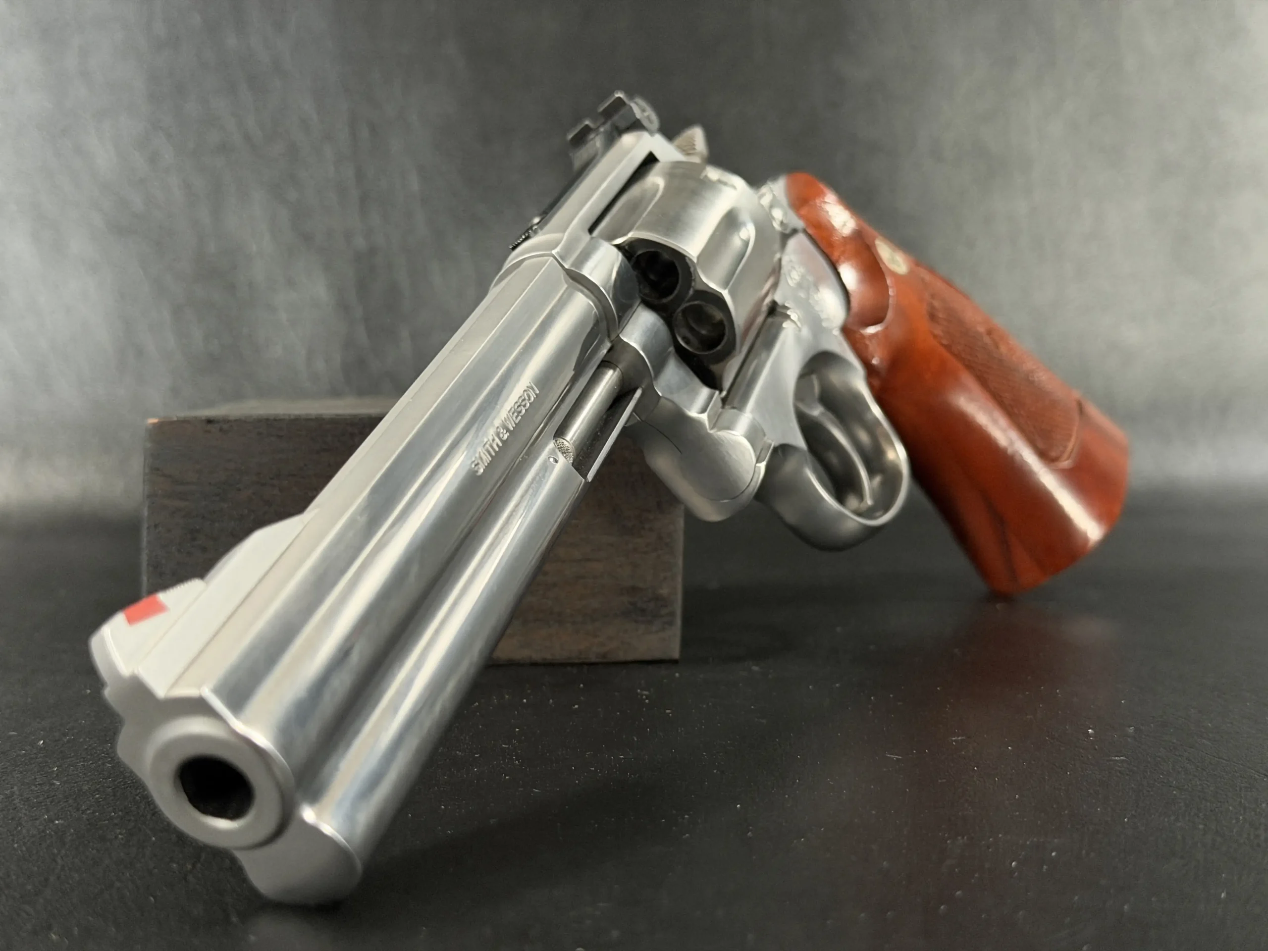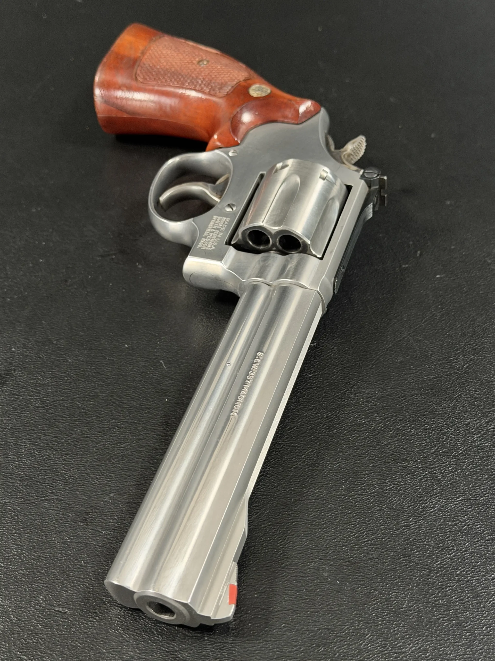 The revolver is fitted with checkered hardwood grips bearing the iconic Smith & Wesson medallions. Their warm tone contrasts beautifully against the cool stainless frame, creating a timeless aesthetic that feels both purposeful and refined. Subtle wear consistent with careful handling only adds to its authenticity, preserving the character expected of a piece with history.