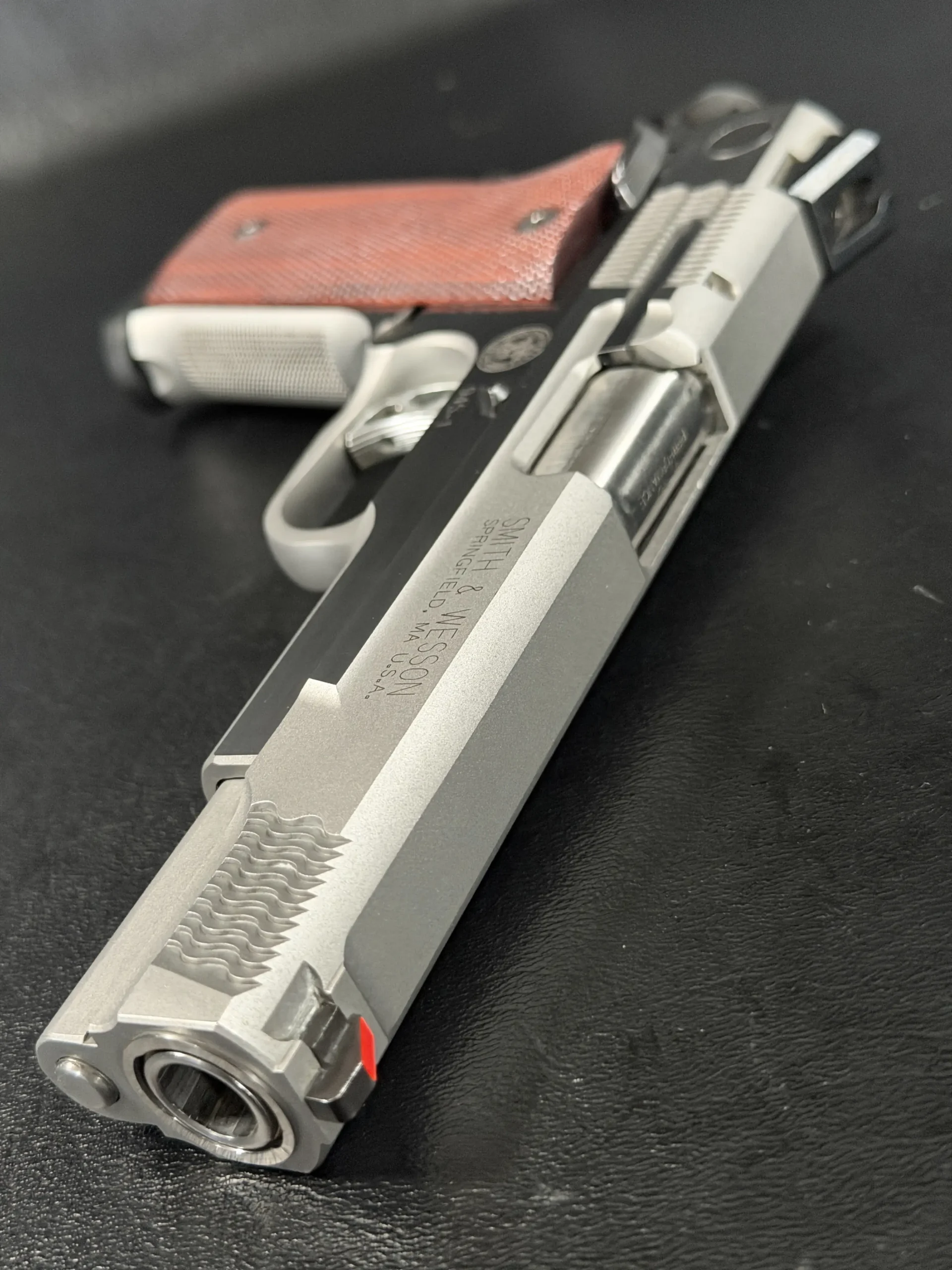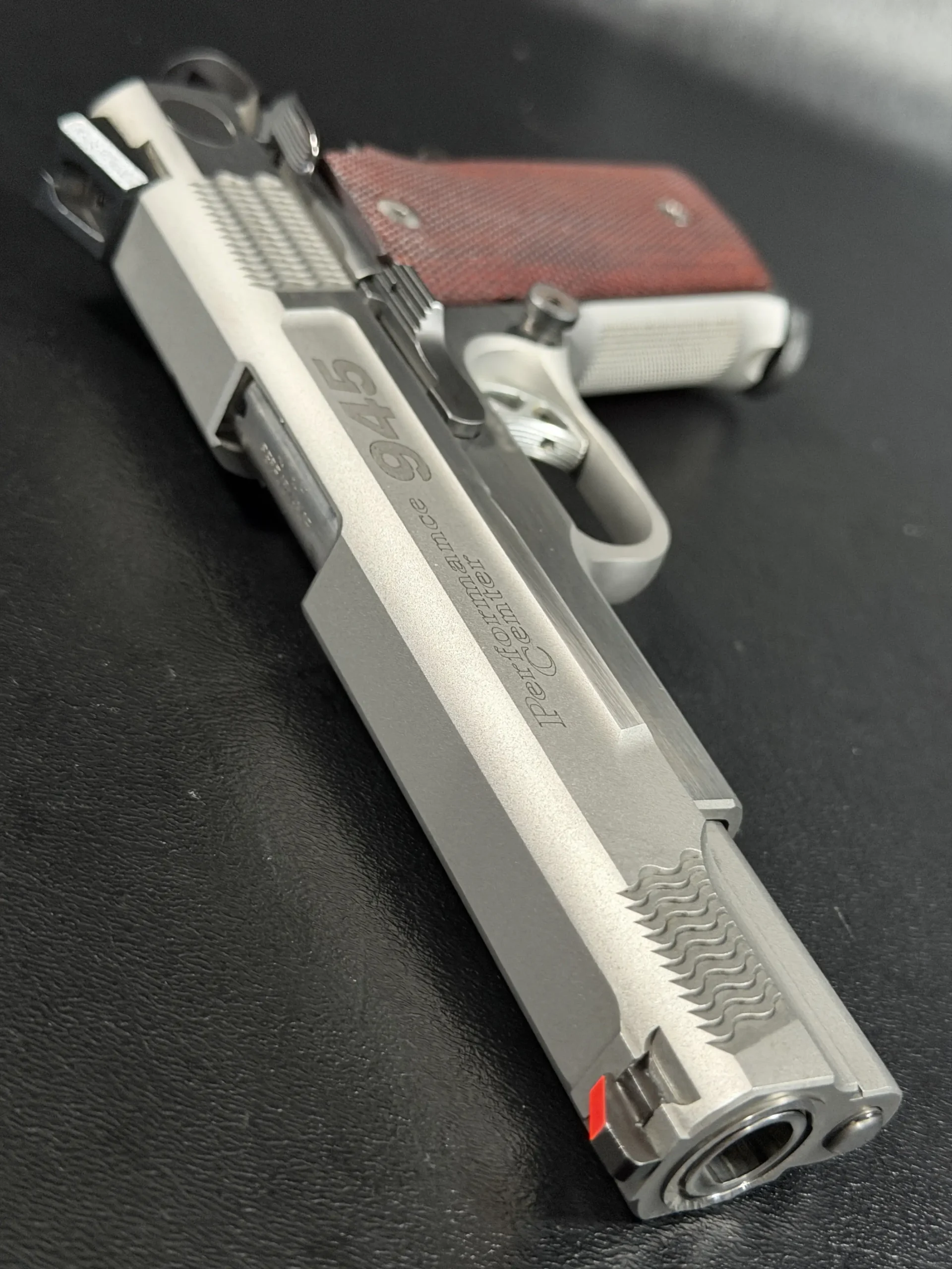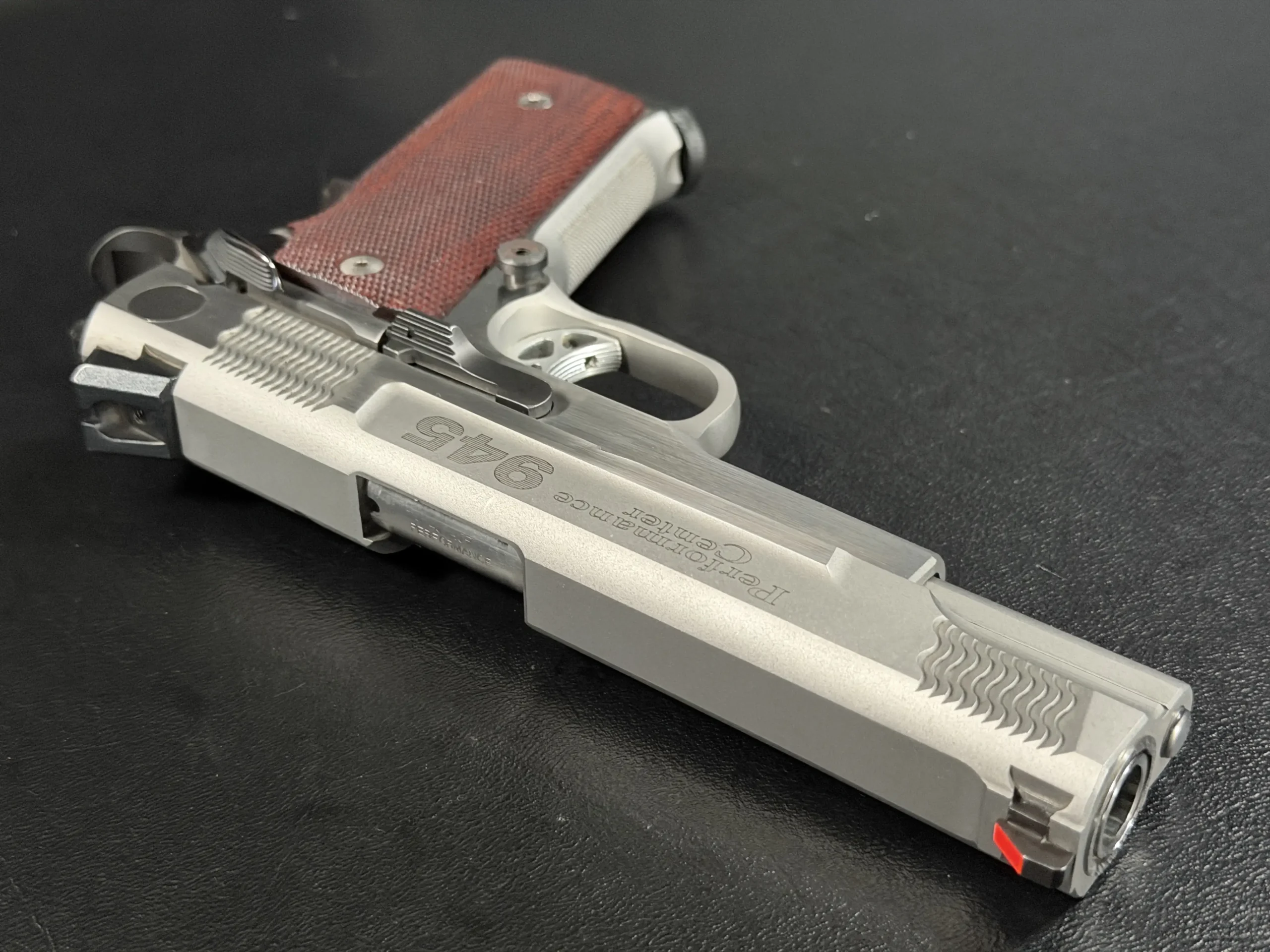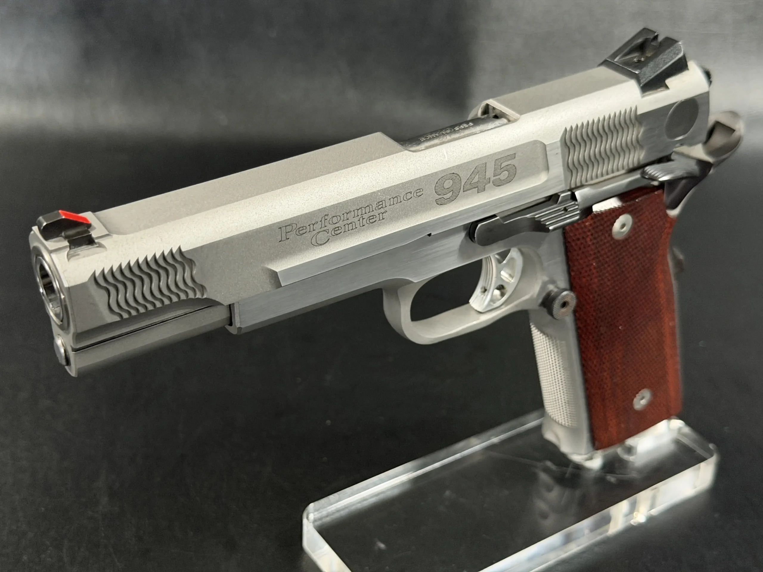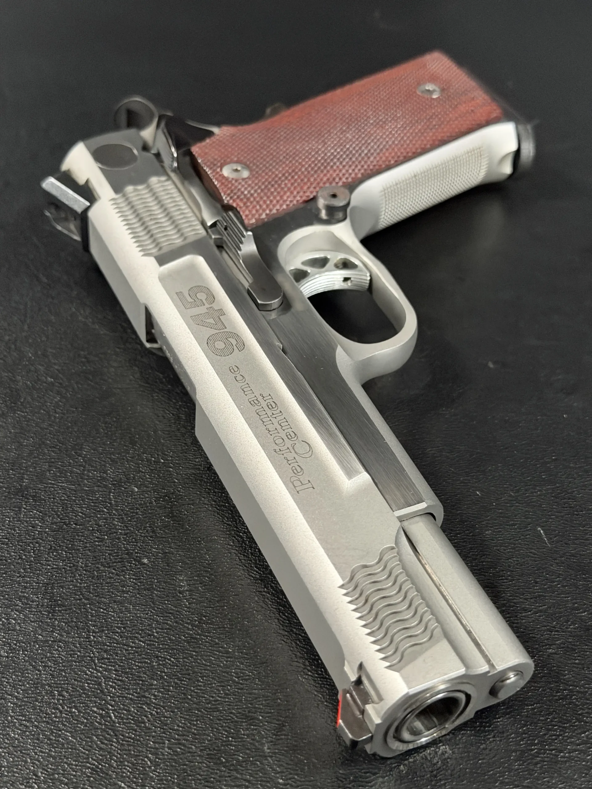 The pistol’s frame is machined with high-cut frontstrap geometry and finely executed checkering, providing excellent purchase while maintaining the clean aesthetic expected of a Performance Center build. Complementing the stainless steel construction are a set of rich red checkered grip panels, which add both visual warmth and functional control. These grips contrast beautifully against the brushed steel, creating a distinctive look that collectors often associate with early Performance Center pistols.