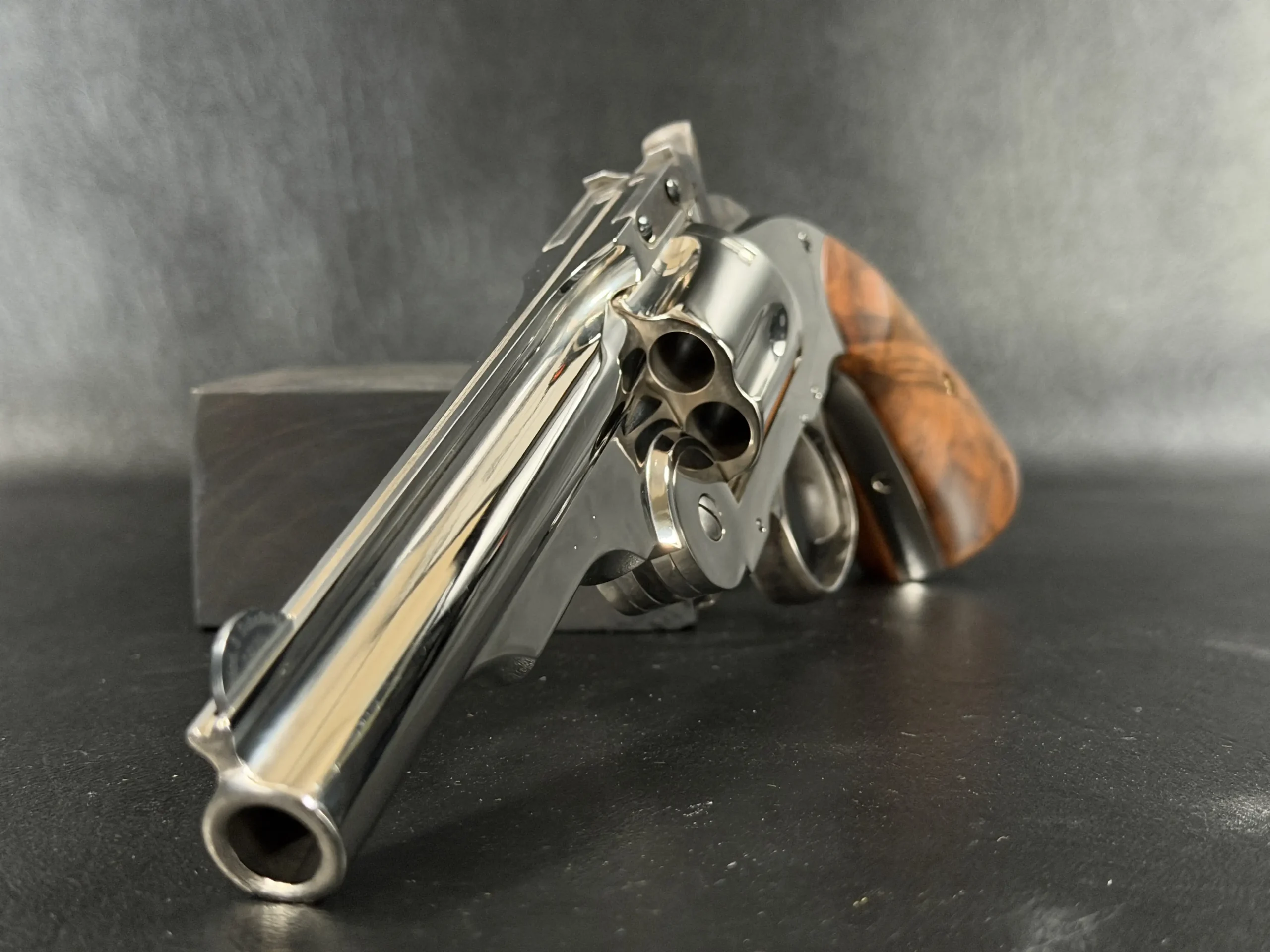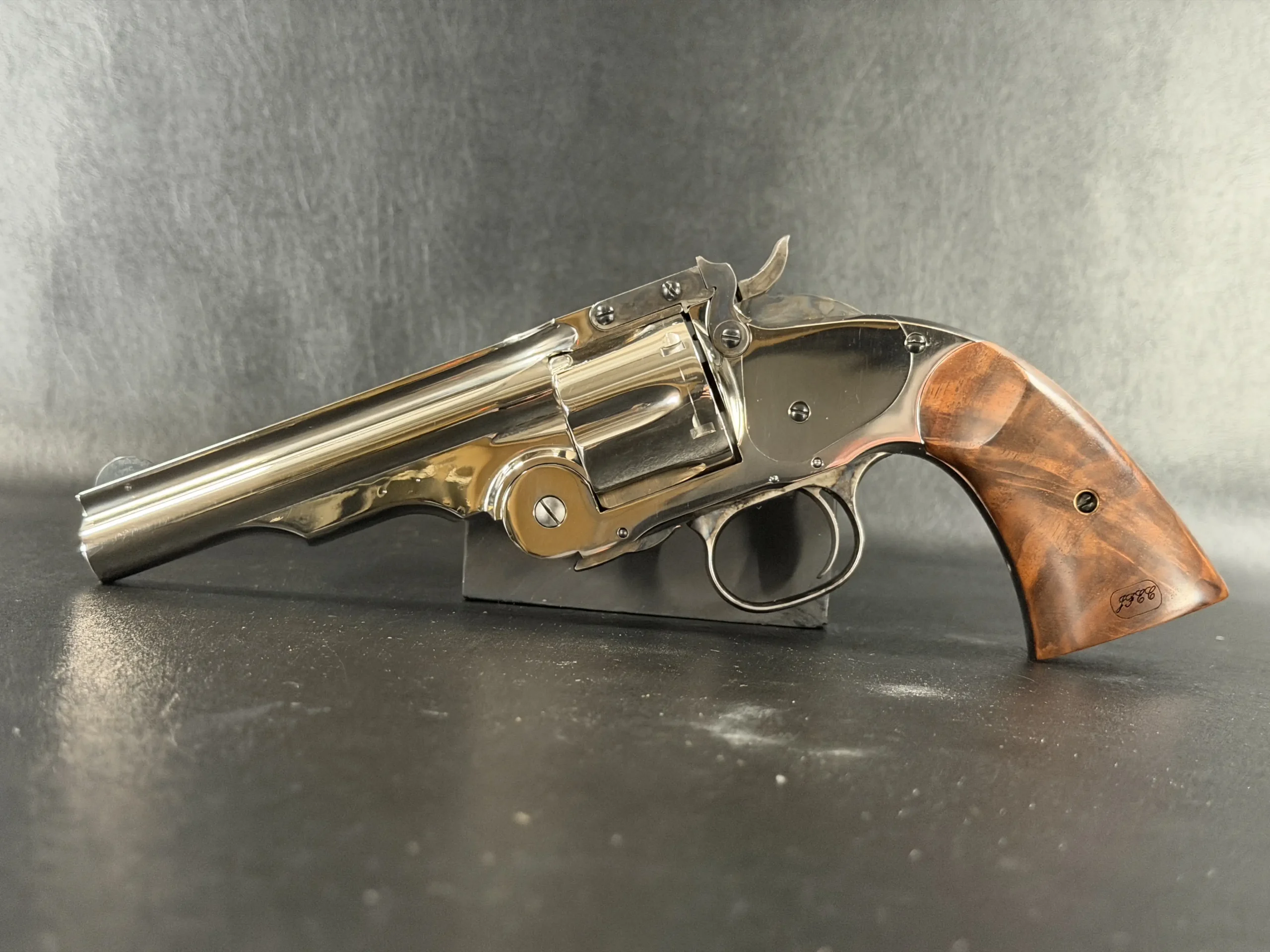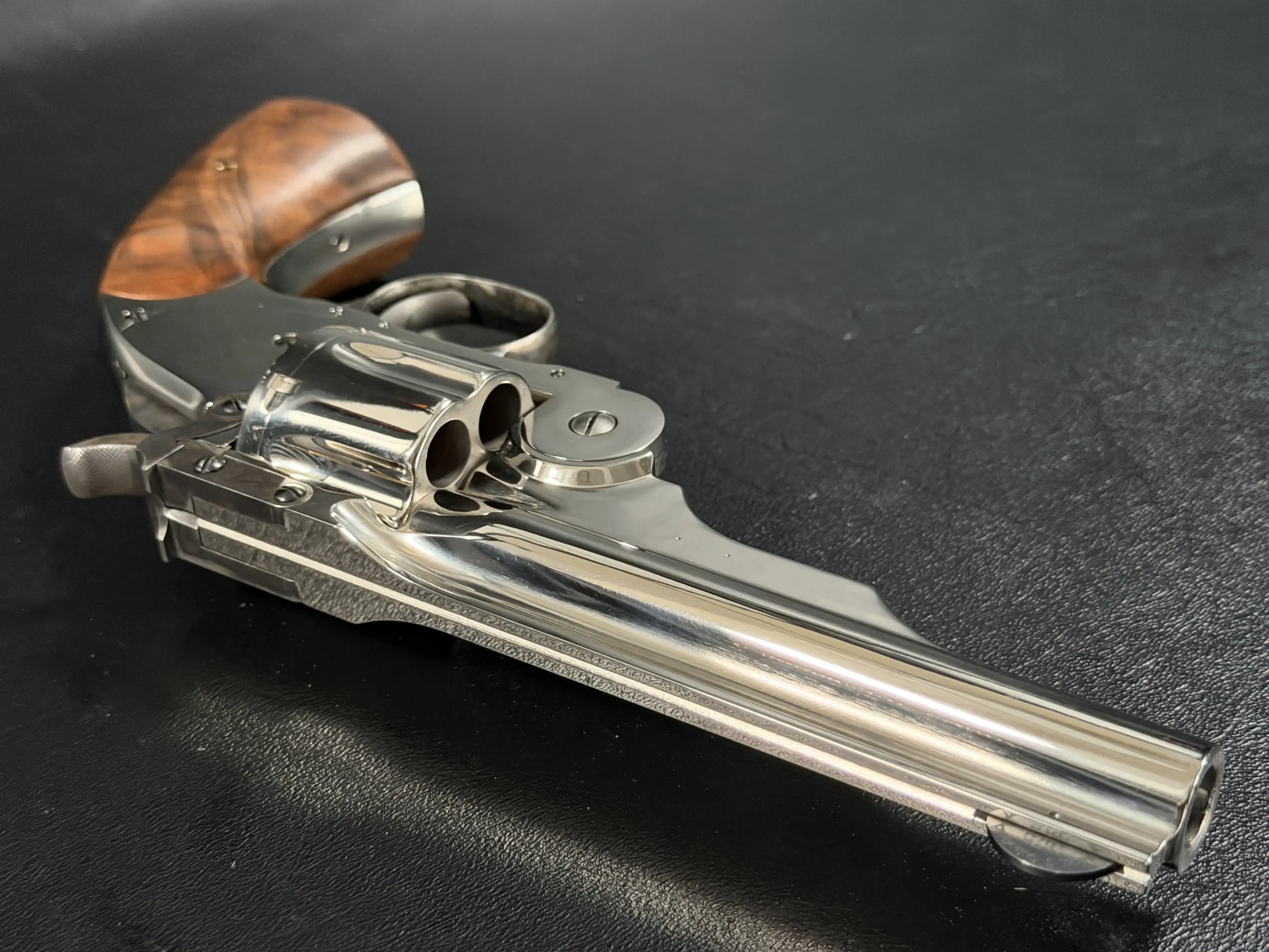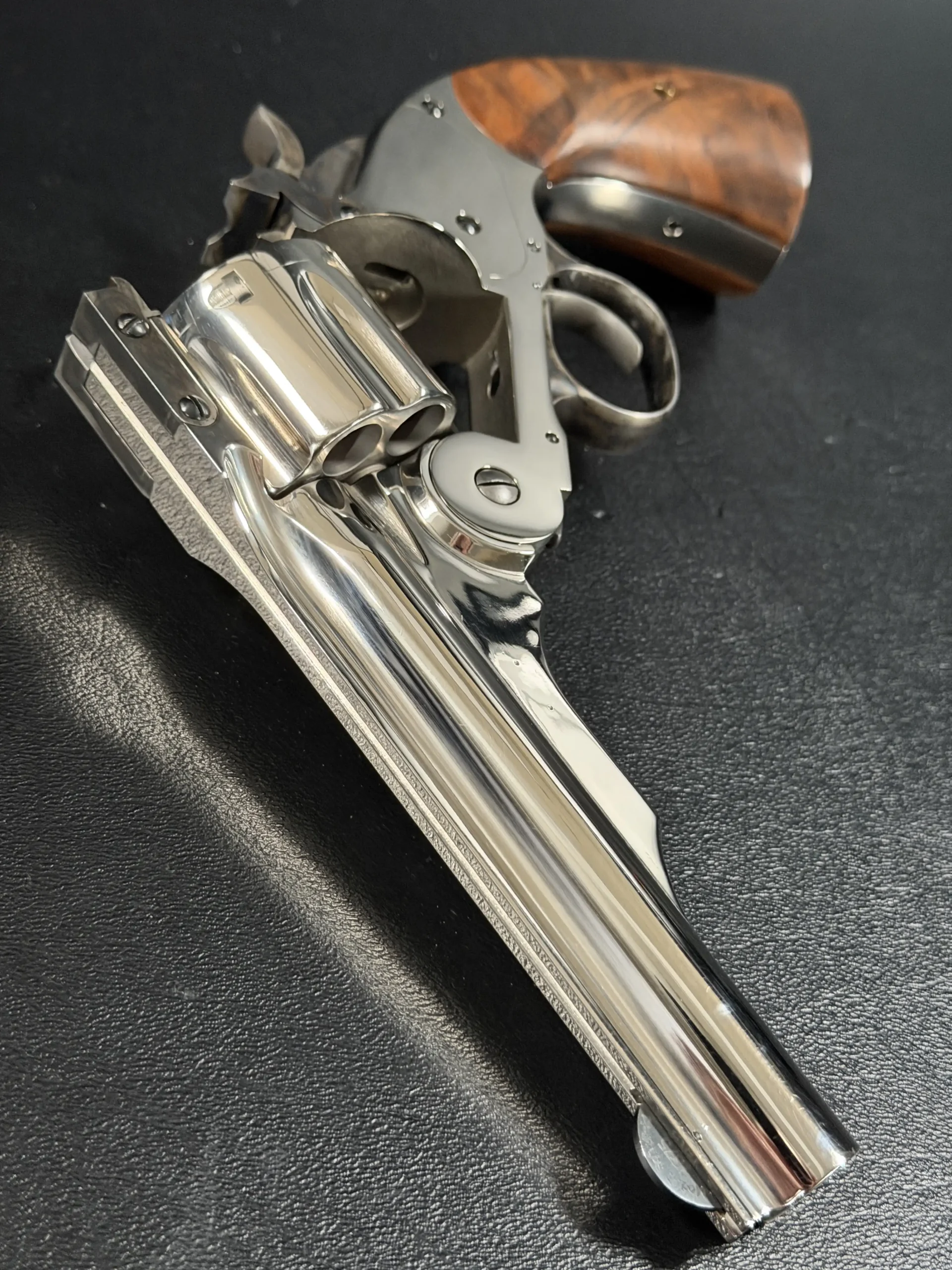 This first production example, chambered in .45 Smith & Wesson, reflects the revolver’s original military configuration while showcasing the craftsmanship that made Smith & Wesson a dominant force in late 19th-century handgun design. The polished metal surfaces exhibit a brilliant, almost mirror-like finish that contrasts beautifully with the warm tone of the walnut grips. The contours of the frame flow seamlessly into the barrel, giving the revolver an almost sculptural presence. More than a tool, it feels like an object of deliberate design.
