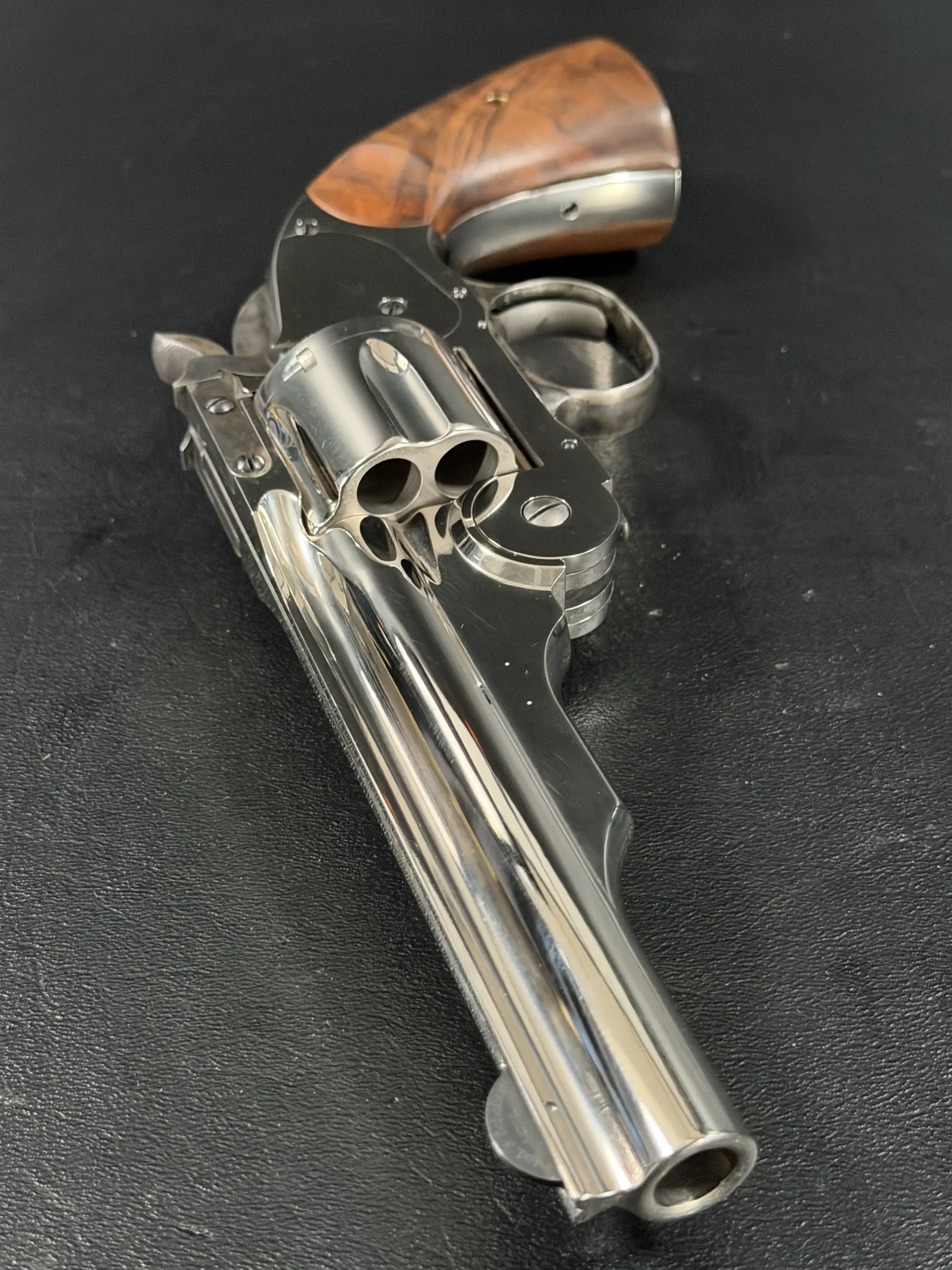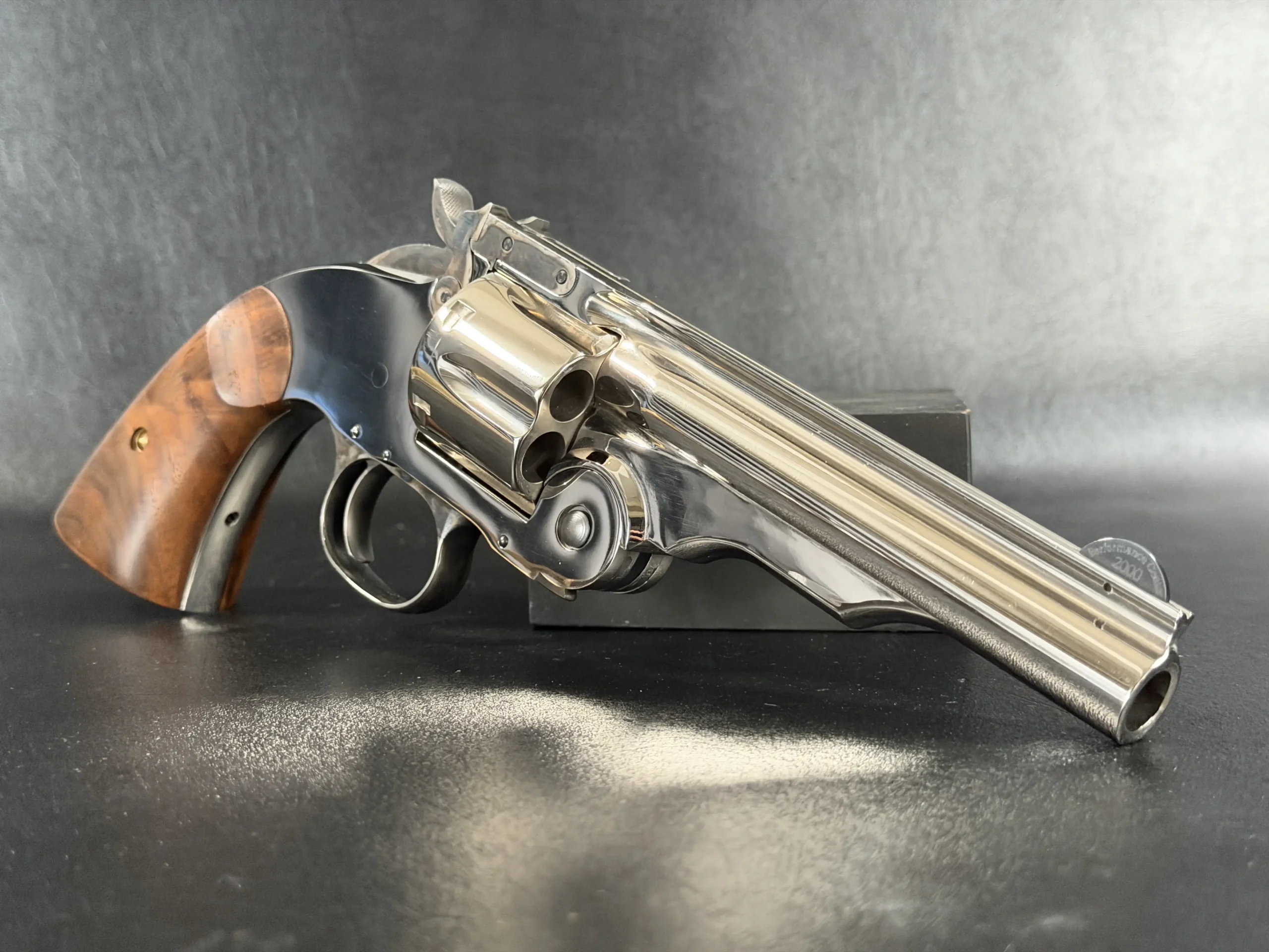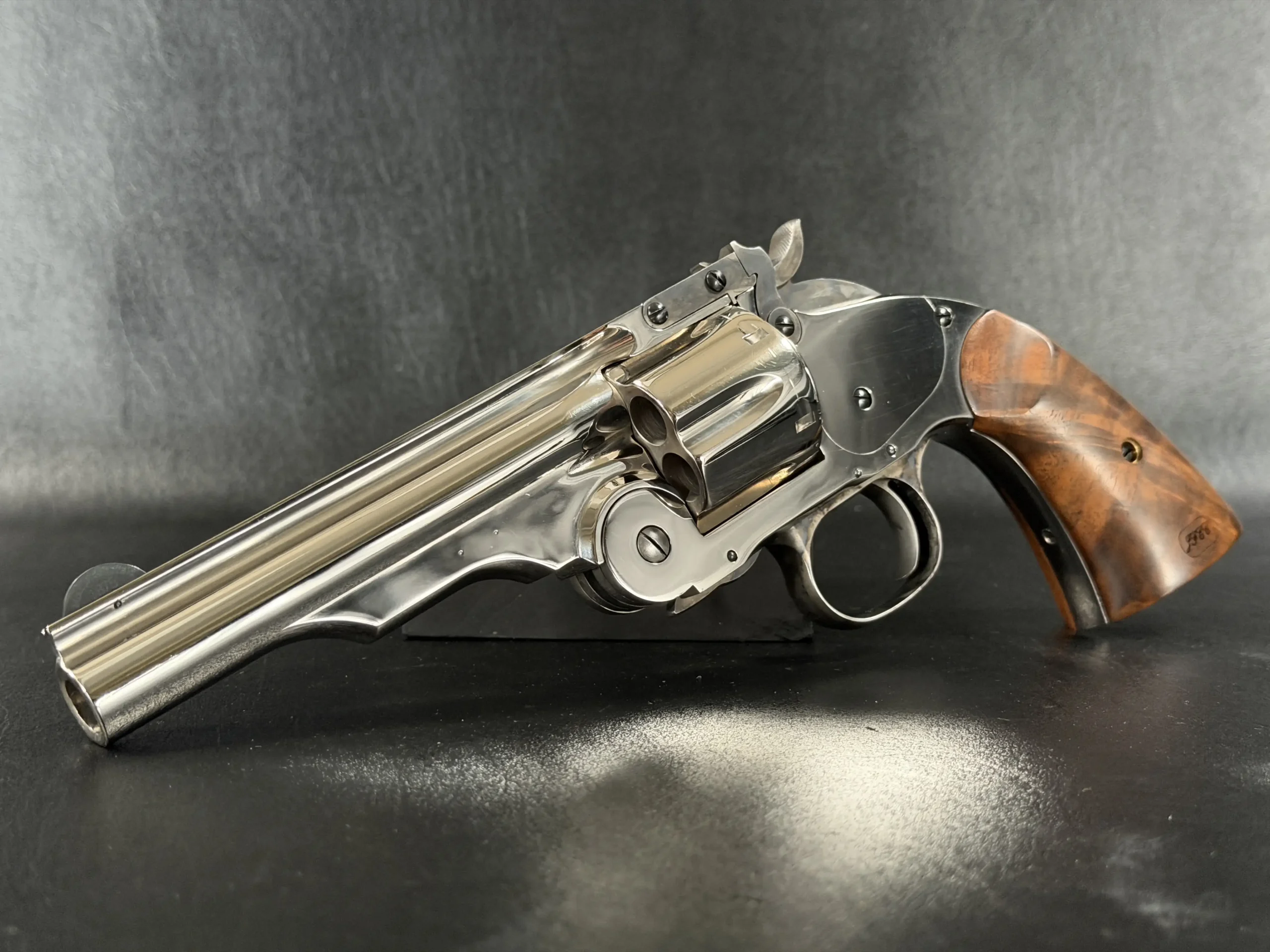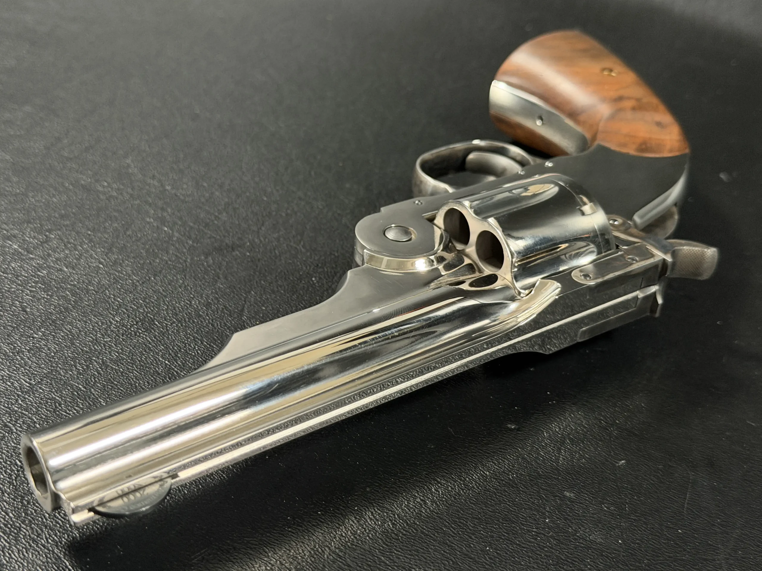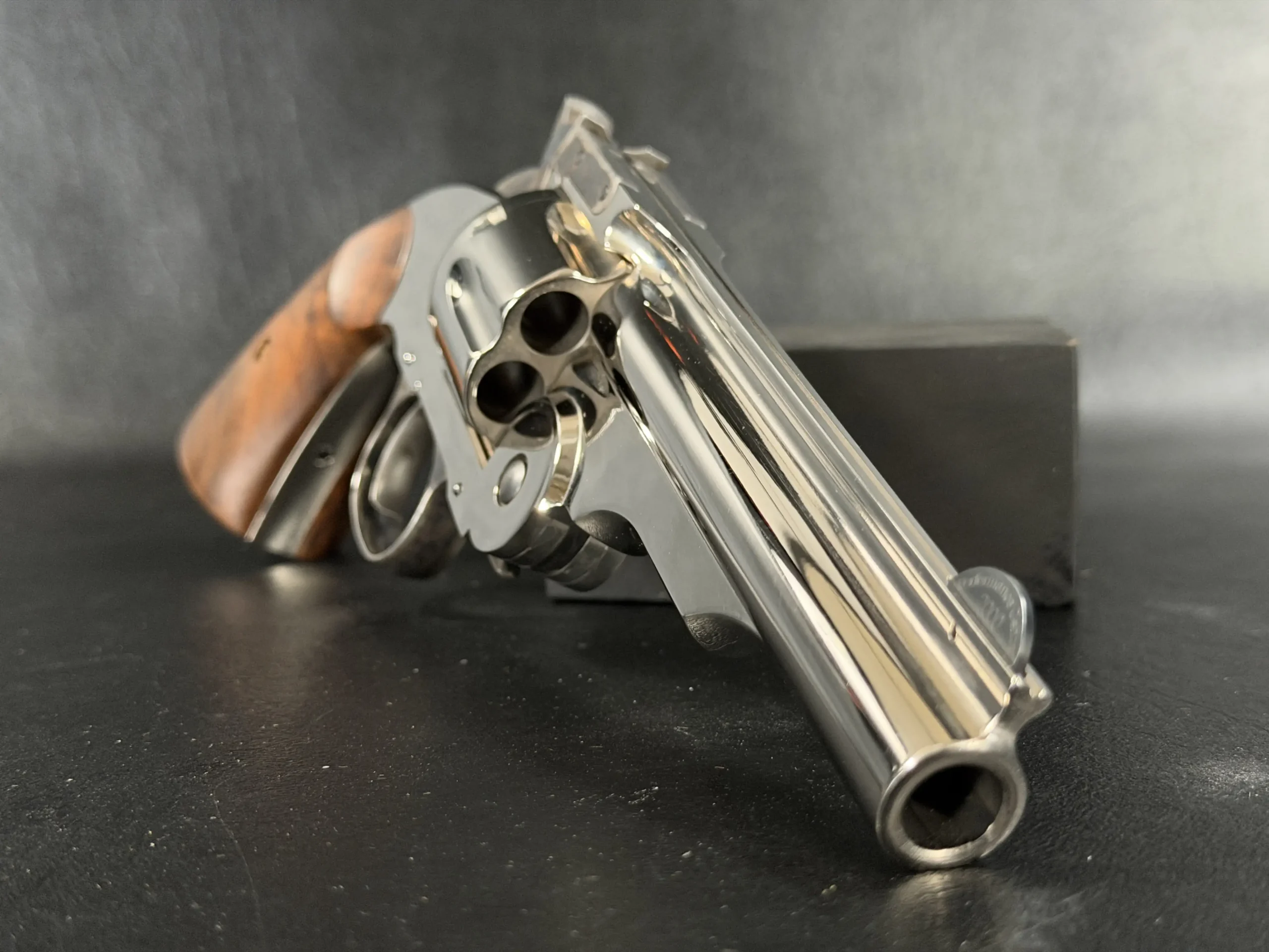 This first production example, chambered in .45 Smith & Wesson, reflects the revolver’s original military configuration while showcasing the craftsmanship that made Smith & Wesson a dominant force in late 19th-century handgun design. The polished metal surfaces exhibit a brilliant, almost mirror-like finish that contrasts beautifully with the warm tone of the walnut grips. The contours of the frame flow seamlessly into the barrel, giving the revolver an almost sculptural presence. More than a tool, it feels like an object of deliberate design.