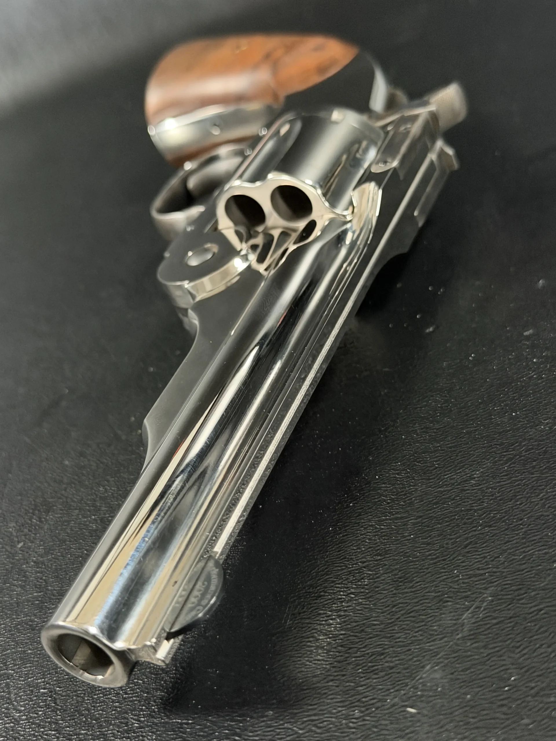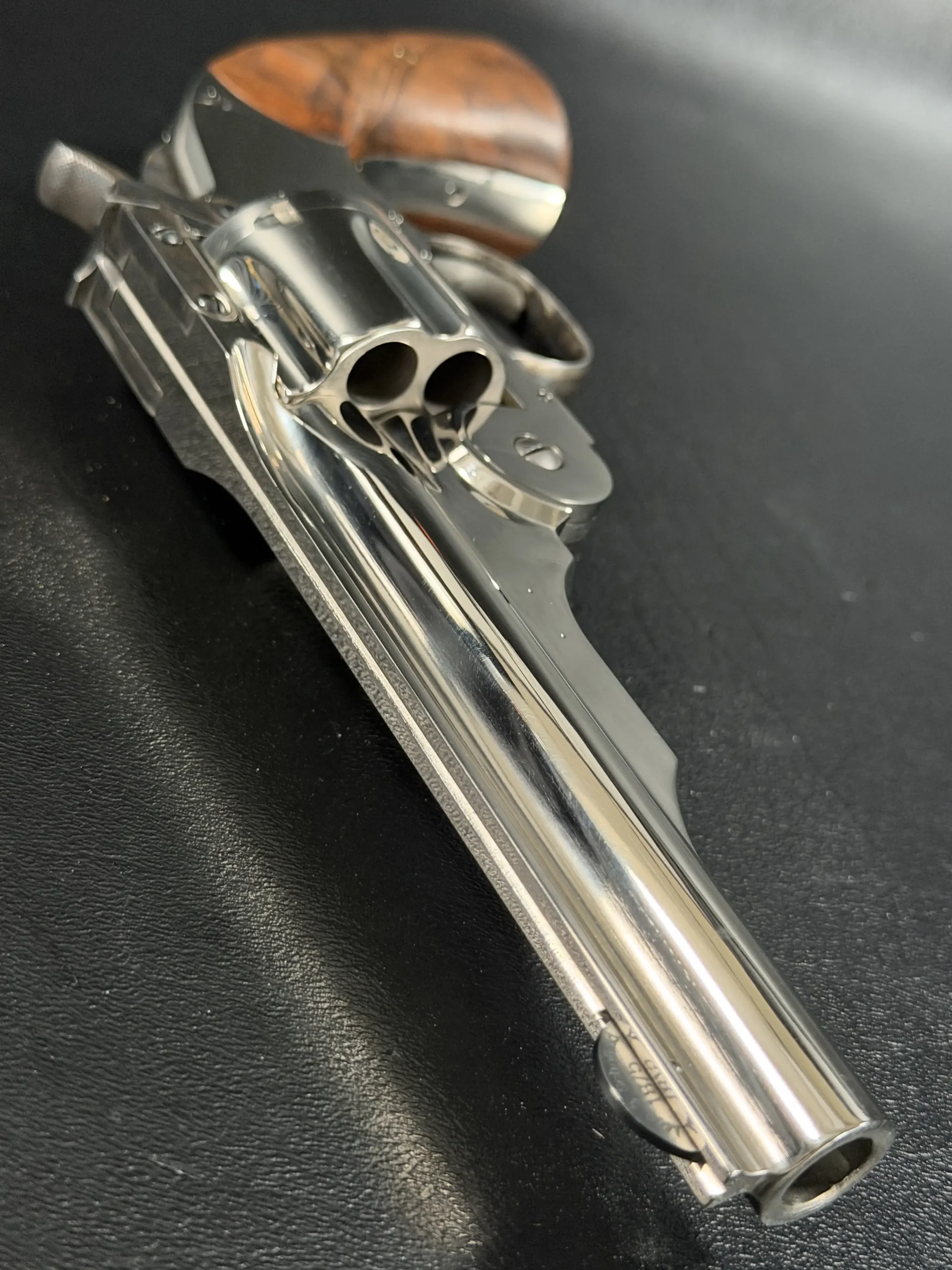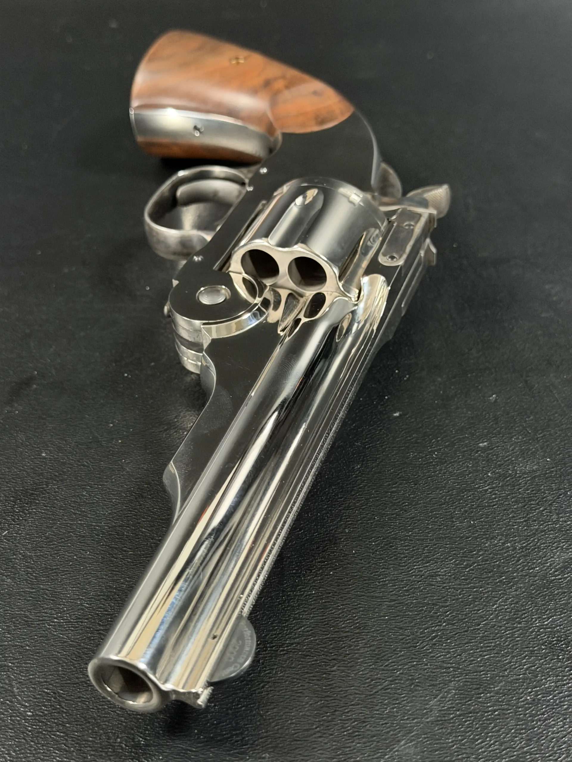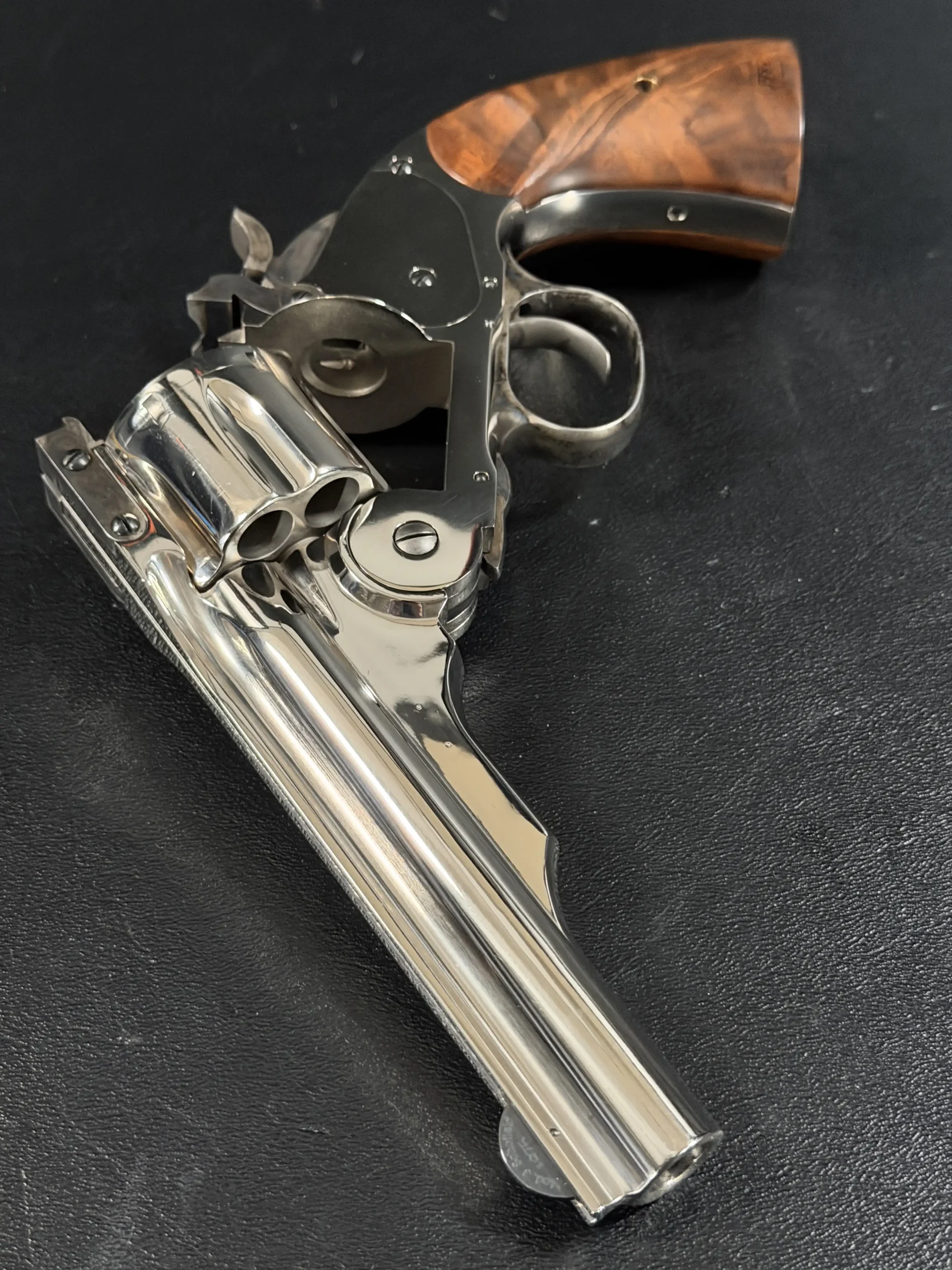 This first production example, chambered in .45 Smith & Wesson, reflects the revolver’s original military configuration while showcasing the craftsmanship that made Smith & Wesson a dominant force in late 19th-century handgun design. The polished metal surfaces exhibit a brilliant, almost mirror-like finish that contrasts beautifully with the warm tone of the walnut grips. The contours of the frame flow seamlessly into the barrel, giving the revolver an almost sculptural presence. More than a tool, it feels like an object of deliberate design.