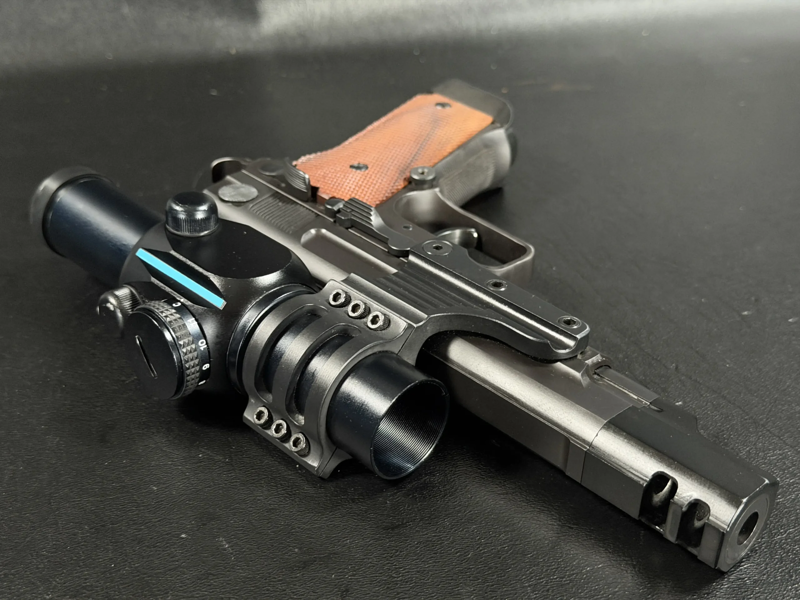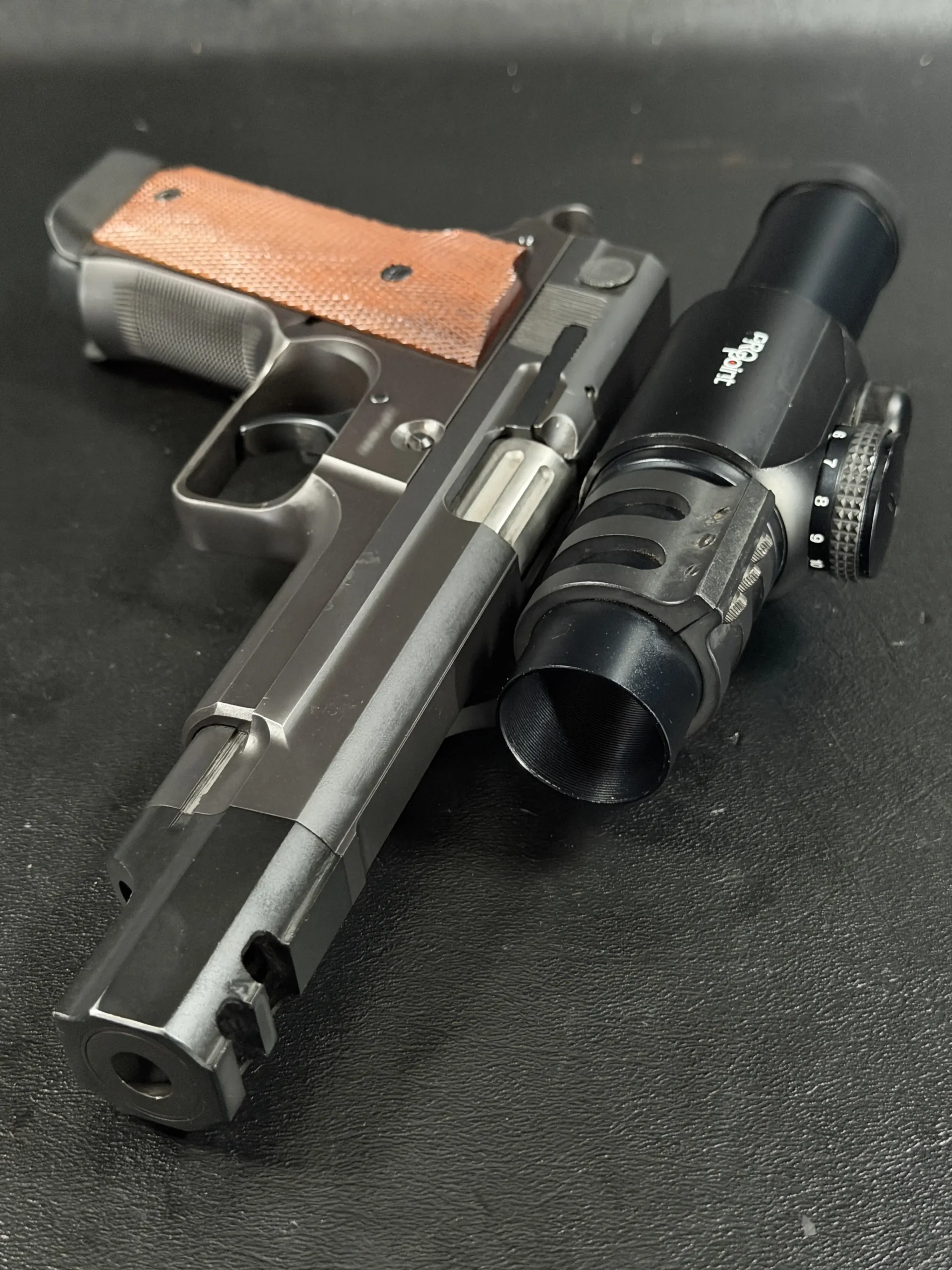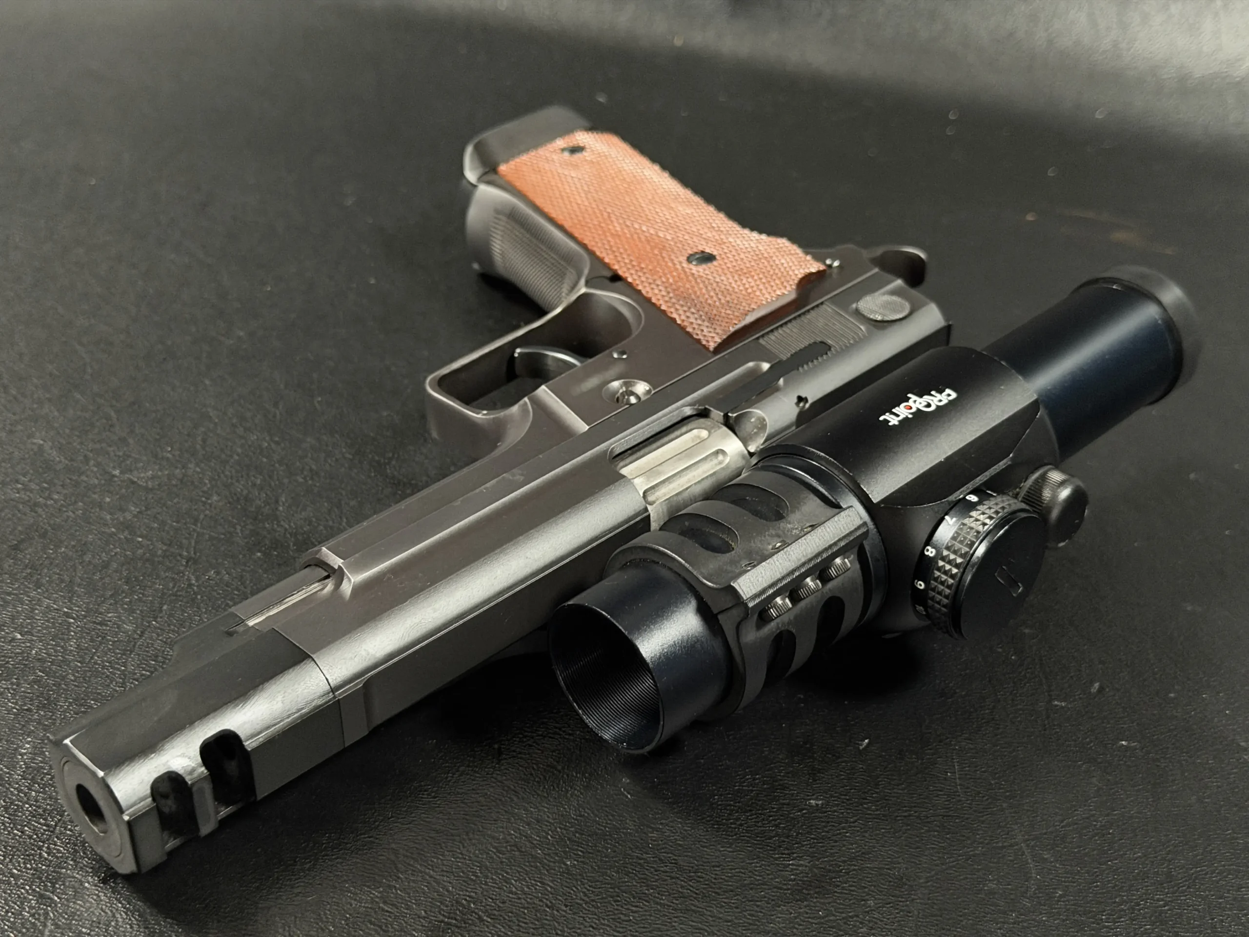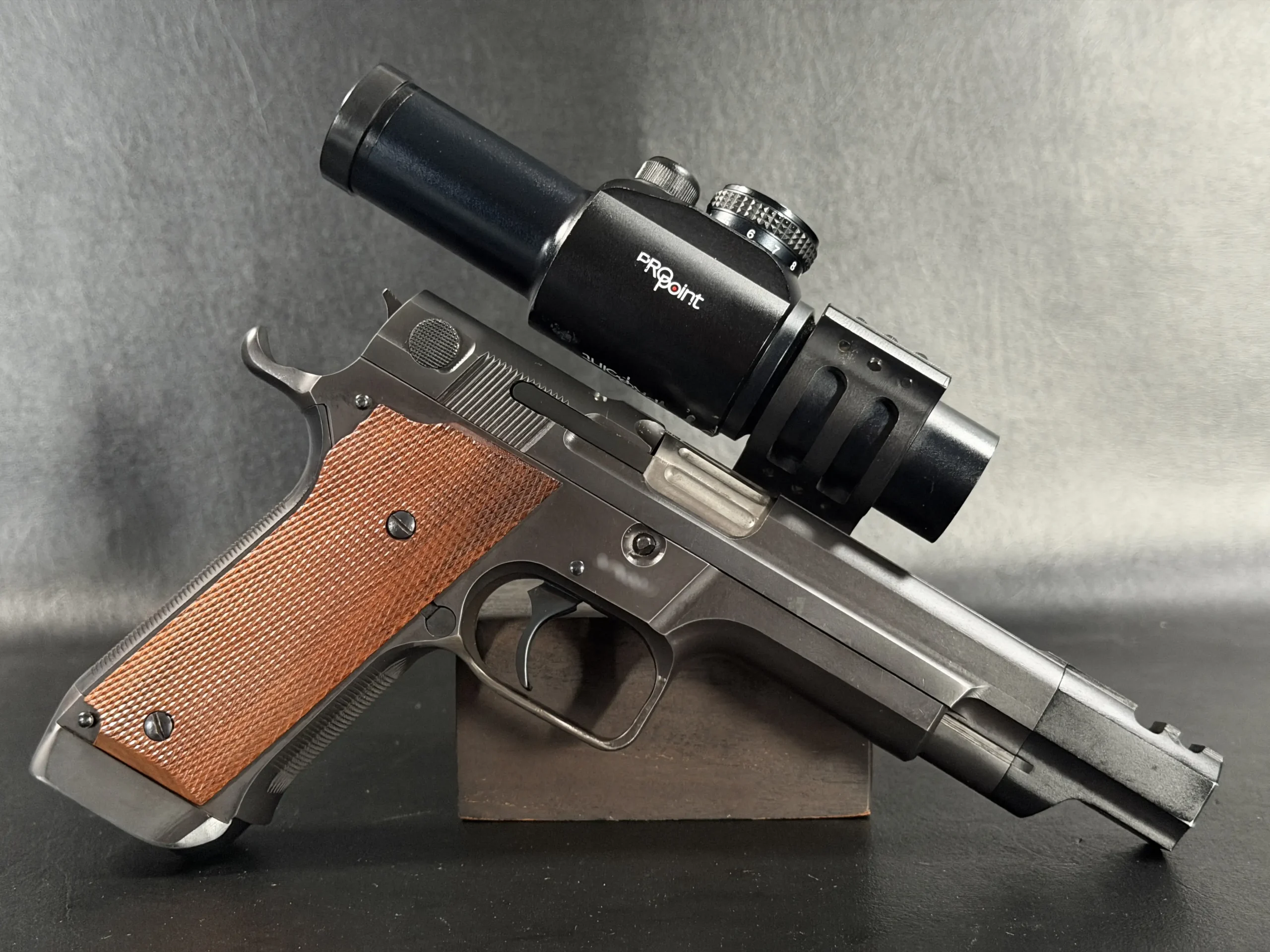 The pistol features a 5-inch barrel fitted with an integrated compensator, a configuration designed to reduce muzzle rise and enable faster follow-up shots in competition. A frame-mounted optic system supports the period-correct Aimpoint ProPoint electronic sight, a hallmark accessory seen on many early IPSC race guns. This mounting system keeps the optic stationary relative to the frame rather than the slide, preserving durability and maintaining a consistent sight picture during rapid fire.