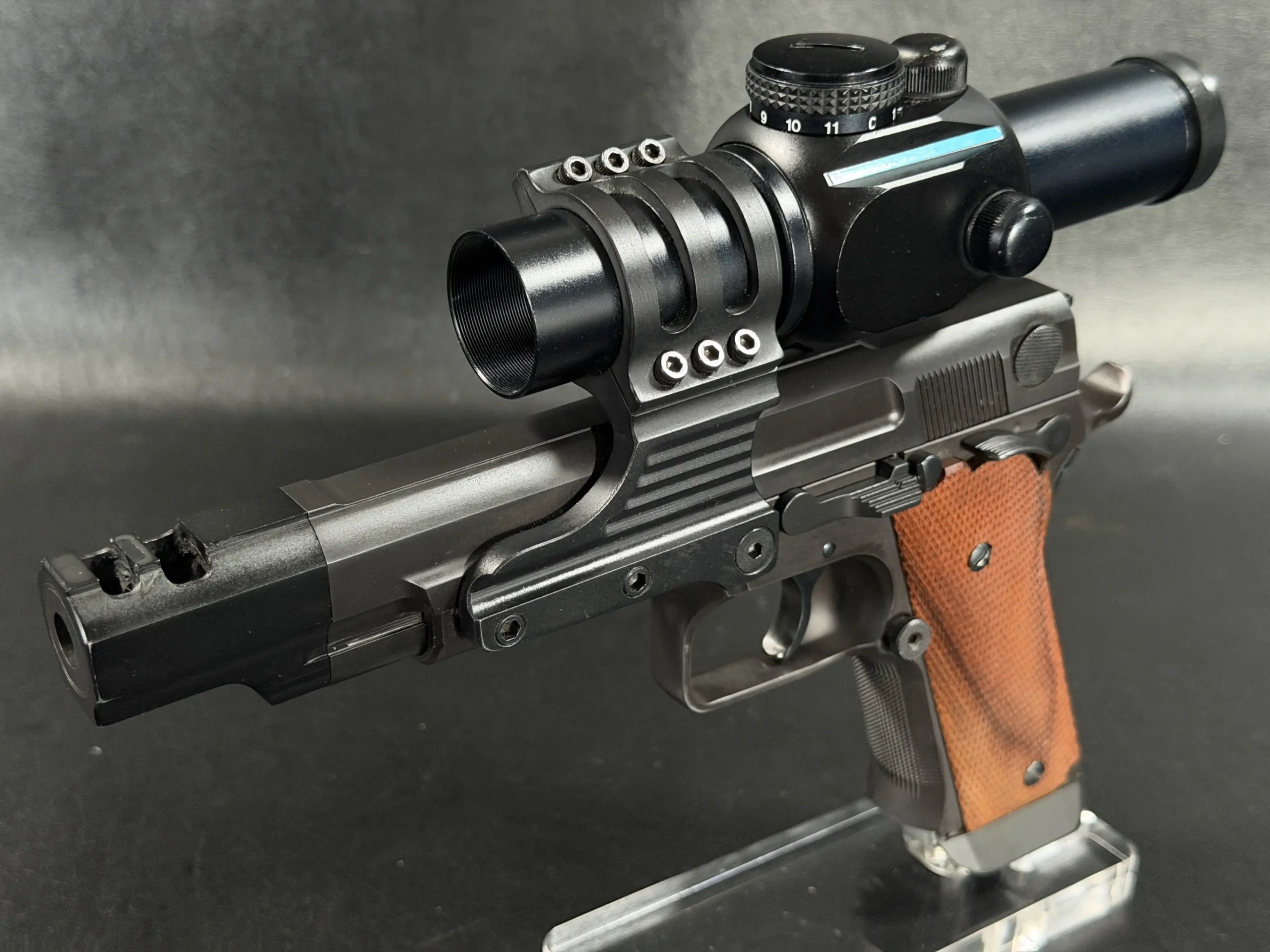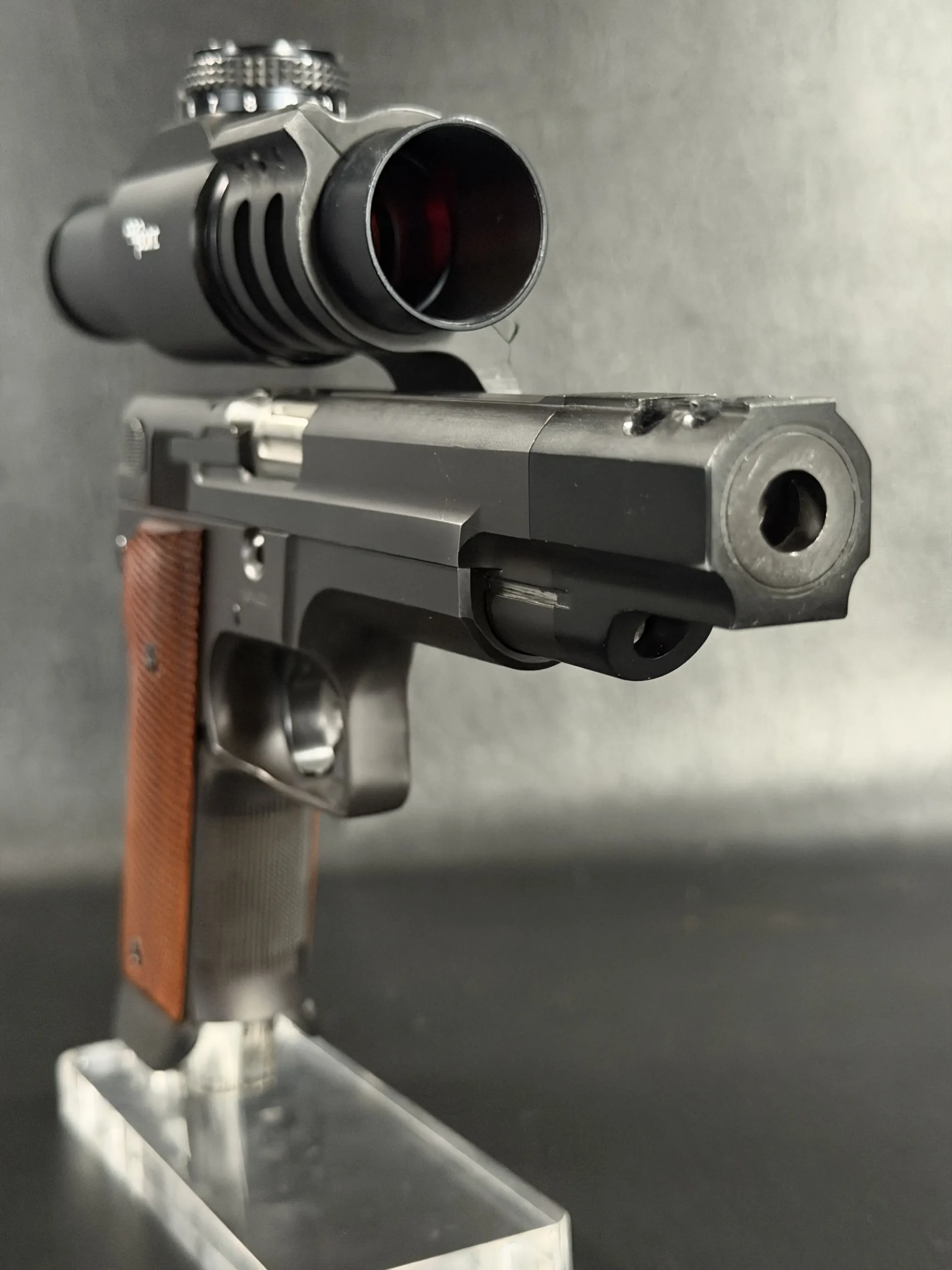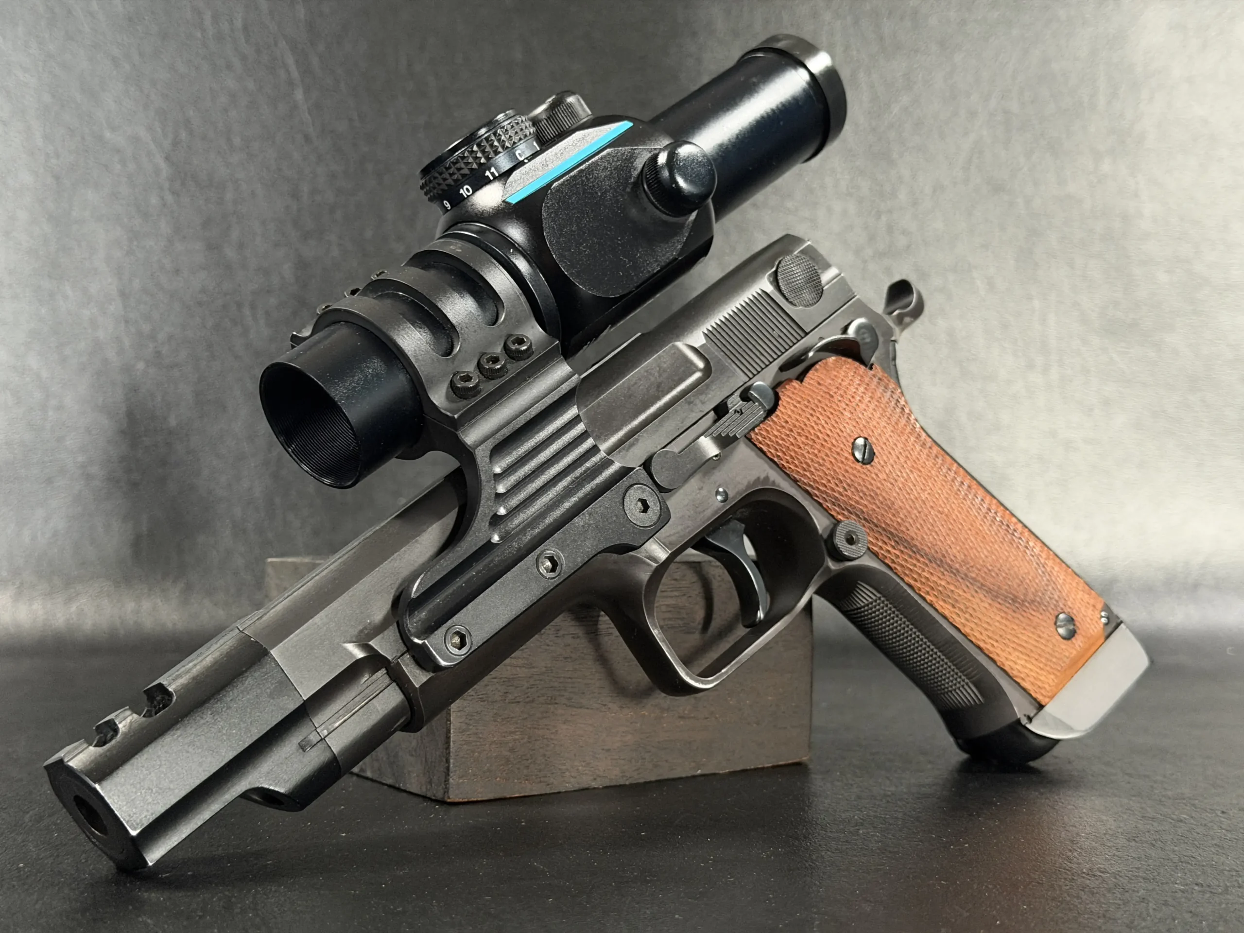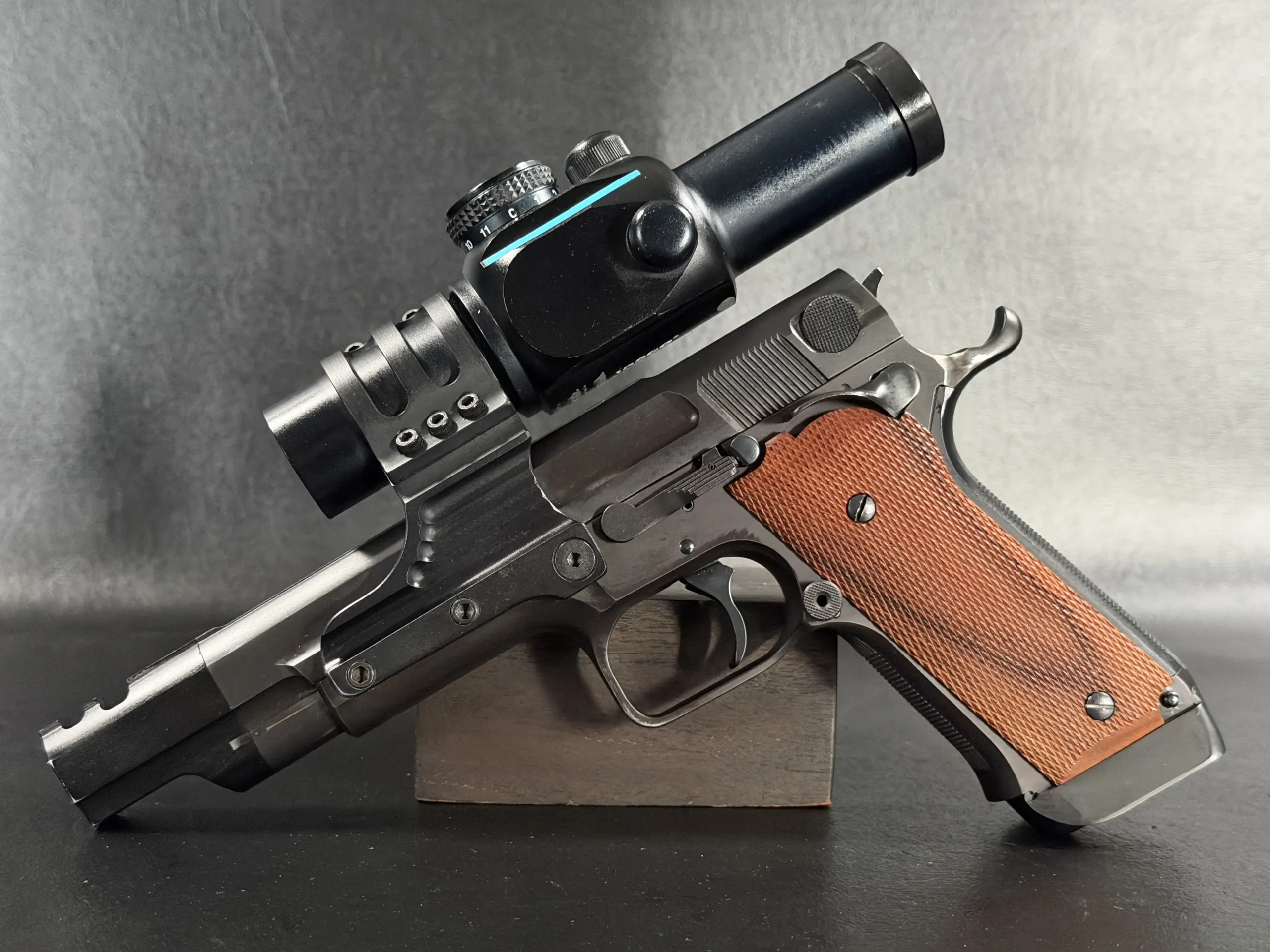 Visually, the pistol carries the purposeful aesthetic of a competition firearm built for performance rather than ornamentation. The black finished steel construction, combined with checkered wood grips, reflects the design language of early 1990s Performance Center builds. The large compensator, extended dust cover profile, and distinctive optic mount create a silhouette that immediately identifies the pistol as a serious competition tool from the golden age of practical shooting.
