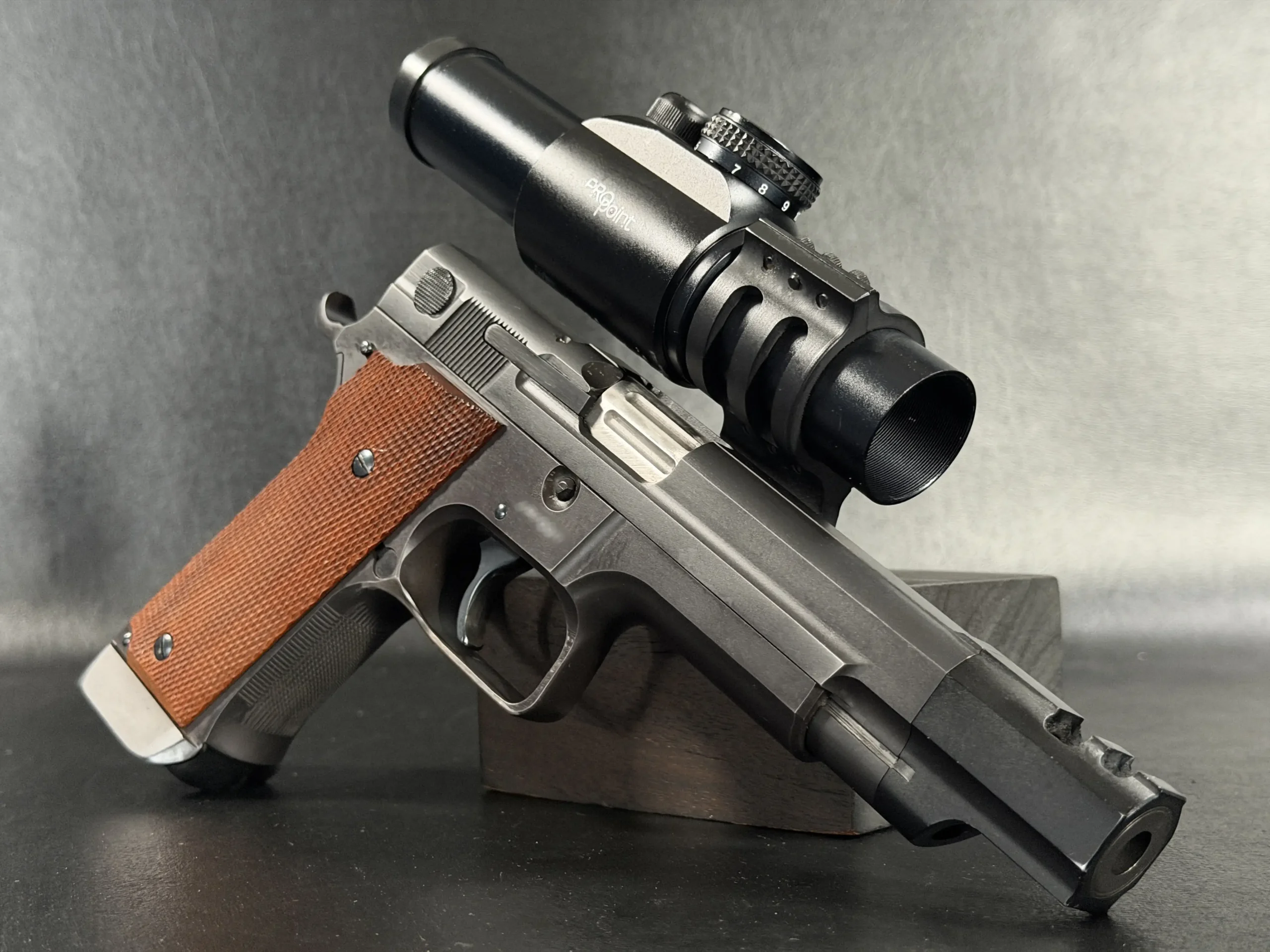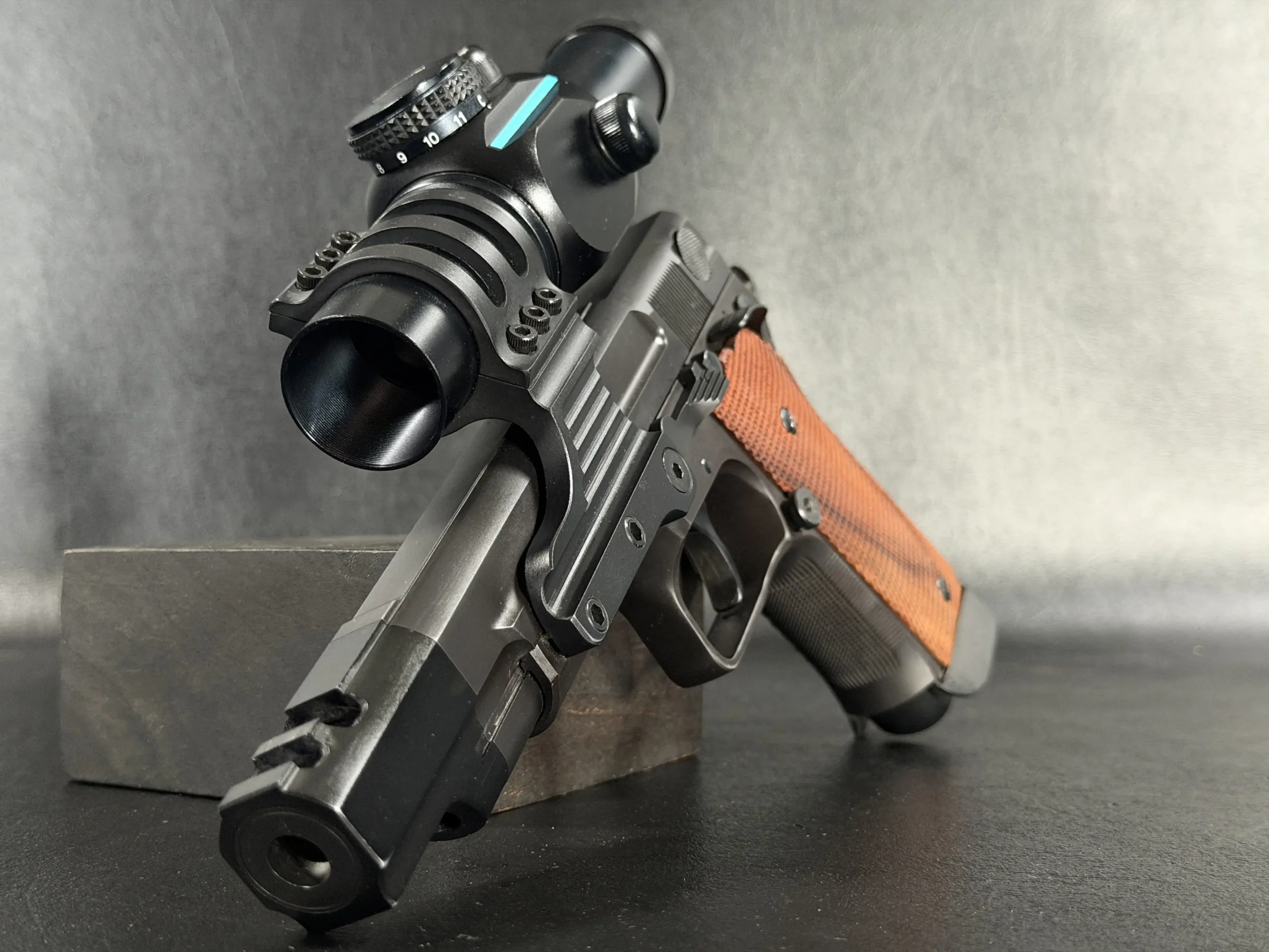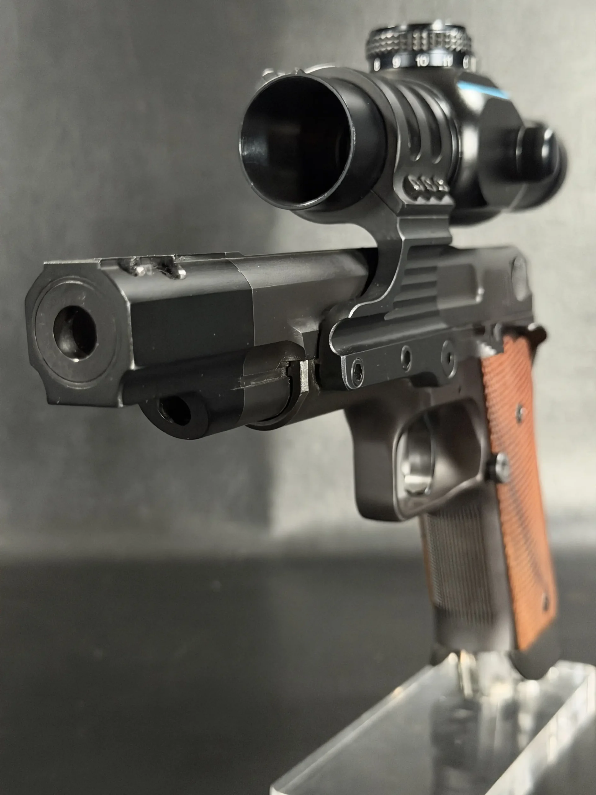 Visually, the pistol carries the purposeful aesthetic of a competition firearm built for performance rather than ornamentation. The black finished steel construction, combined with checkered wood grips, reflects the design language of early 1990s Performance Center builds. The large compensator, extended dust cover profile, and distinctive optic mount create a silhouette that immediately identifies the pistol as a serious competition tool from the golden age of practical shooting.