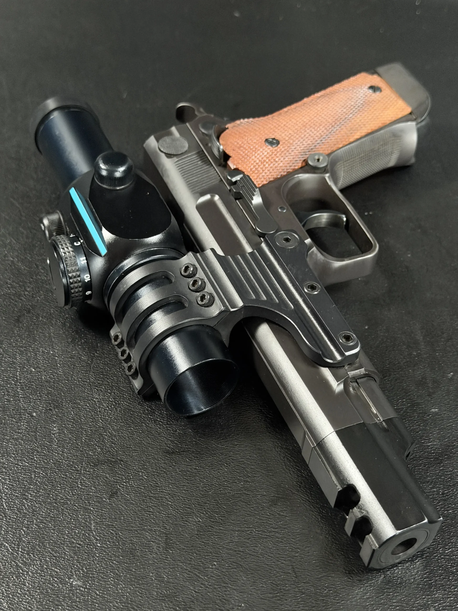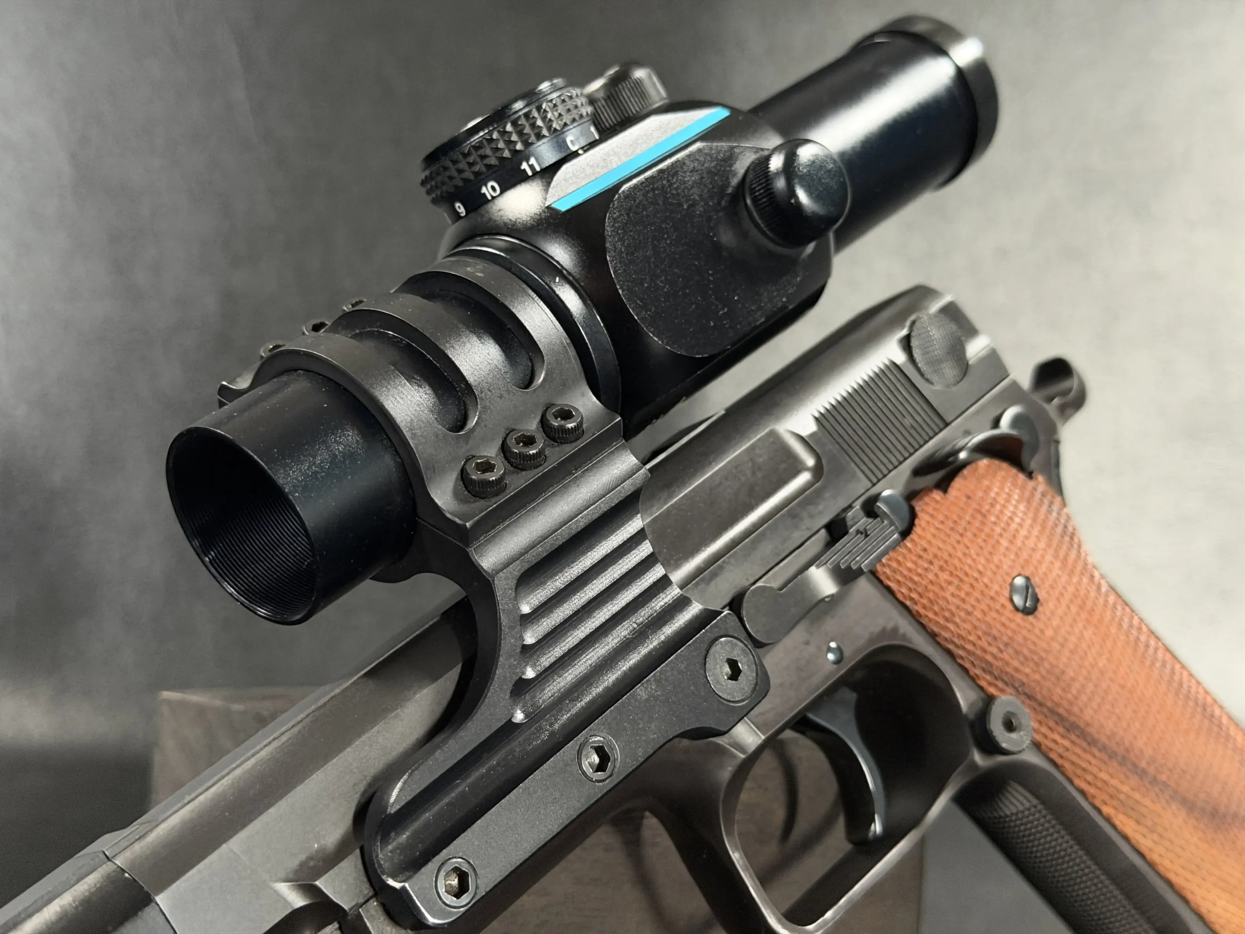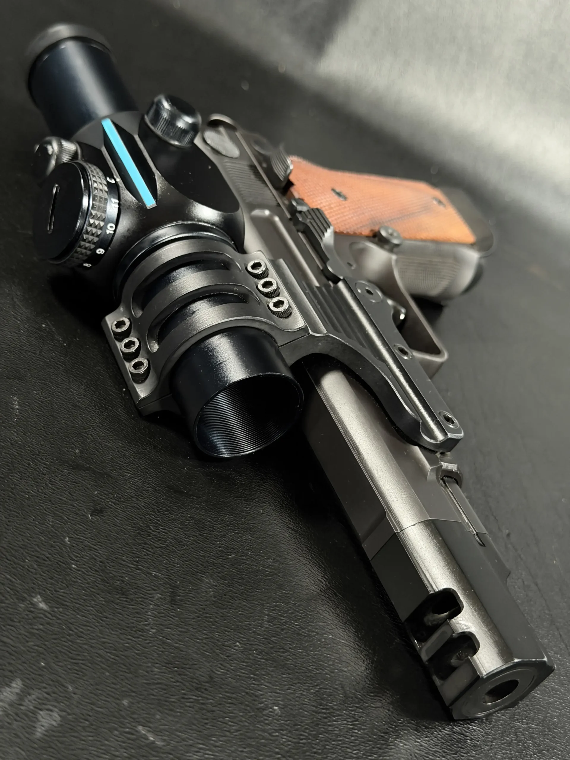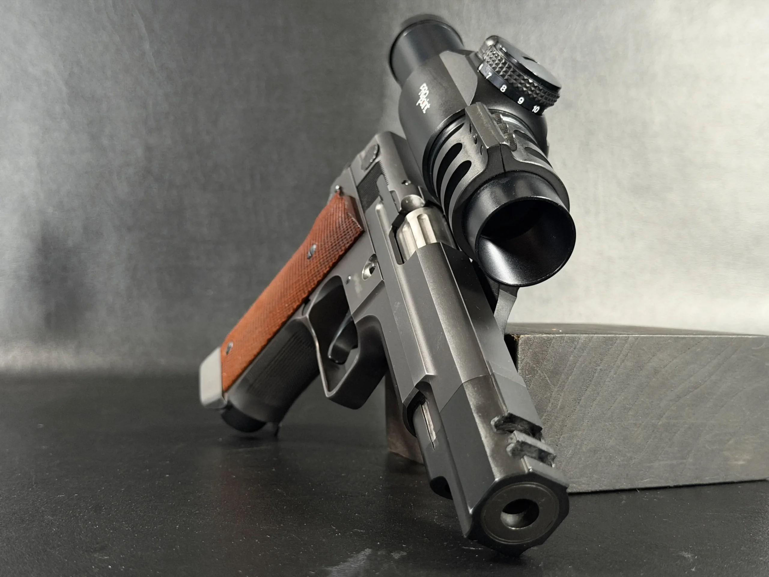Visually, the pistol carries the purposeful aesthetic of a competition firearm built for performance rather than ornamentation. The black finished steel construction, combined with checkered wood grips, reflects the design language of early 1990s Performance Center builds. The large compensator, extended dust cover profile, and distinctive optic mount create a silhouette that immediately identifies the pistol as a serious competition tool from the golden age of practical shooting.