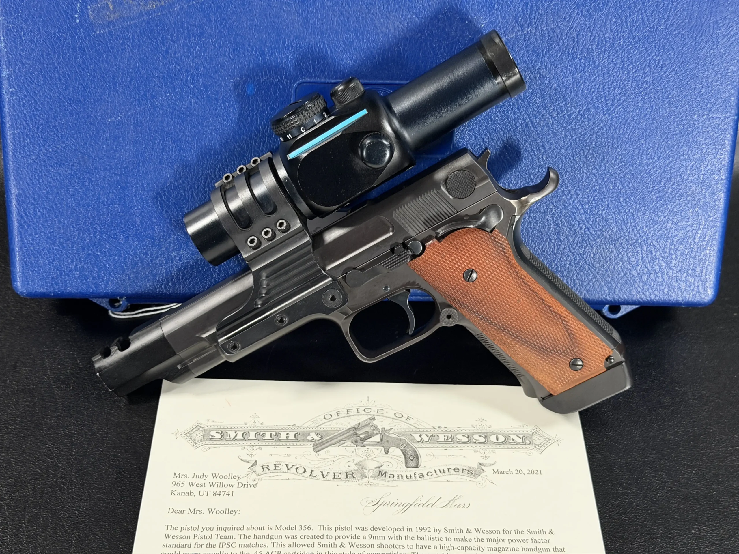 This particular pistol represents an especially significant example of the model. According to Smith & Wesson historical records, it was specially built in July 1992 for champion shooter Judy Woolley, one of the most accomplished competitors in practical shooting at the time. As a prototype Performance Center build created during the platform’s early development, it embodies the experimental spirit and precision craftsmanship that defined Smith & Wesson’s competition program.