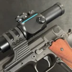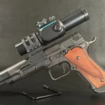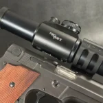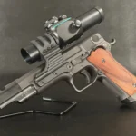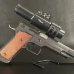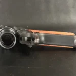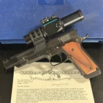 The left side of the Smith & Wesson Model 356TS&W has been drilled and tapped for a custom optical sight mount, which also supports a fully functional Tasco Propoint. The checkered walnut grips are in as-new condition. Although Judy Woolley attempted to make significant power with this firearm, she notes that it never quite met the grade. Despite being used in both IPSC and USPSA competitions, it has seen limited use, with an estimated total round count of around 200, according to Woolley.