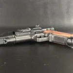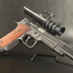 In line with other examples, the slide-mounted safety has been removed and replaced with a checkered plug, aiding in the withdrawal of the slide. The frame has been extended to create a beavertail protector above the web of the hand, and the trigger guard has been squared in front, with both front and backstraps neatly hand-checkered by the custom shop. The pistol operates with a manual safety, is single-action only, and features an extended magazine release, along with a large magazine funnel for efficient reloading.