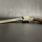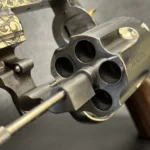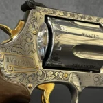 But what sets this revolver apart—aside from its size—is the sheer artistry packed into its massive cylinder. Between each flute, you’ll find the words DEFENDING / FREEDOM / FAMILY / COUNTRY / HOME, each one carved in steel like a vow. And the details? Every inch speaks of care: the trigger, hammer, cylinder release, and even the side plate screws are plated in 24-karat gold. It’s not just for show, either—those enhancements give the action a buttery-smooth feel that’s hard to forget once you’ve thought it.