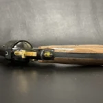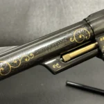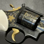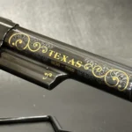 This isn’t just any revolver. It’s number 142 out of a tiny run of just 150 pieces—a rarity by any collector’s standard. Commissioned for the Texas Sesquicentennial, this deluxe edition is a full-blown celebration of Lone Star pride. The craftsmanship? Flawless. You’ll notice it in the finely hand-engraved scrollwork, the gold wire inlay, and those elephant ivory target stocks—scrimshawed by hand with a level of detail that demands a second look. Even the small parts are treated like royalty—gold-plated hammer, trigger, ejector rod, and cylinder latch gleam with understated class.