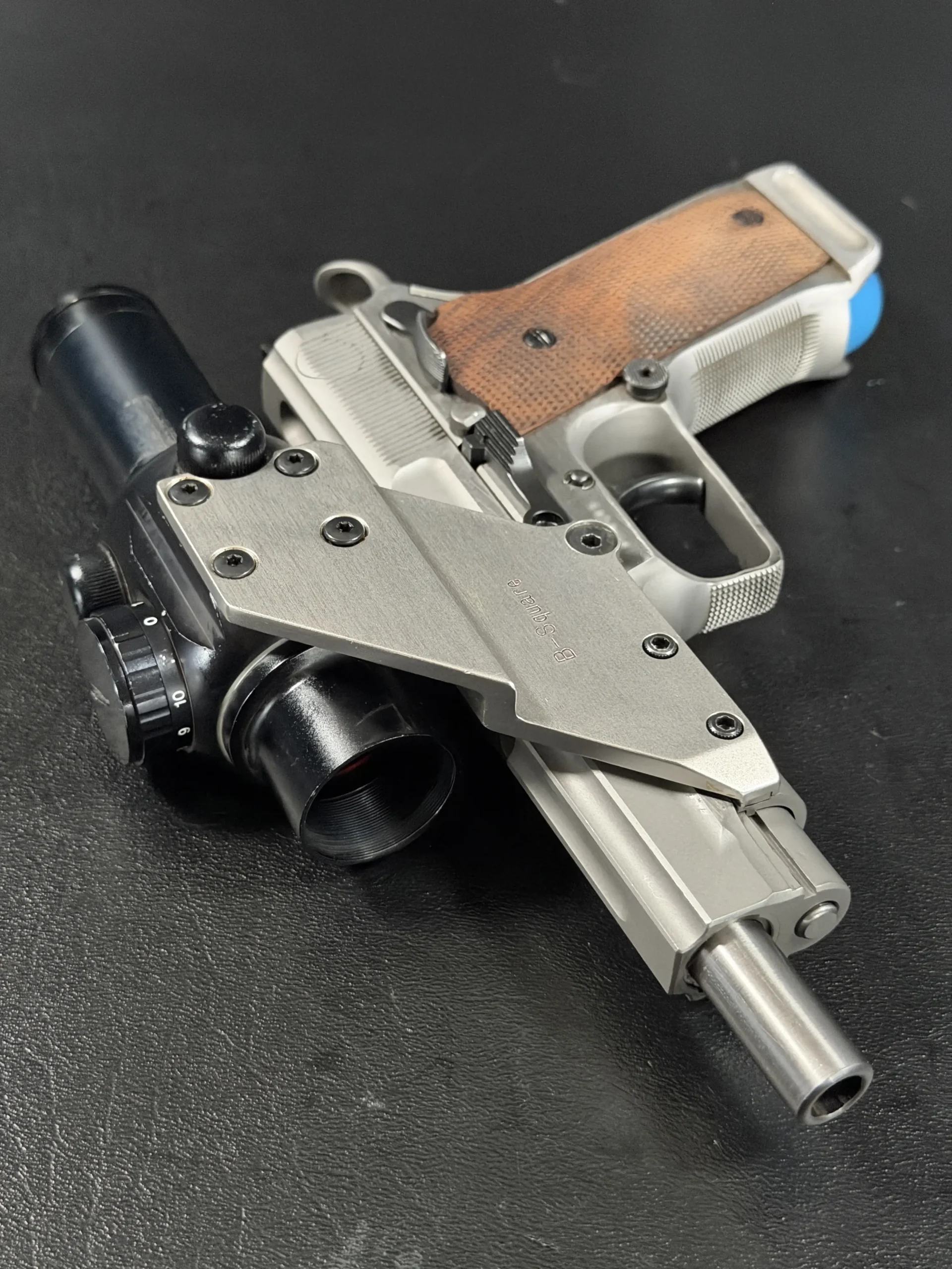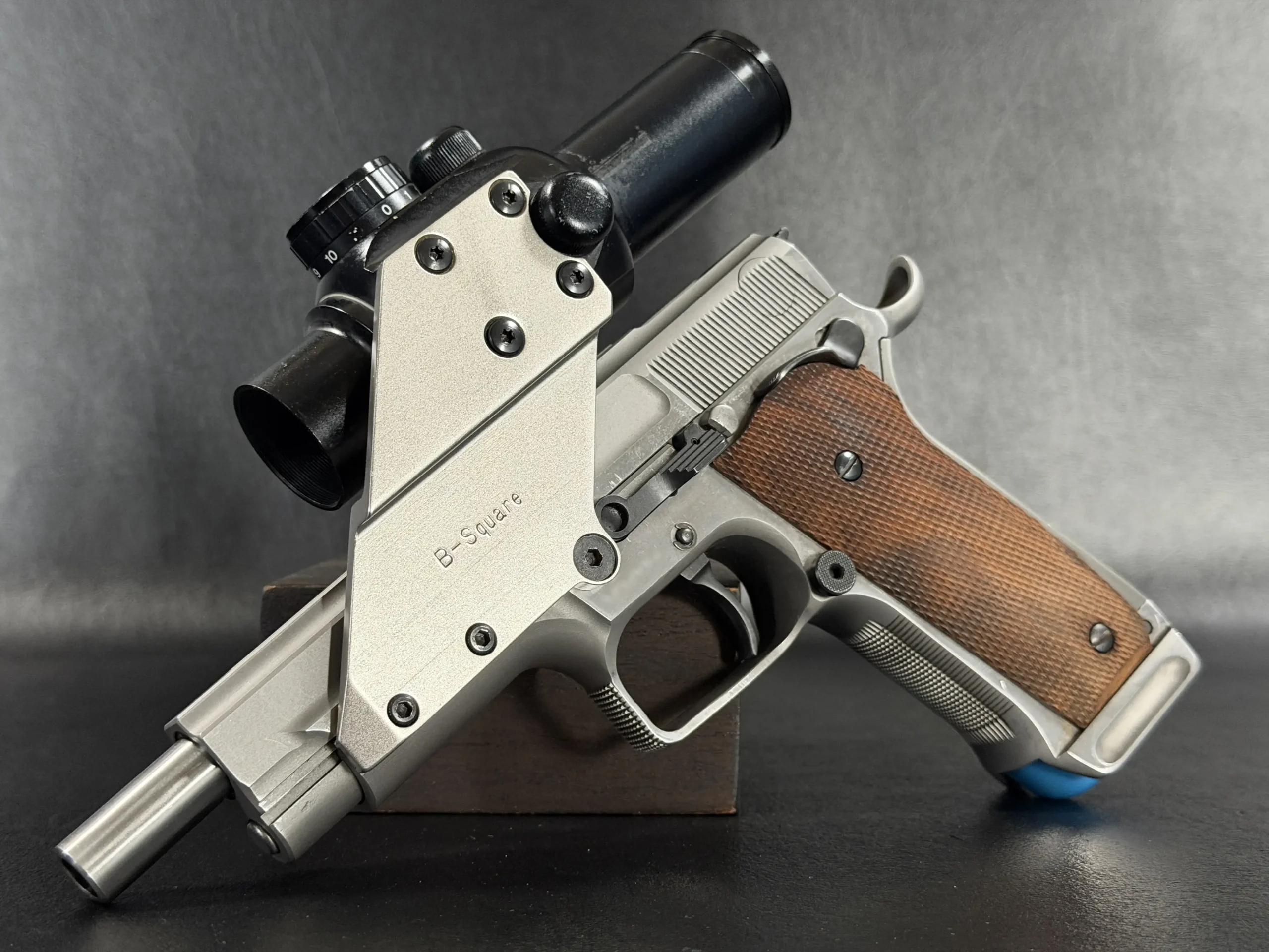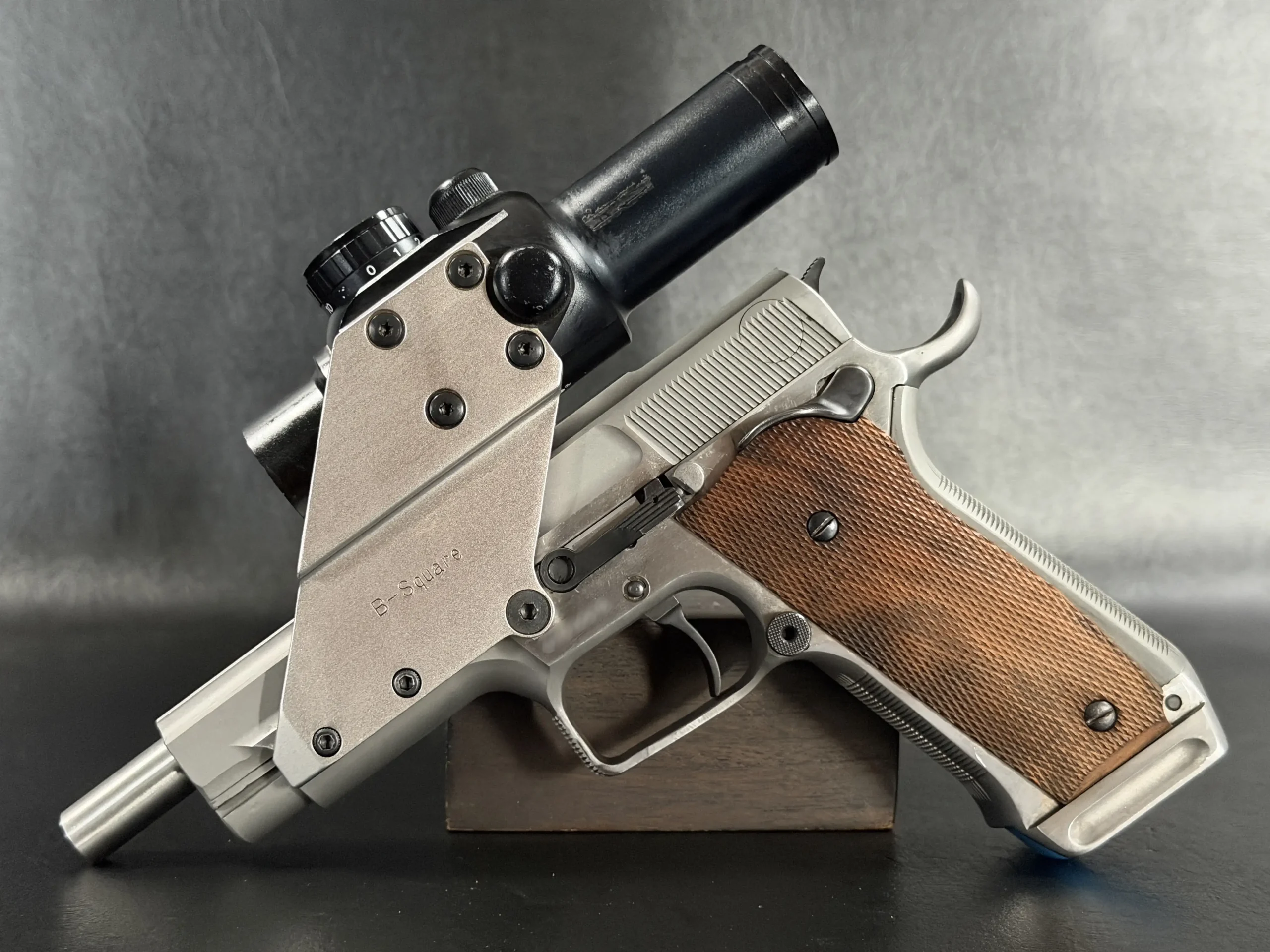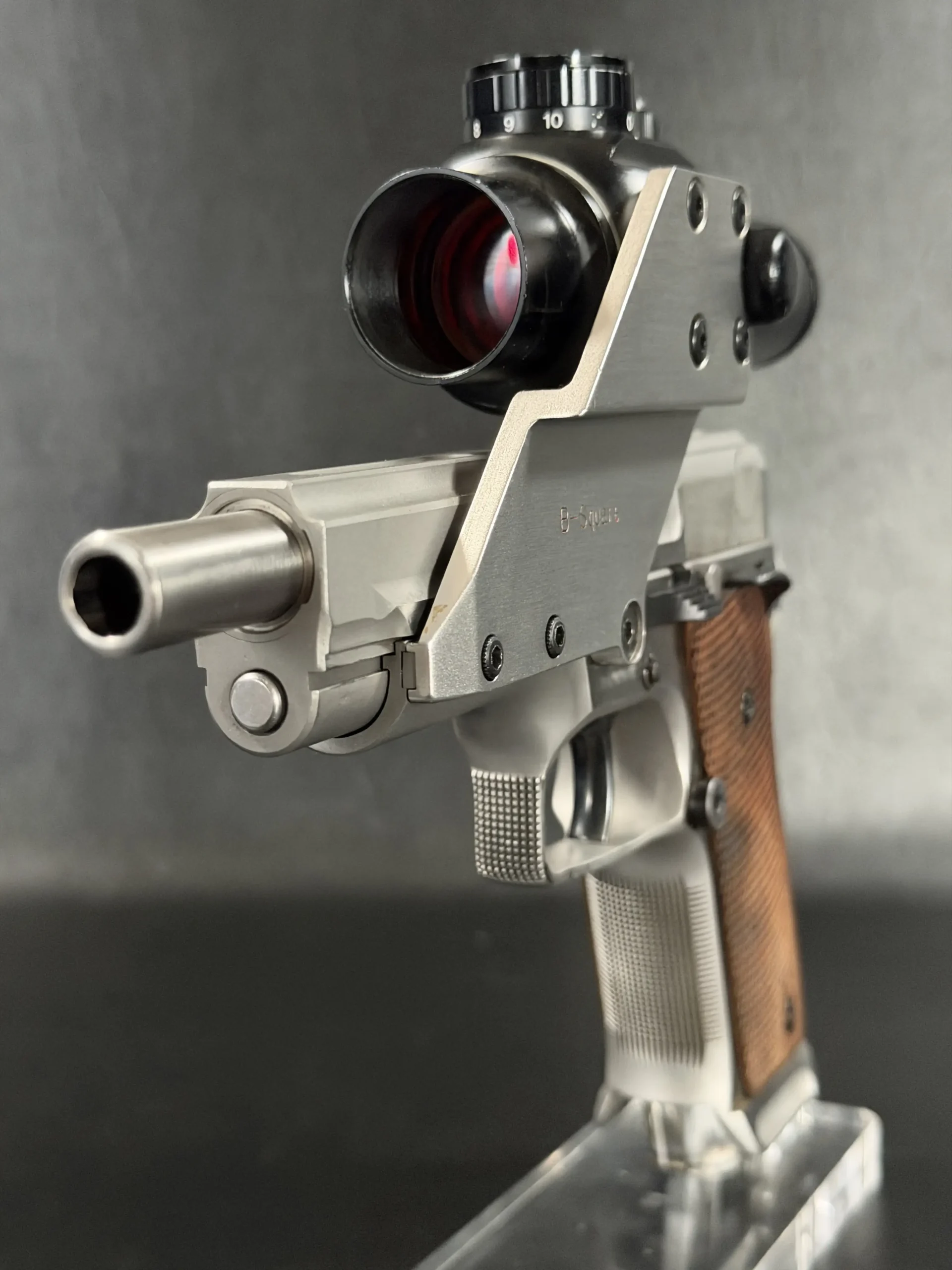Visually, the pistol features classic competition styling from the early 1990s. The stainless steel construction contrasts beautifully with the checkered wooden grip panels, while the mounted optic and custom bracket evoke the golden era of experimental competition handgun design. The B-Square mount itself represents a fascinating chapter in competitive shooting history, when manufacturers and shooters were actively experimenting with optical sights and mounting solutions.