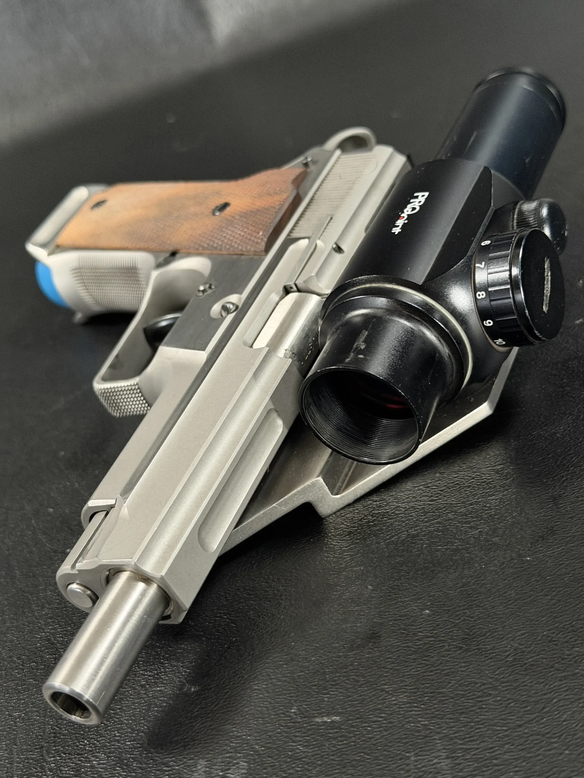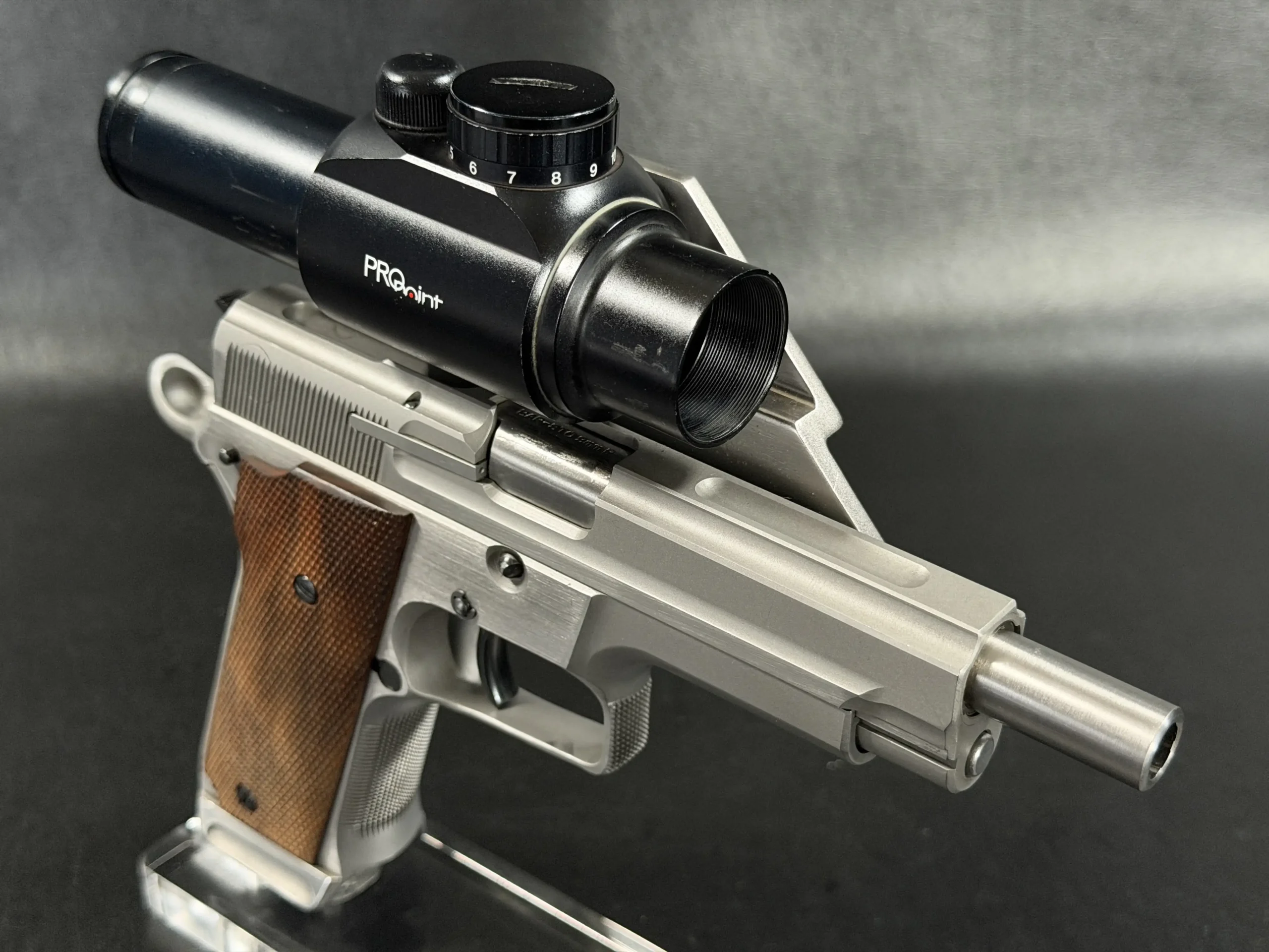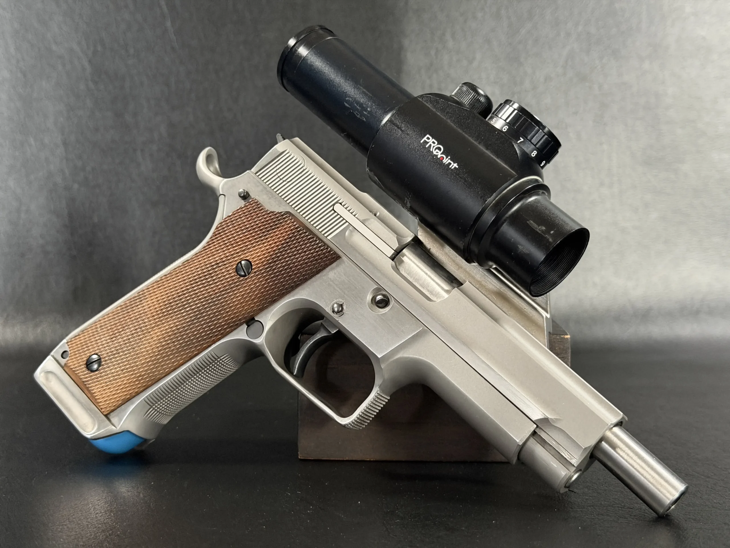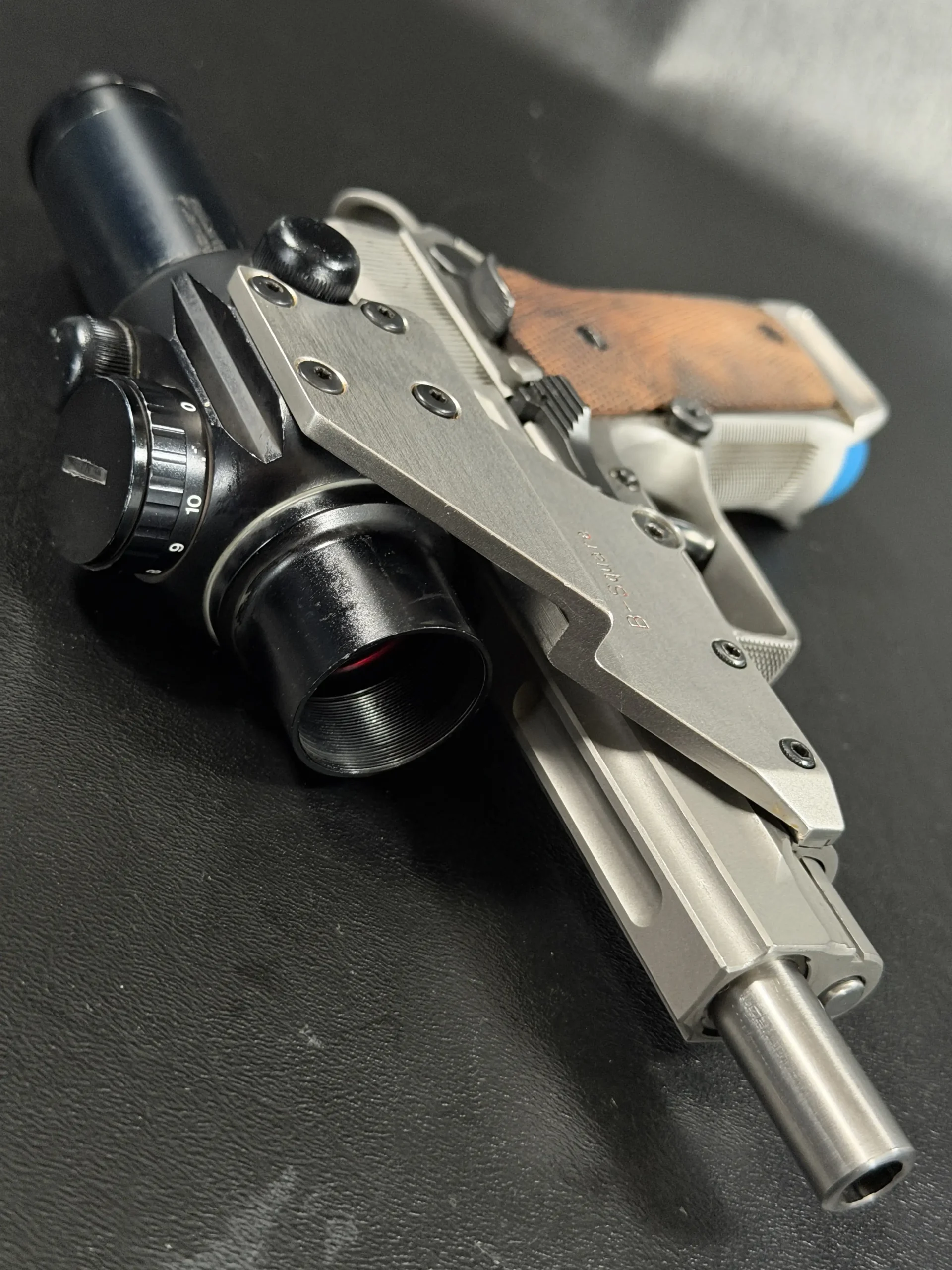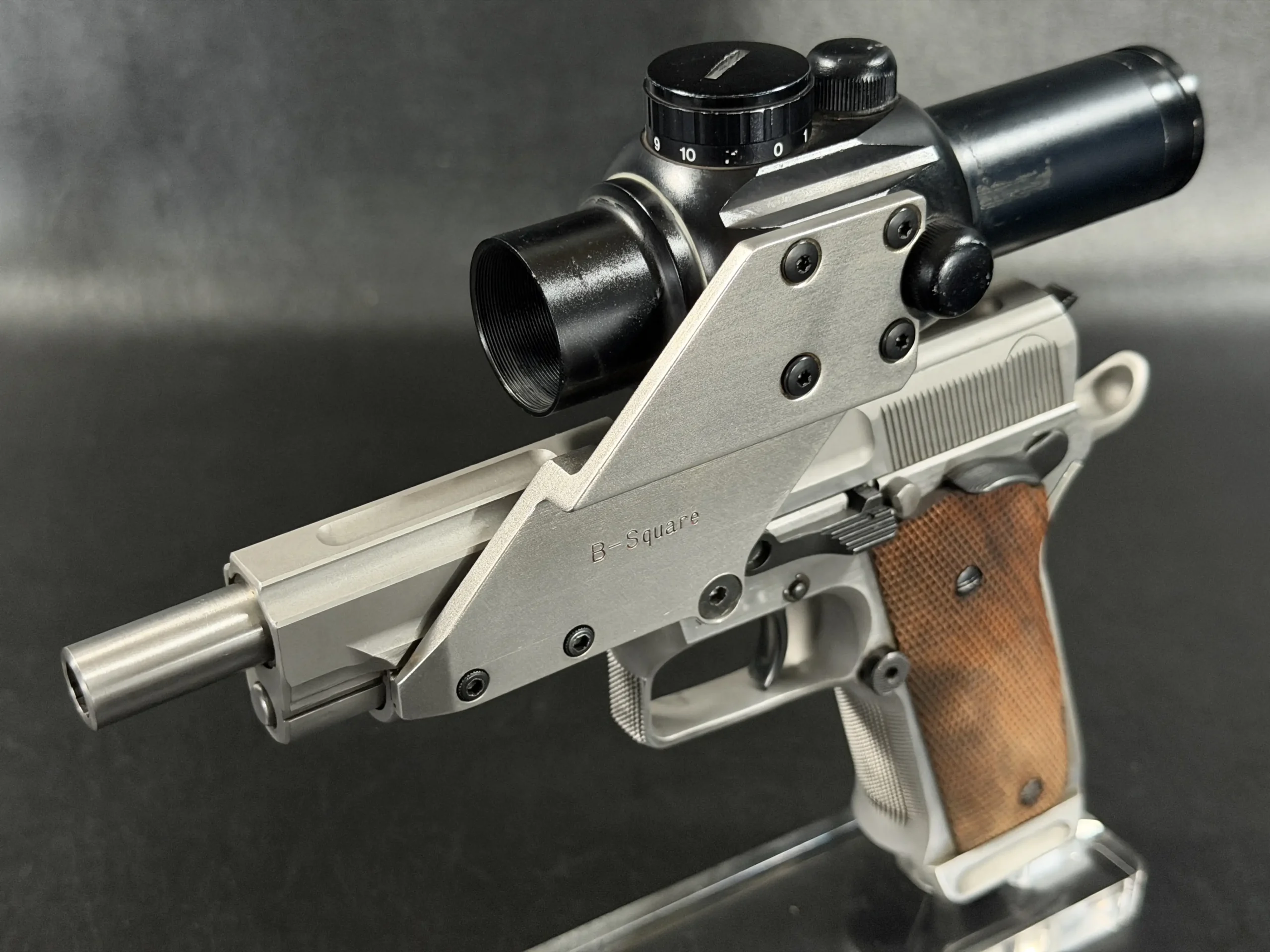 Visually, the pistol features classic competition styling from the early 1990s. The stainless steel construction contrasts beautifully with the checkered wooden grip panels, while the mounted optic and custom bracket evoke the golden era of experimental competition handgun design. The B-Square mount itself represents a fascinating chapter in competitive shooting history, when manufacturers and shooters were actively experimenting with optical sights and mounting solutions.