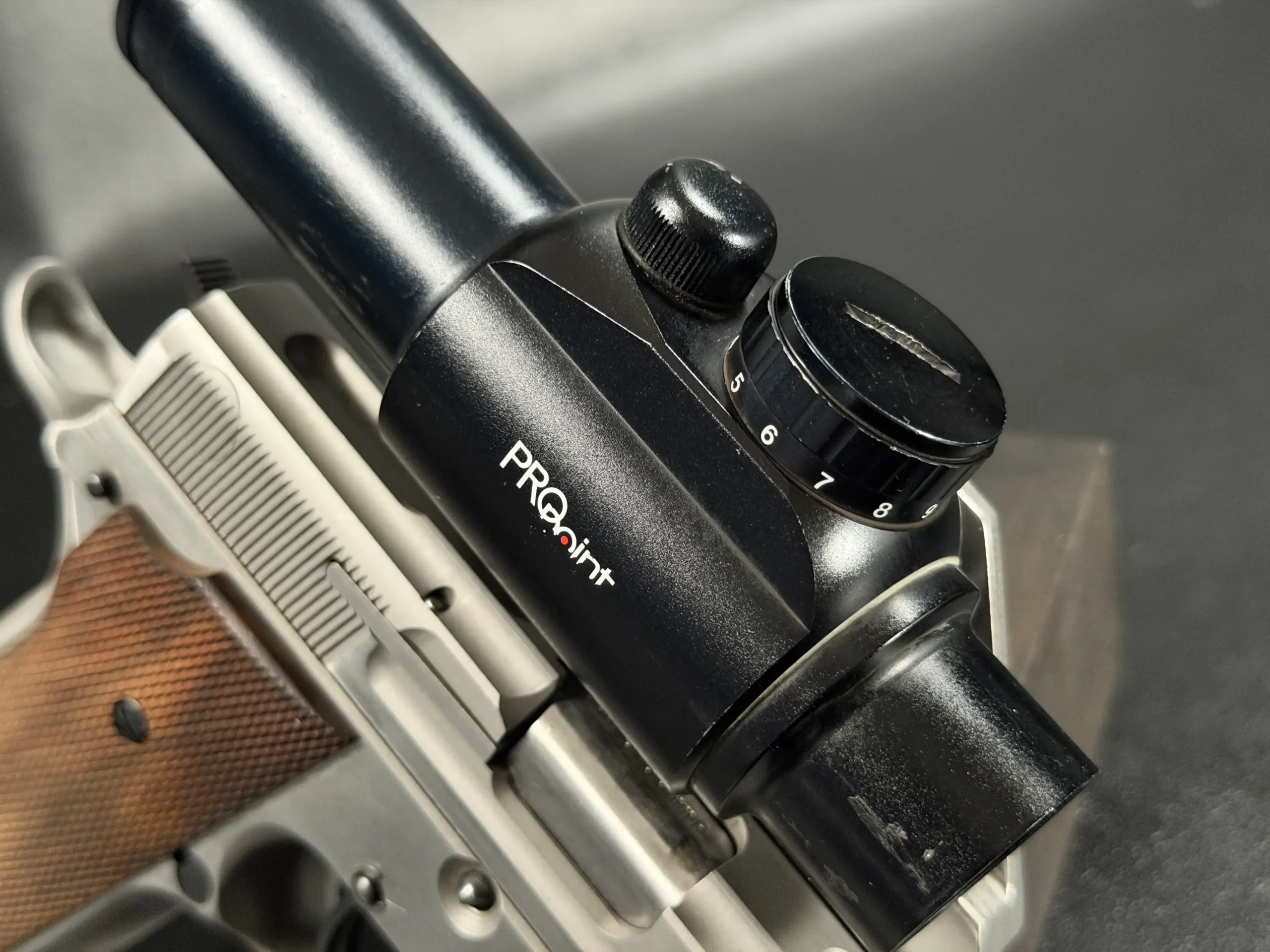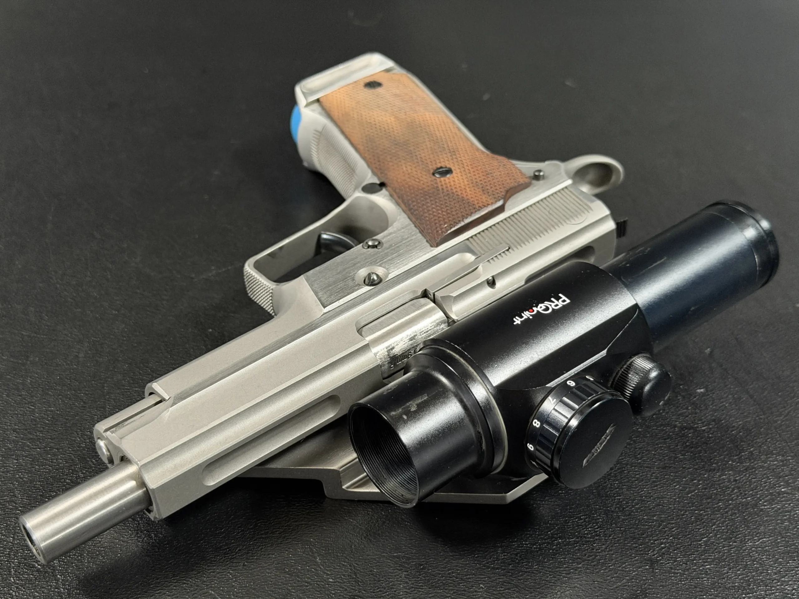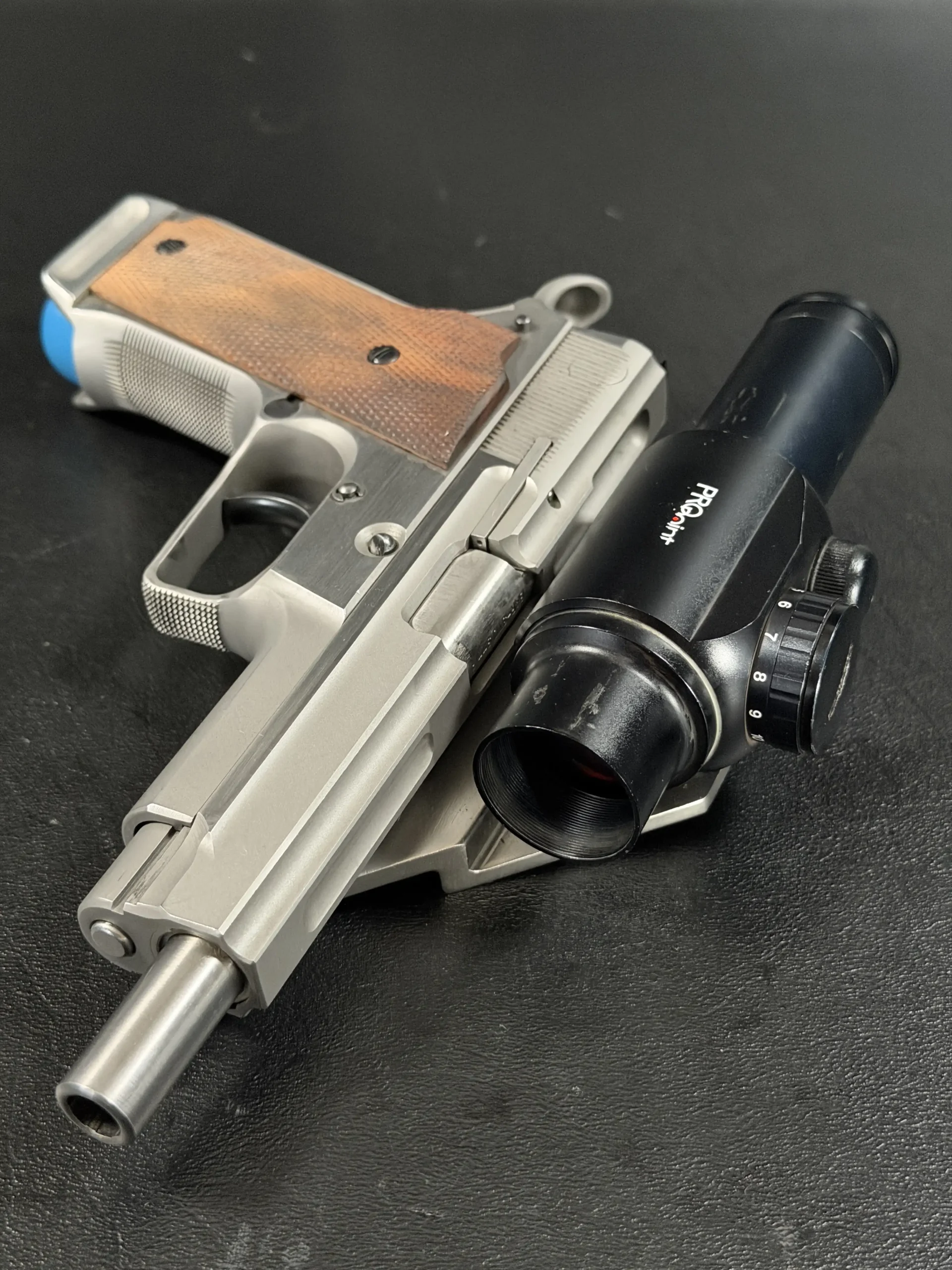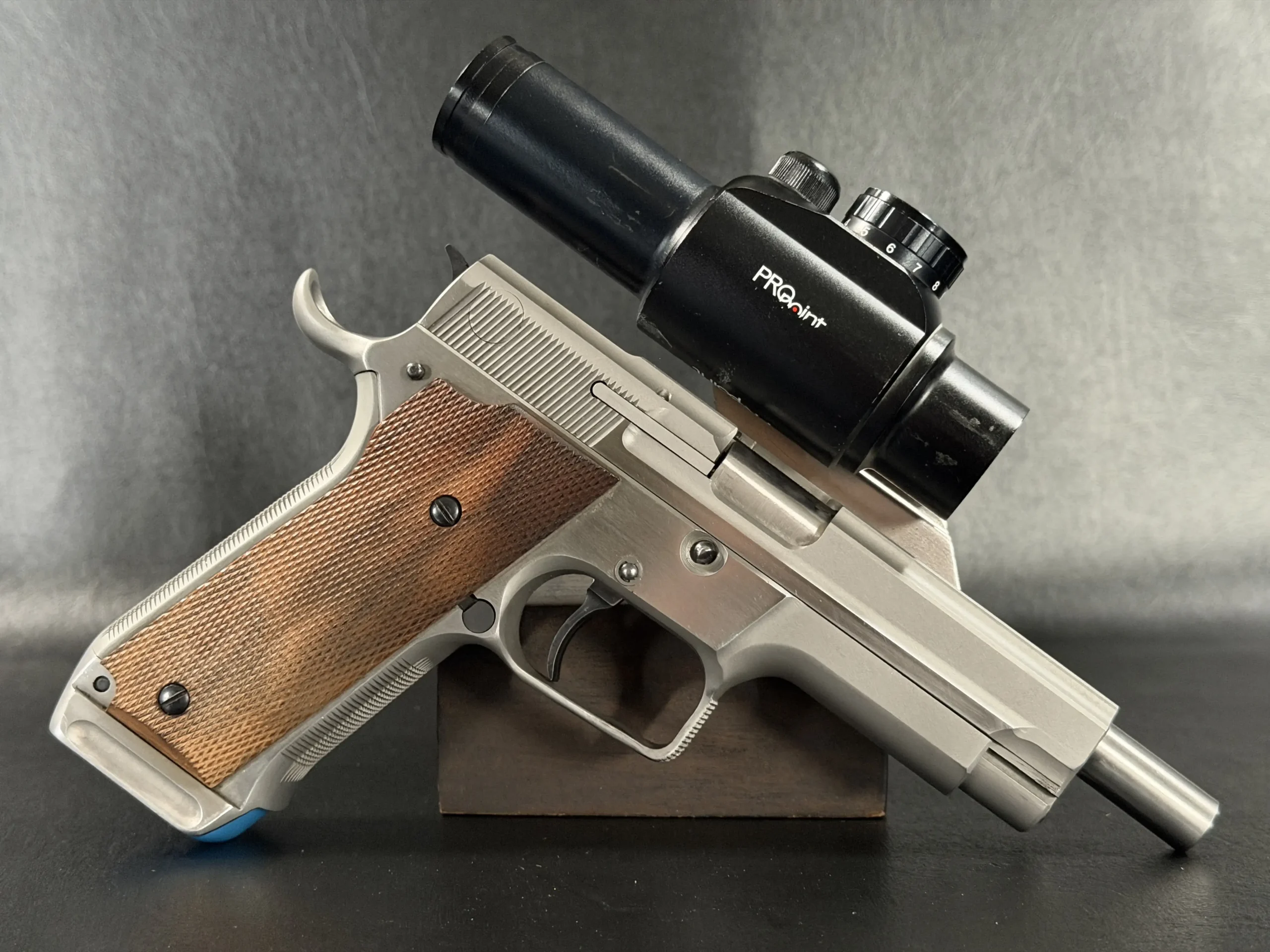 Visually, the pistol features classic competition styling from the early 1990s. The stainless steel construction contrasts beautifully with the checkered wooden grip panels, while the mounted optic and custom bracket evoke the golden era of experimental competition handgun design. The B-Square mount itself represents a fascinating chapter in competitive shooting history, when manufacturers and shooters were actively experimenting with optical sights and mounting solutions.