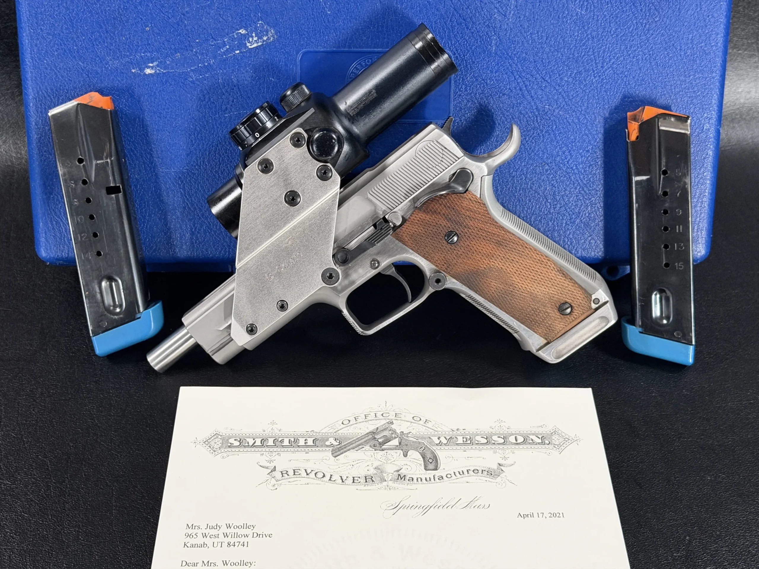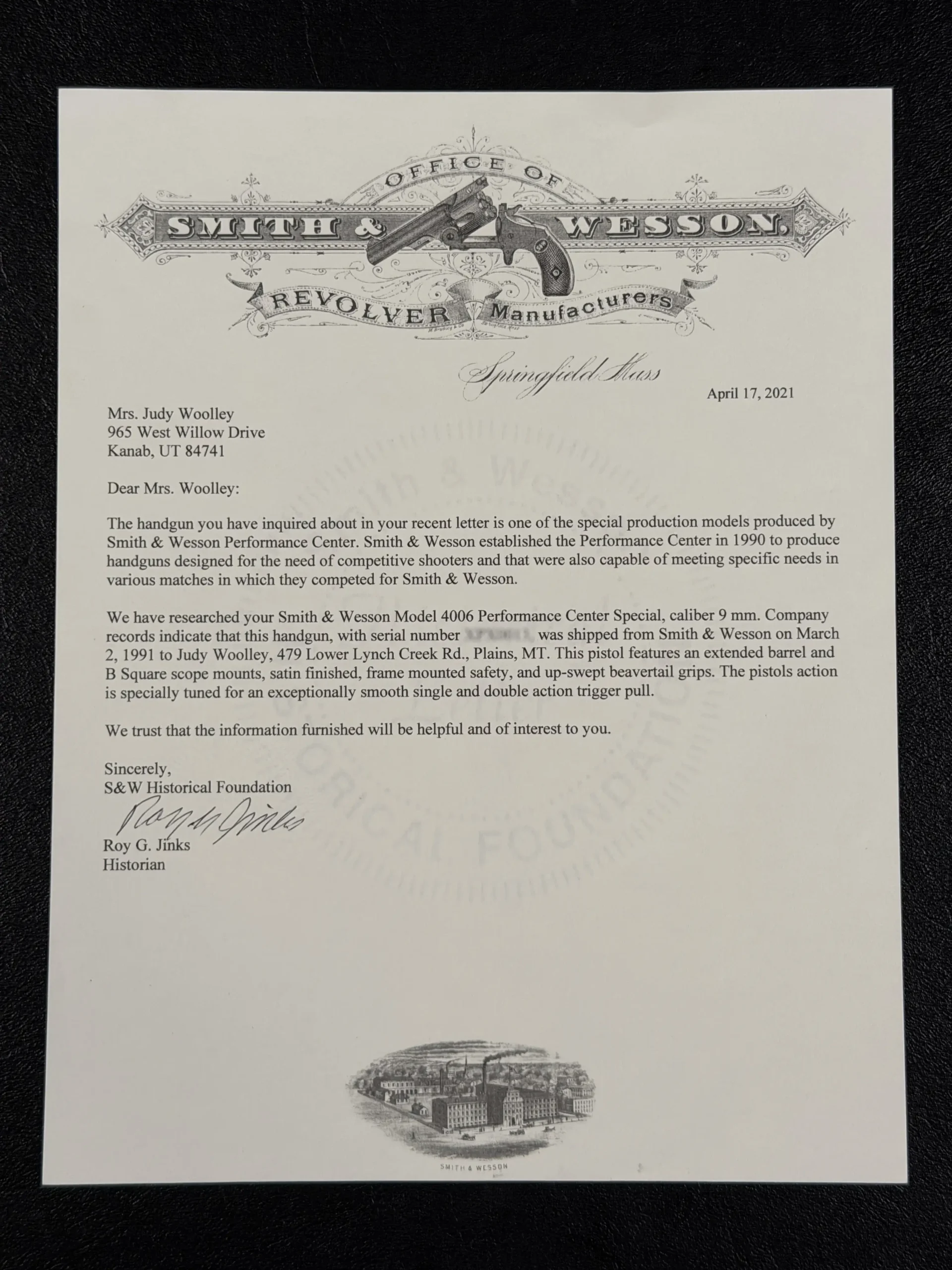 Equally important is the pistol’s historical documentation. Accompanying the firearm is a letter from the Smith & Wesson Historical Foundation, signed by historian Roy Jinks, confirming its identity as a Smith & Wesson Model 4006 Performance Center Special and documenting its shipment directly to Judy Woolley in 1991. Documentation of this nature significantly enhances both the historical interest and collector value of the piece.