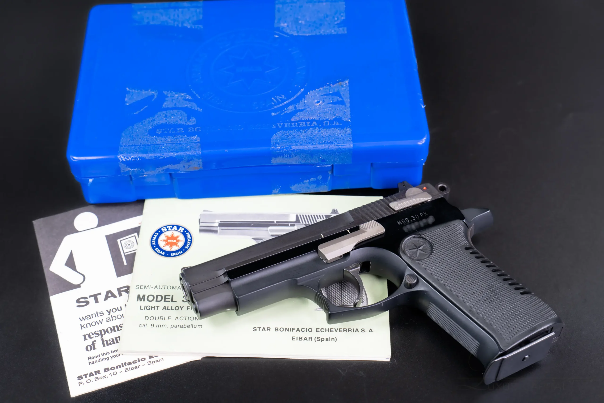 The pistol itself carries a refined, purposeful presence. The matte black finish contrasts cleanly with the satin-finished controls, while the sharply checkered grip panels, complete with the iconic Star medallions, offer both visual balance and practical handling. Its ergonomic frame, double-action trigger system, and slide-mounted safety speak to the evolution of late-20th-century service pistols, yet it still retains a distinctly European character in its lines and proportions.
