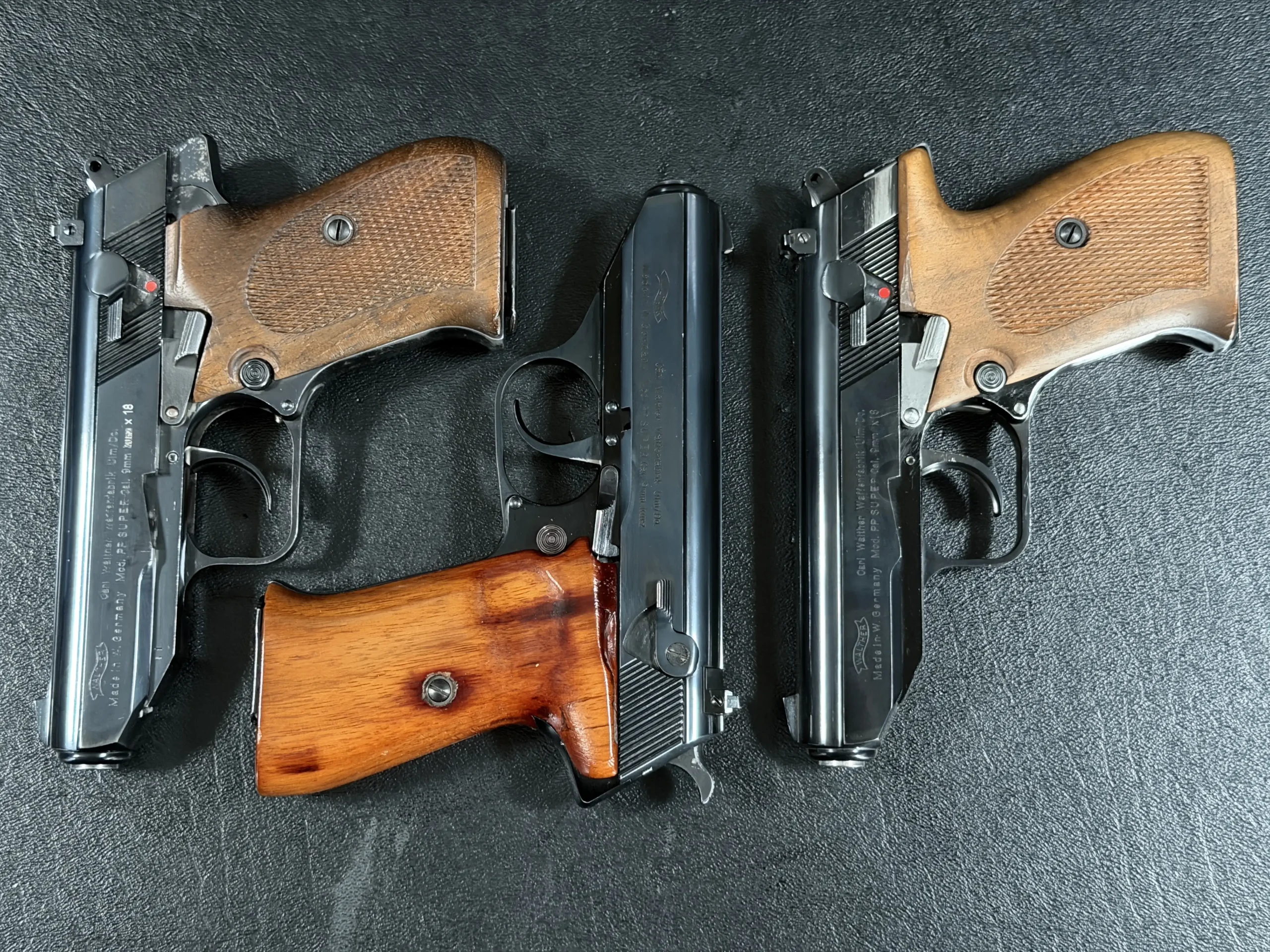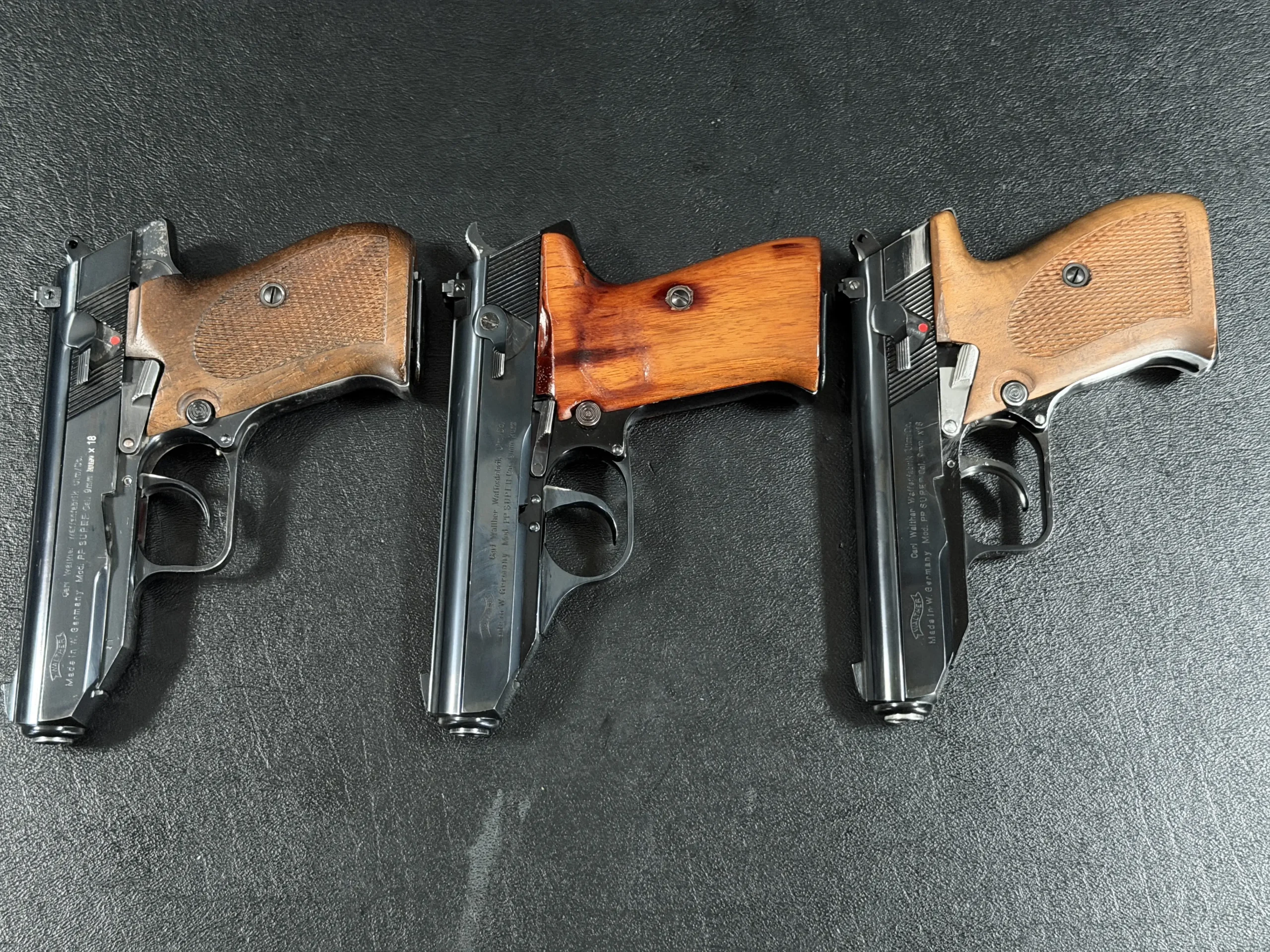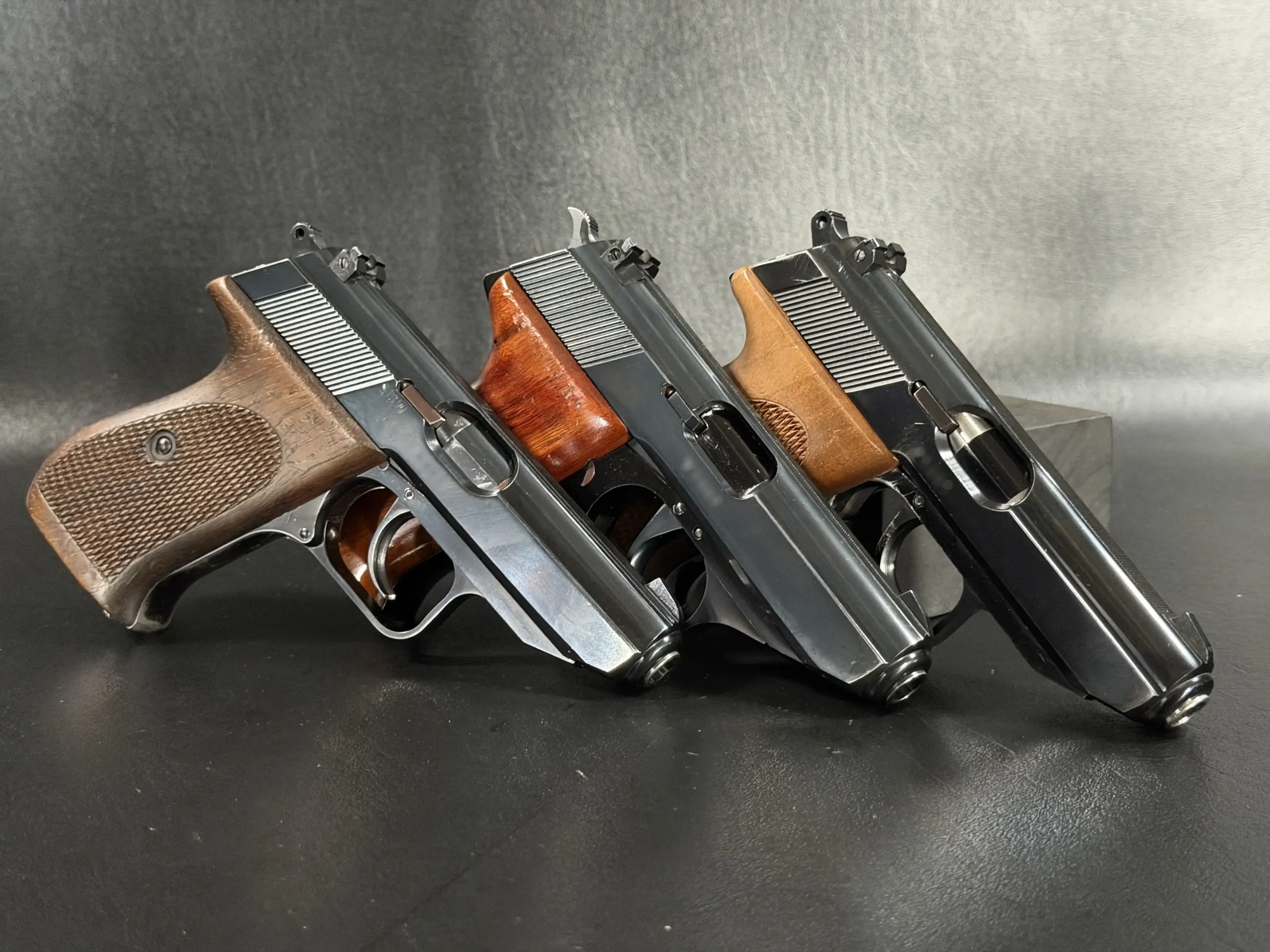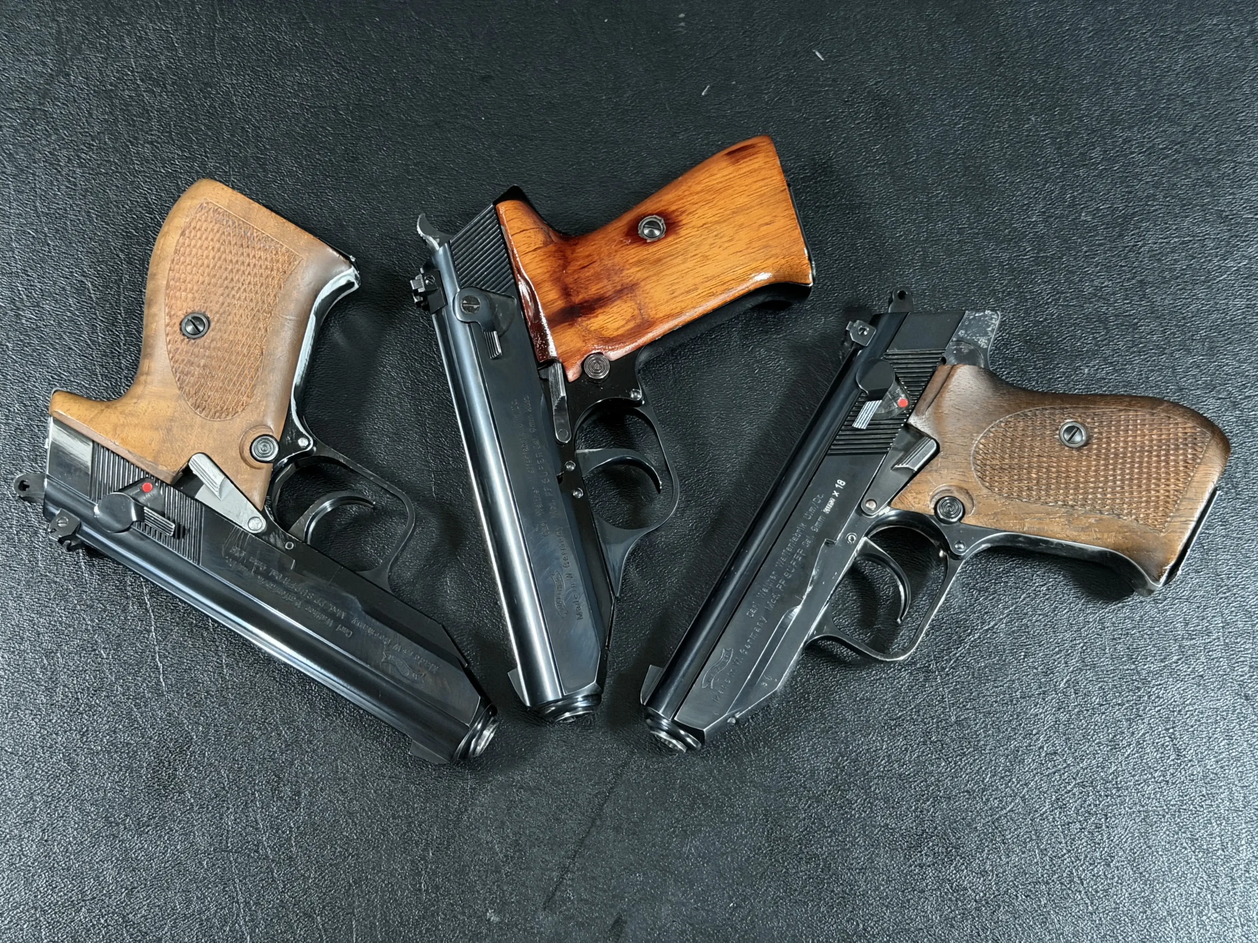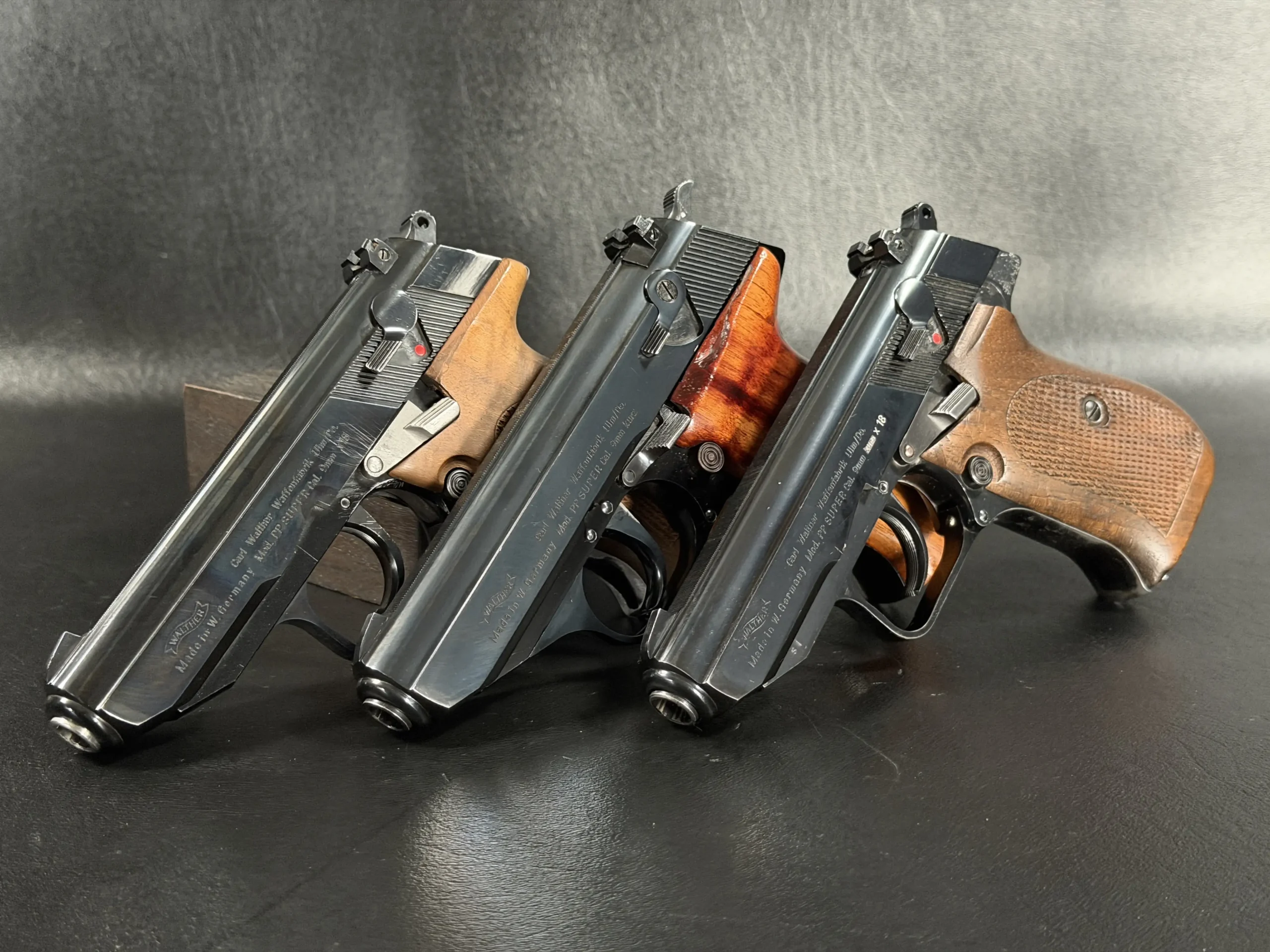 Externally, the pistols exhibit classic Walther styling with finely machined slides and beautifully contoured grips. Two of the examples wear traditional checkered brown grips, while the third features distinctive smooth wooden panels, giving each prototype a unique visual identity within the group. The finish and machining reflect the precision craftsmanship associated with Walther’s Ulm factory during the era.
