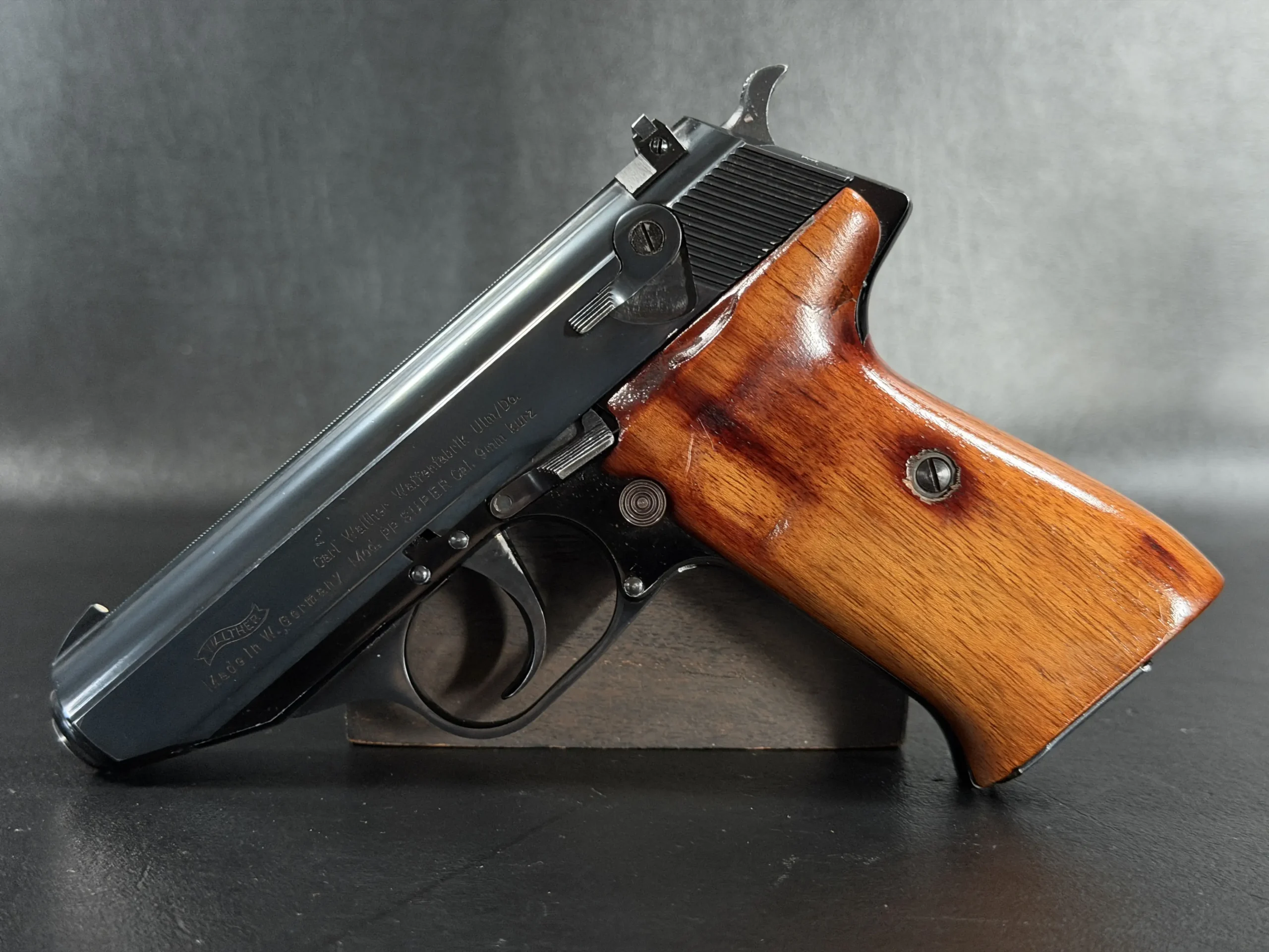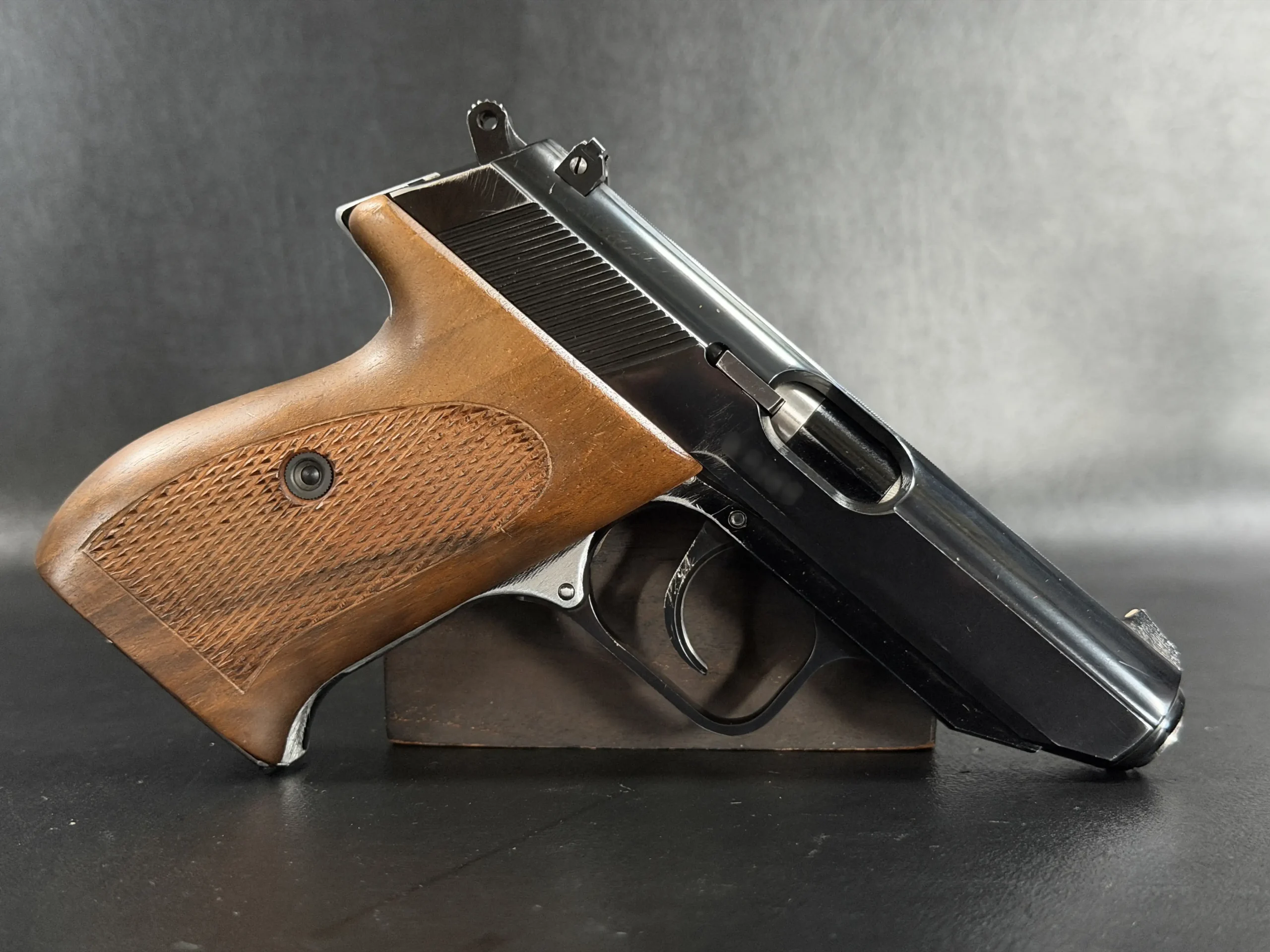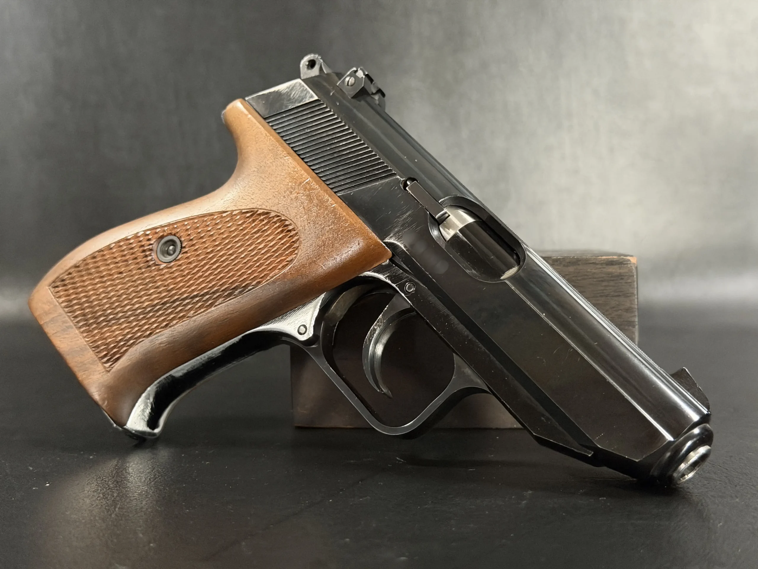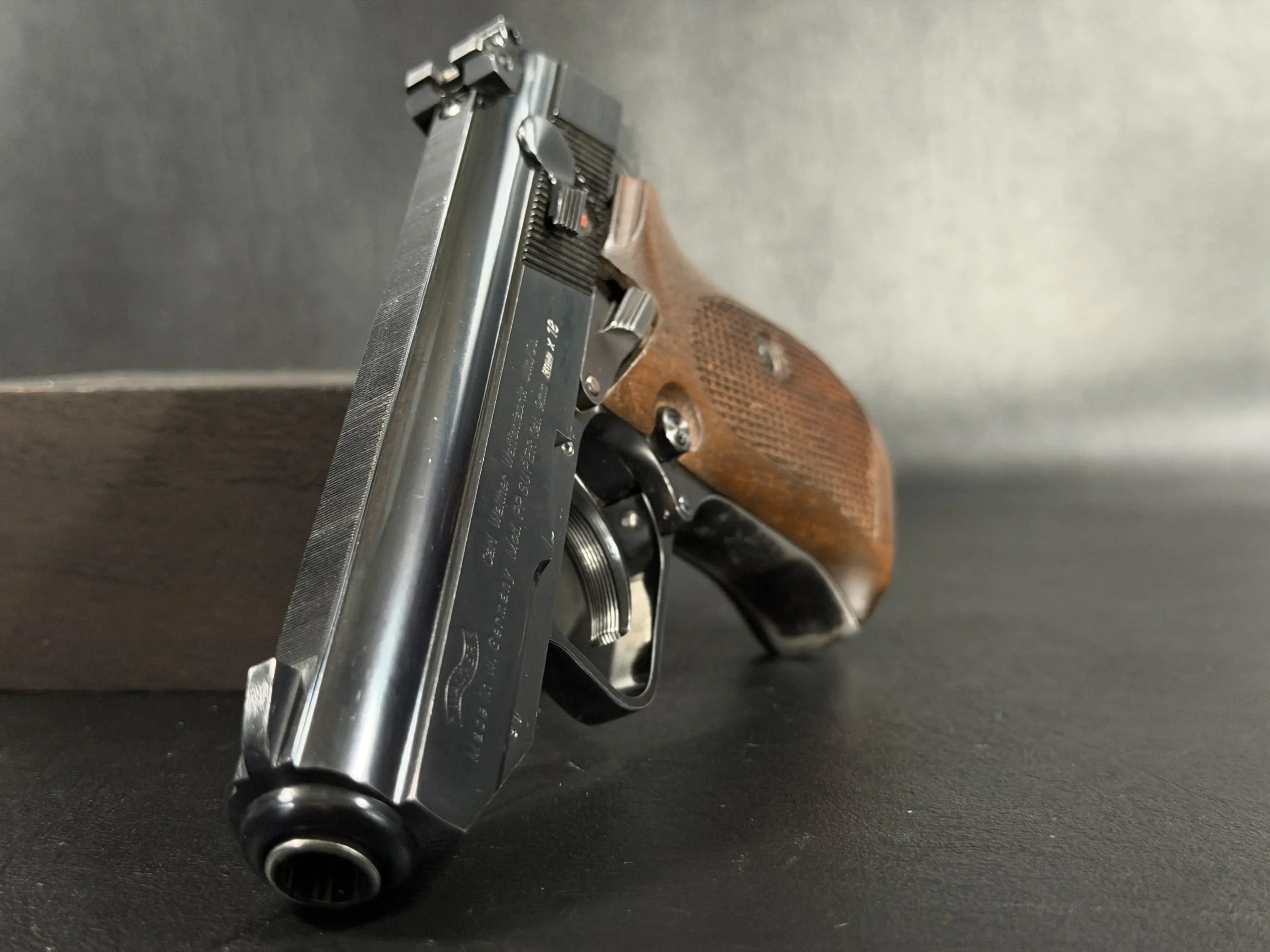 Externally, the pistols exhibit classic Walther styling with finely machined slides and beautifully contoured grips. Two of the examples wear traditional checkered brown grips, while the third features distinctive smooth wooden panels, giving each prototype a unique visual identity within the group. The finish and machining reflect the precision craftsmanship associated with Walther’s Ulm factory during the era.
