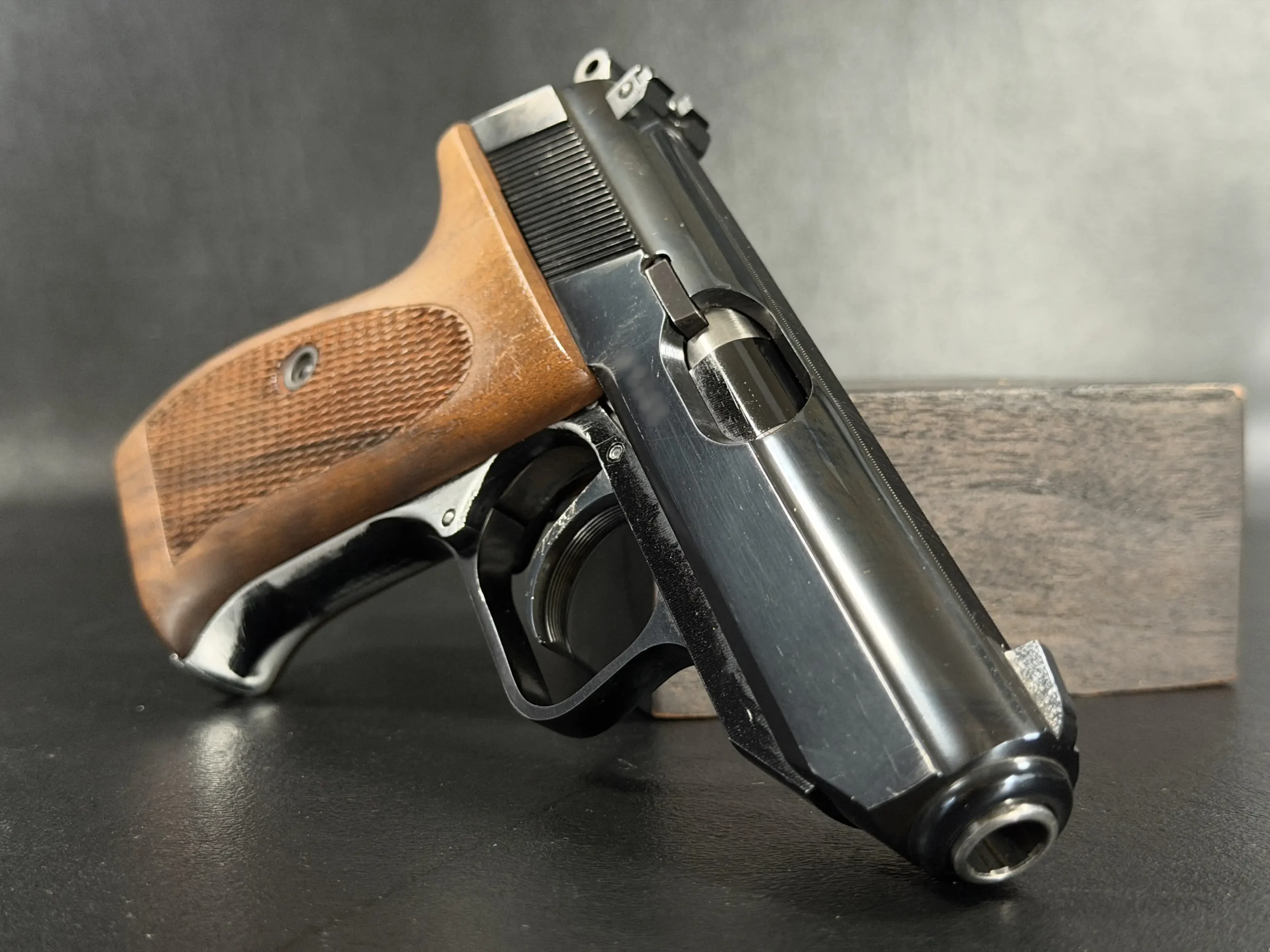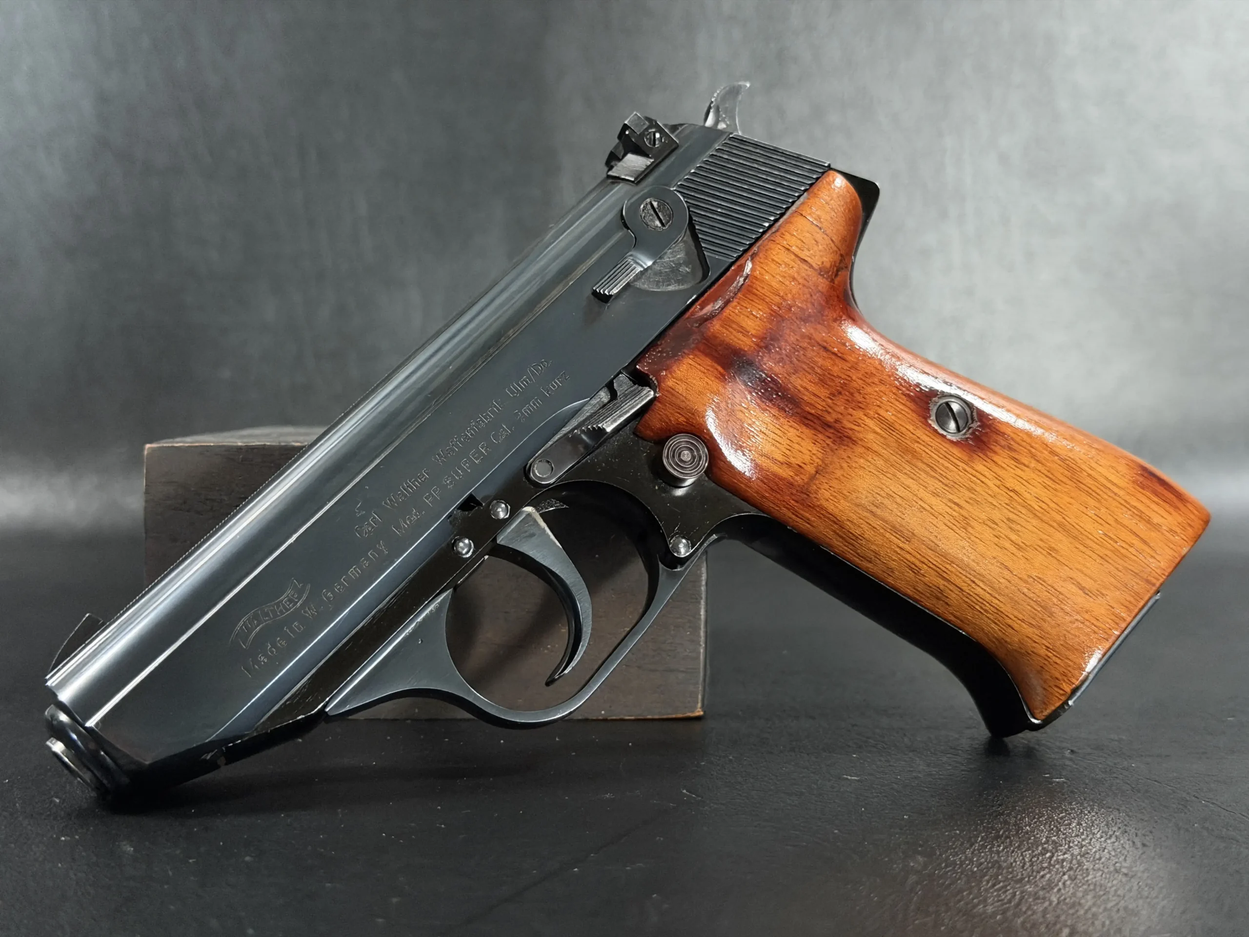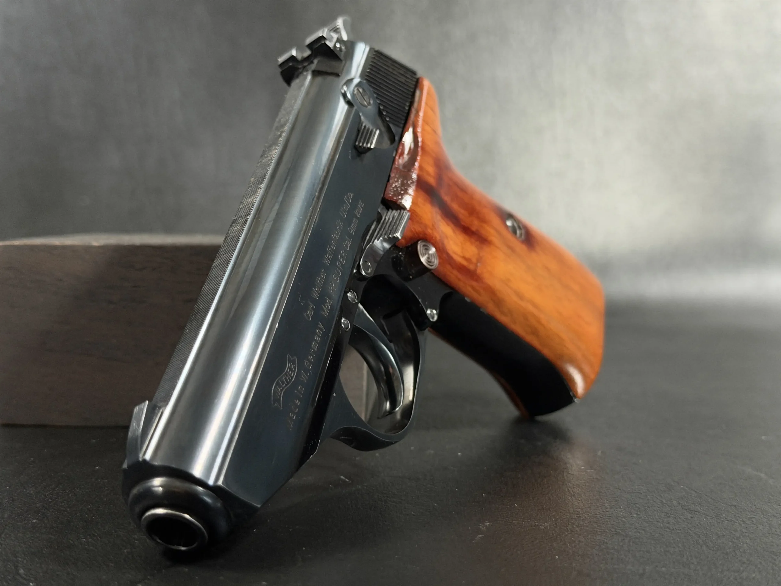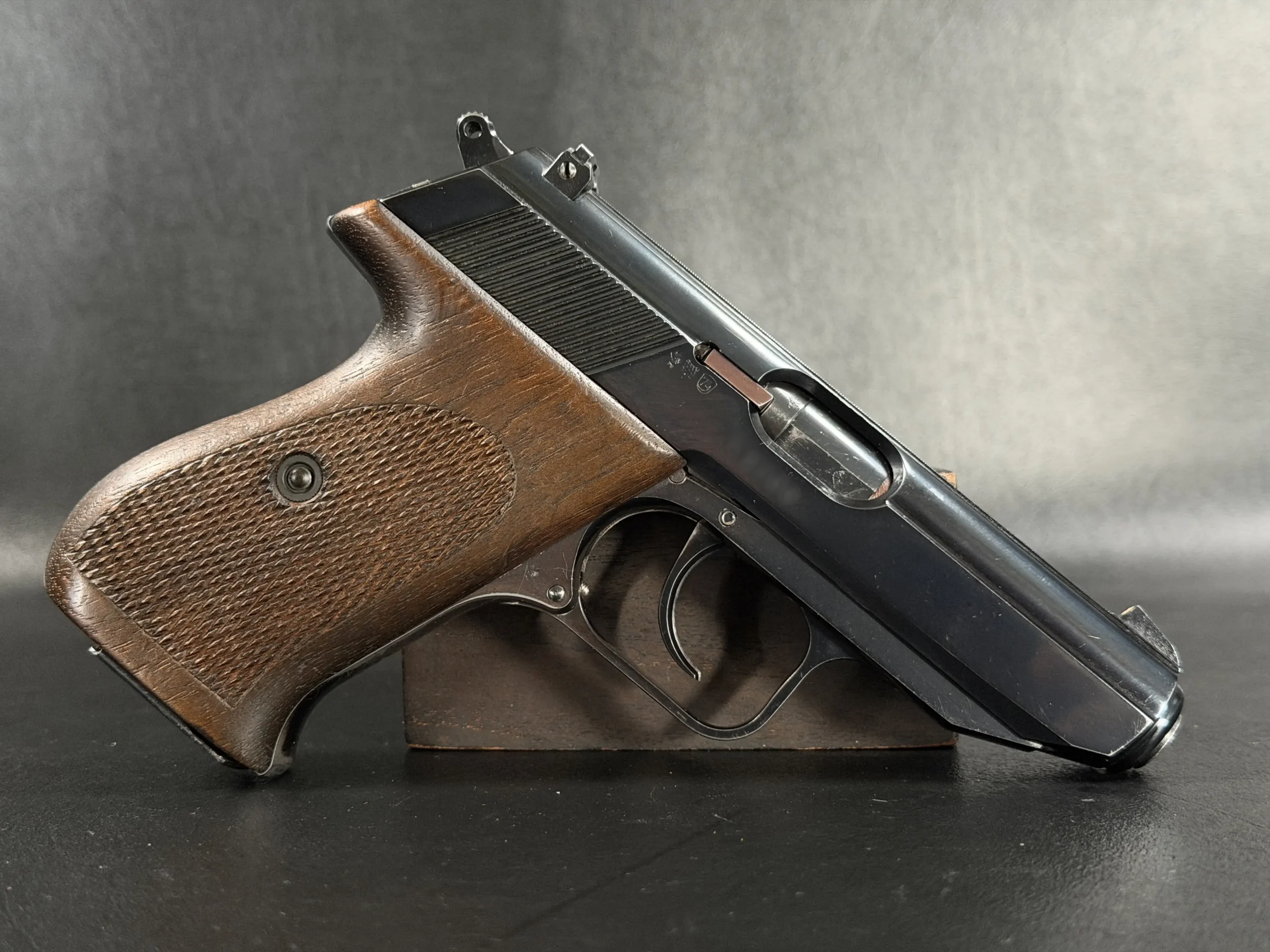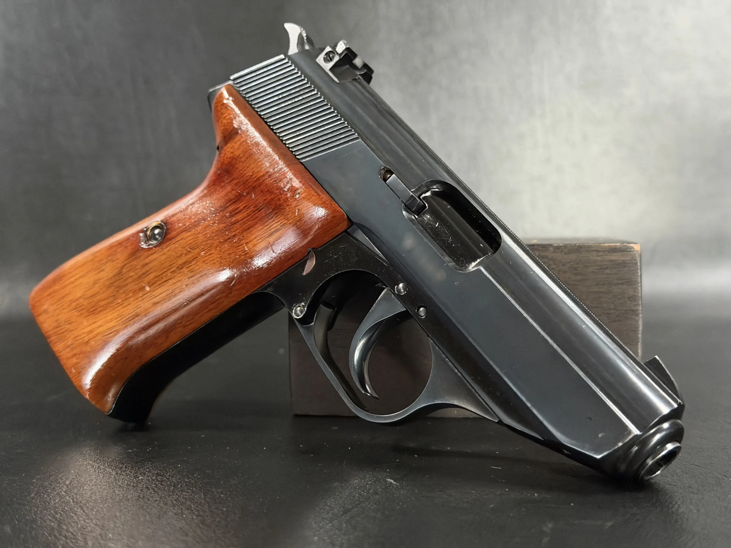 Externally, the pistols exhibit classic Walther styling with finely machined slides and beautifully contoured grips. Two of the examples wear traditional checkered brown grips, while the third features distinctive smooth wooden panels, giving each prototype a unique visual identity within the group. The finish and machining reflect the precision craftsmanship associated with Walther’s Ulm factory during the era.