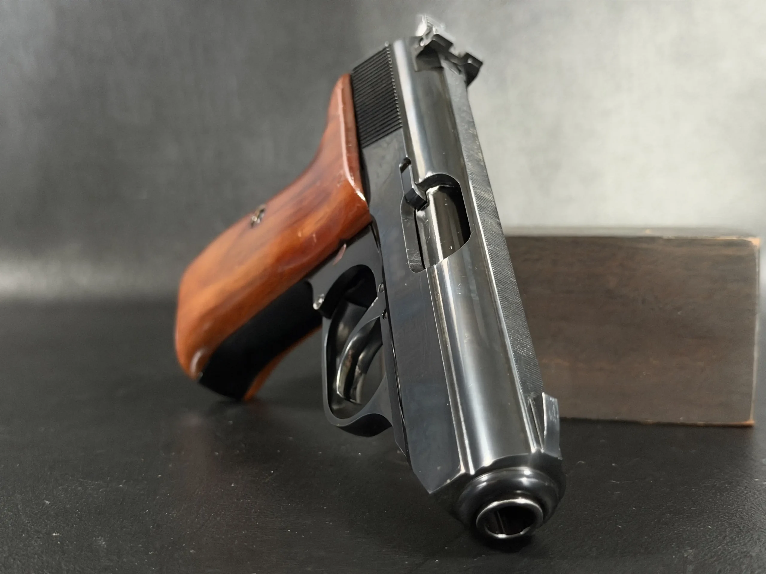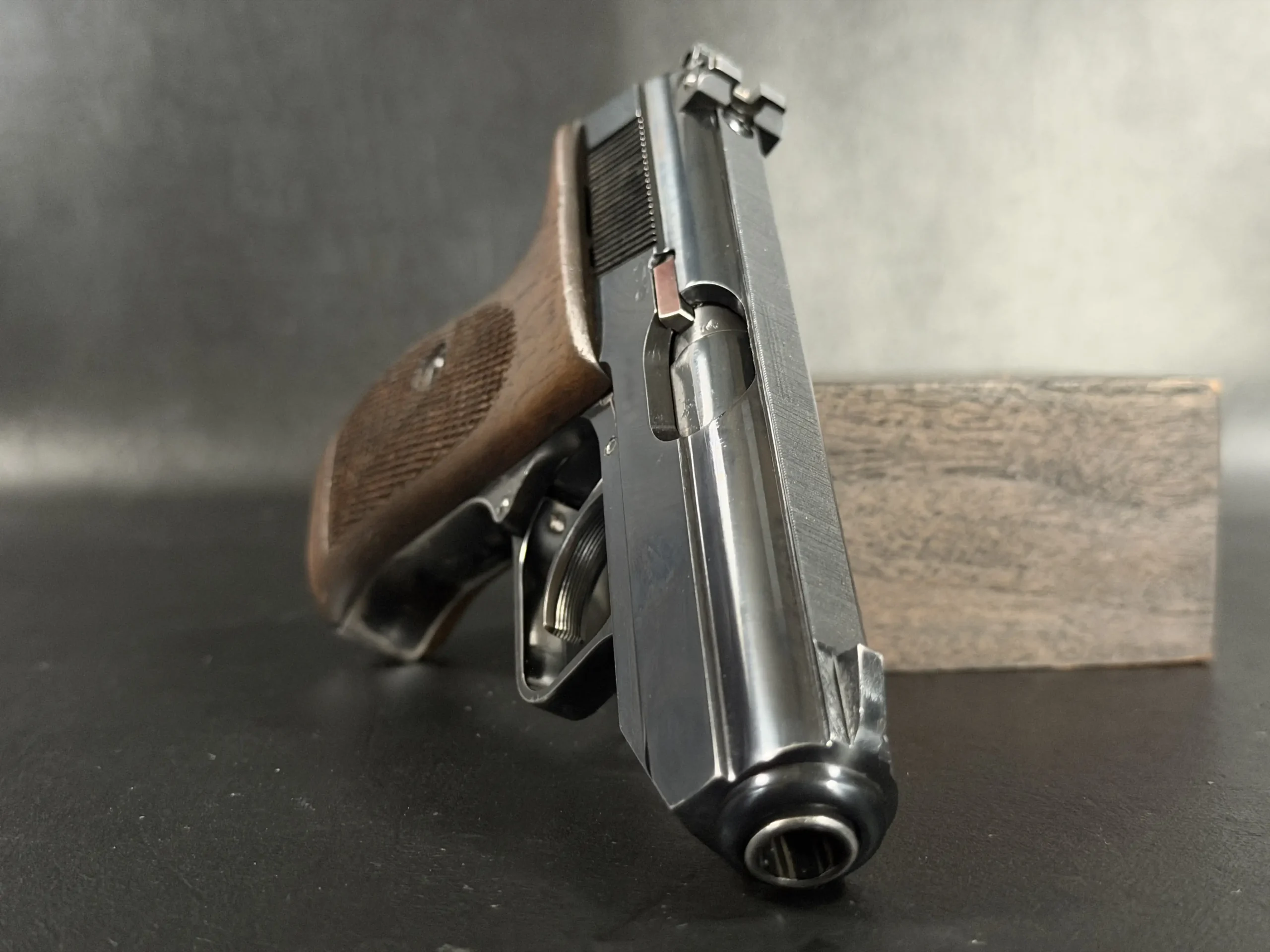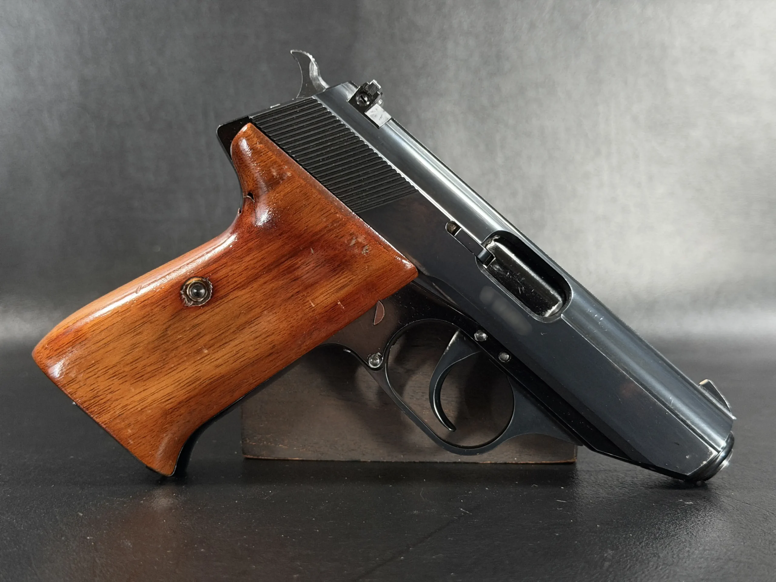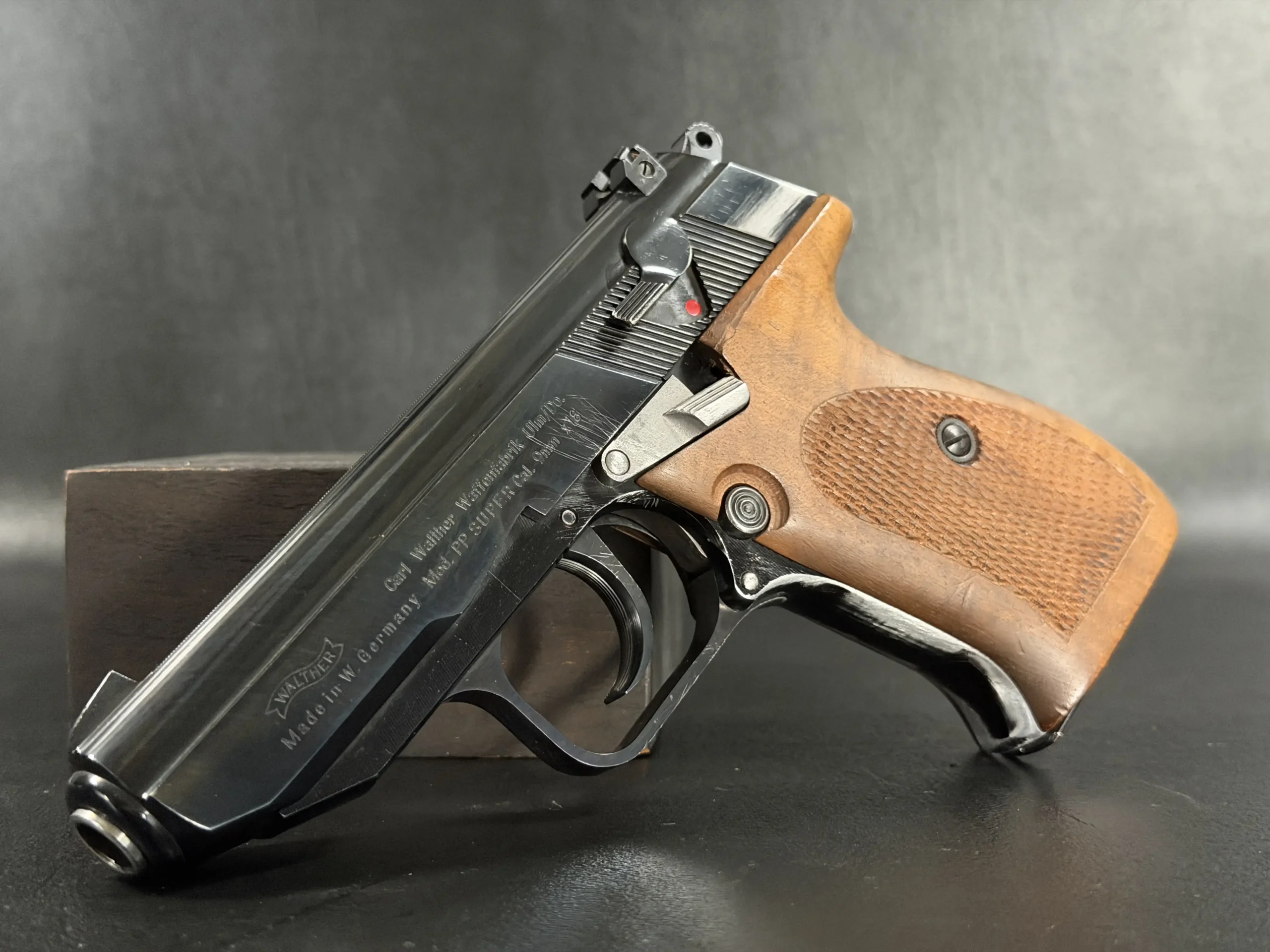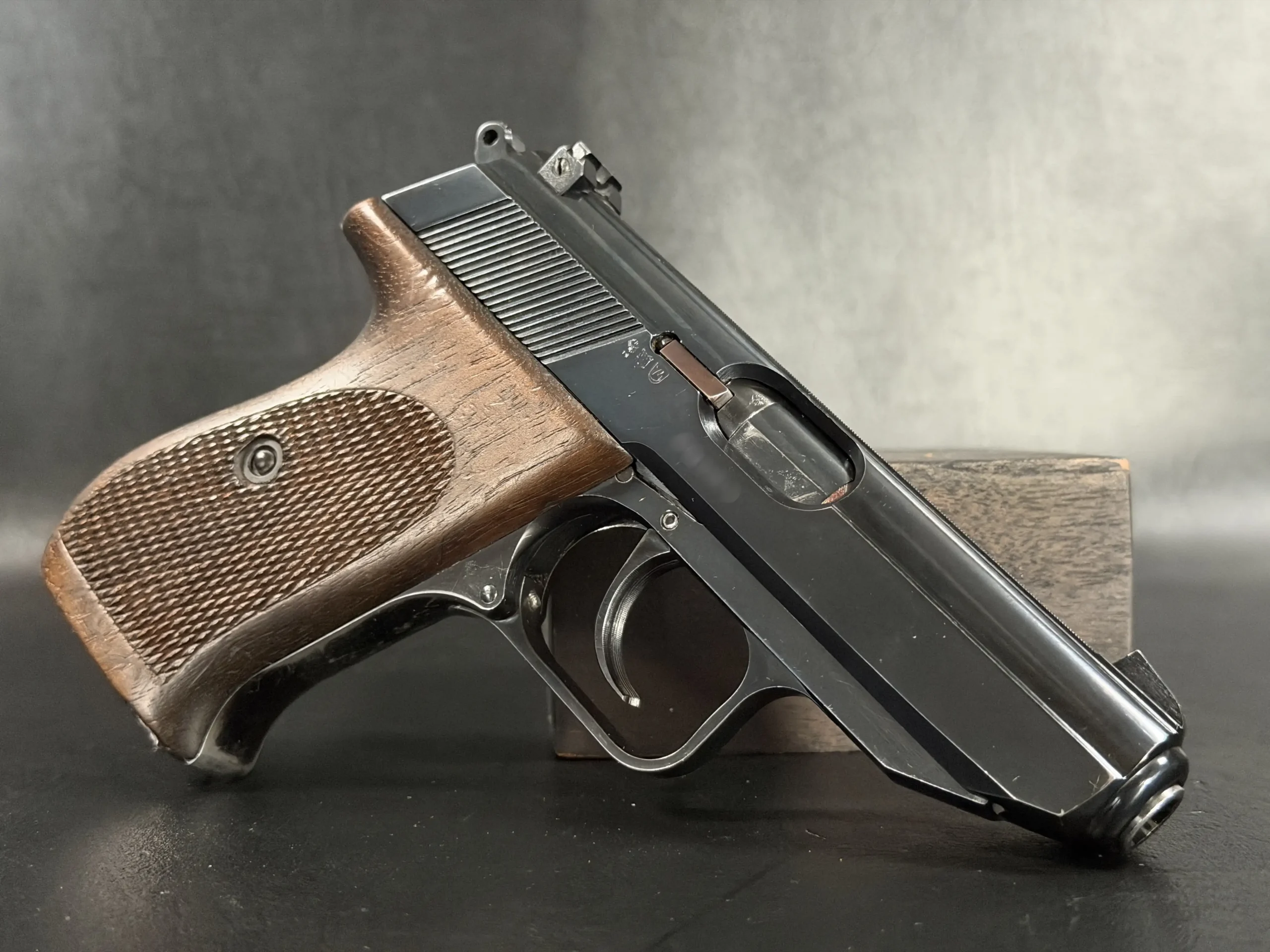 Externally, the pistols exhibit classic Walther styling with finely machined slides and beautifully contoured grips. Two of the examples wear traditional checkered brown grips, while the third features distinctive smooth wooden panels, giving each prototype a unique visual identity within the group. The finish and machining reflect the precision craftsmanship associated with Walther’s Ulm factory during the era.